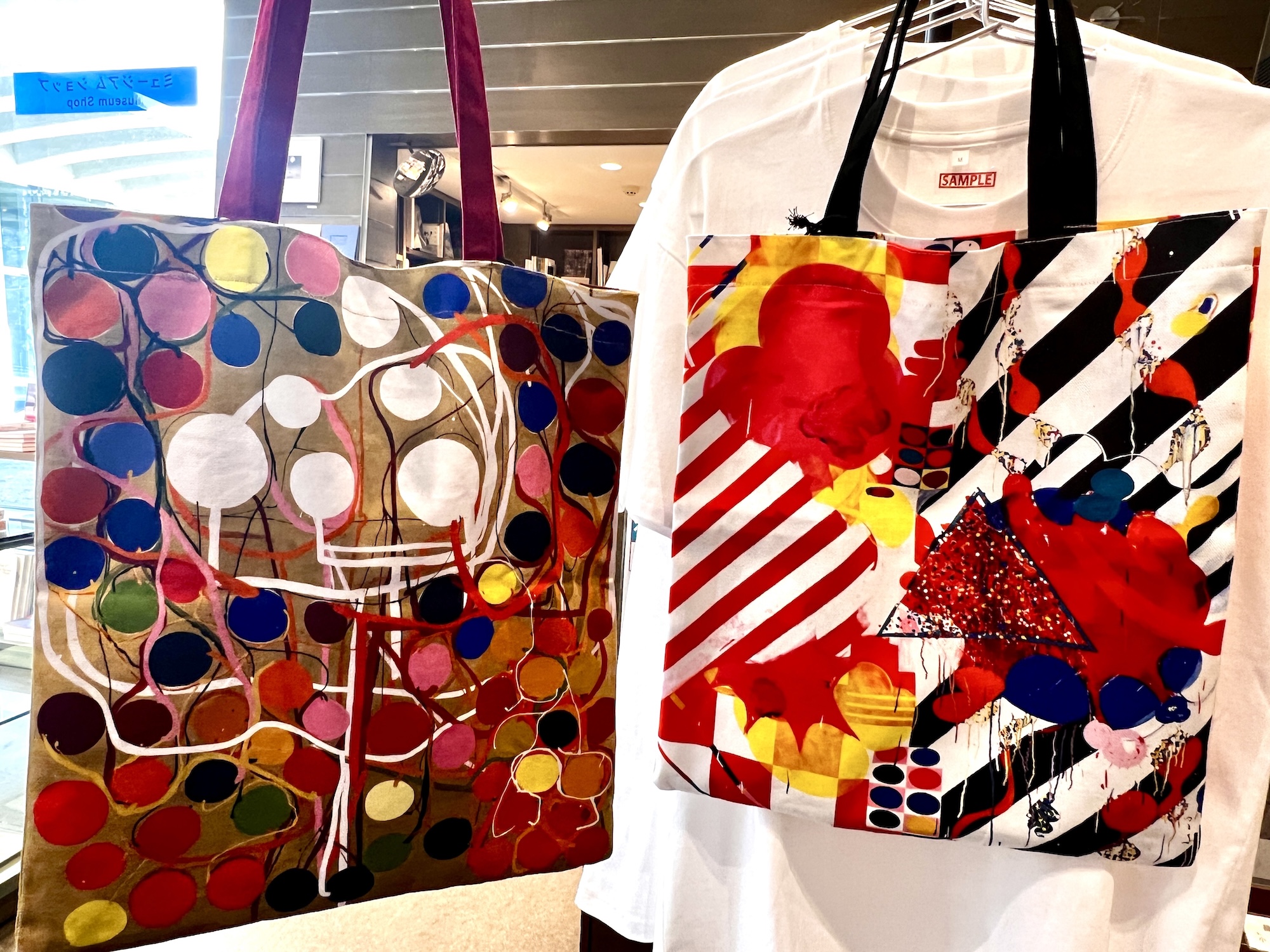 トートバッグも2種類。カーキのボディには田中作品の円と線が、白のボディには山崎作品の幾何学模様や色の重なりが全面にプリントされている。価格は4400円(税込)。