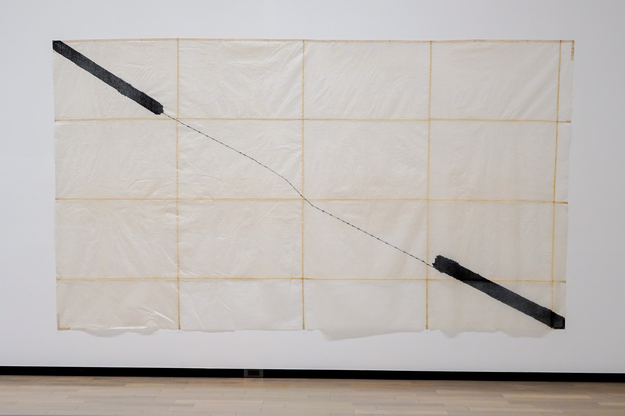 大きな展示スペースの床には、この芸術祭に参加したポストもの派の作家・海老塚耕一の新作《Correspond-1977年7月 大邱の余韻》(2024)が出品されている。タイトルに「1977年」とあるのは、本祭の開催年ではなく、横浜・鶴見区出身の海老塚が高駿石の自叙伝『越境一朝鮮人・私の記録一』を読んで衝撃を受けた年だという。本作は、「第5回大邱現代美術祭」参加のために初めて訪れた韓国で、オンドルに使われる社版紙にひかれ入手したものを、約半世紀のちに素材としたものだ。