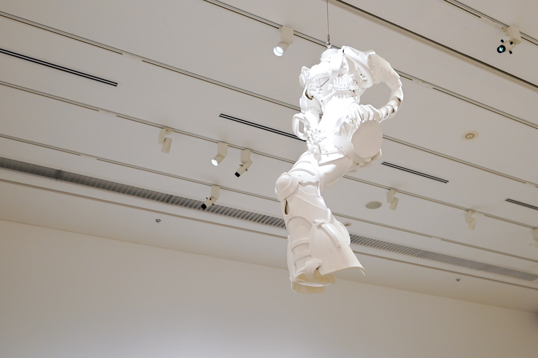 同じ空間には村上の1990年代初期作品も多く展示されている。たとえば《R.P.(ランドセル・プロジェクト)》(1991)は、日本の小学生にとって身近なランドセルを題材にした作品だ。ランドセルはもともと幕末にヨーロッパから伝わった軍用の背のうがルーツで、学習院が子供の通学鞄としてリデザインして普及した。村上はこの作品を通じて、何気ない日常のアイテムに潜む軍国主義や植民地主義の痕跡を浮かび上がらせている。