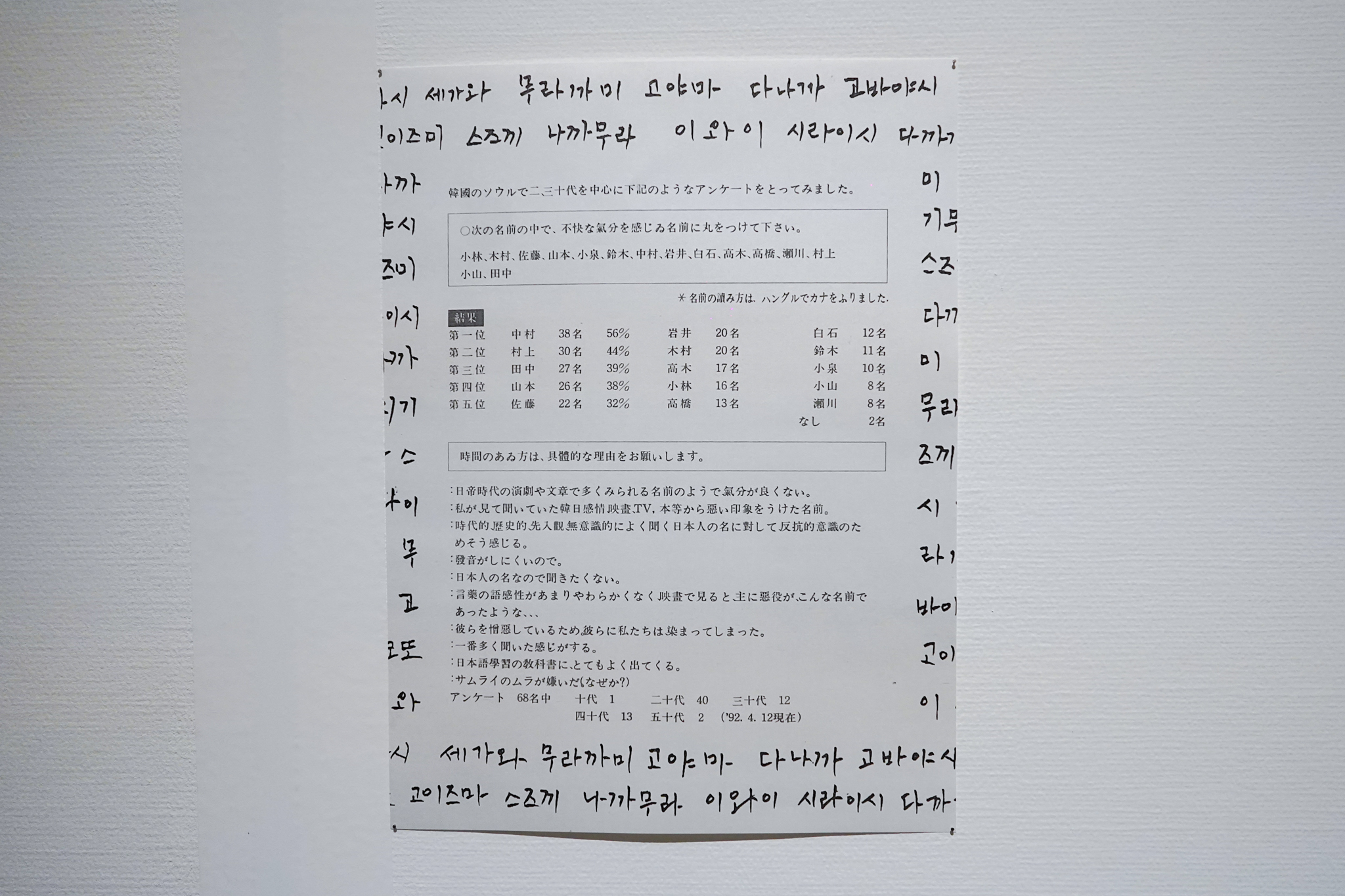 1992年、国費留学生活を終えた中村は、東京藝術大学の同窓生で美大受験予備校の同僚でもあった村上隆と「中村と村上」展をソウルで企画する。これは中村が実施したアンケートで、「中村」と「村上」という日本人の姓が、当時の韓国の人々にとって「不快な気分を感じる名前」の1位と2位であるという結果に着想を得たものだった。実際のアンケートも会場入り口に展示されている。
