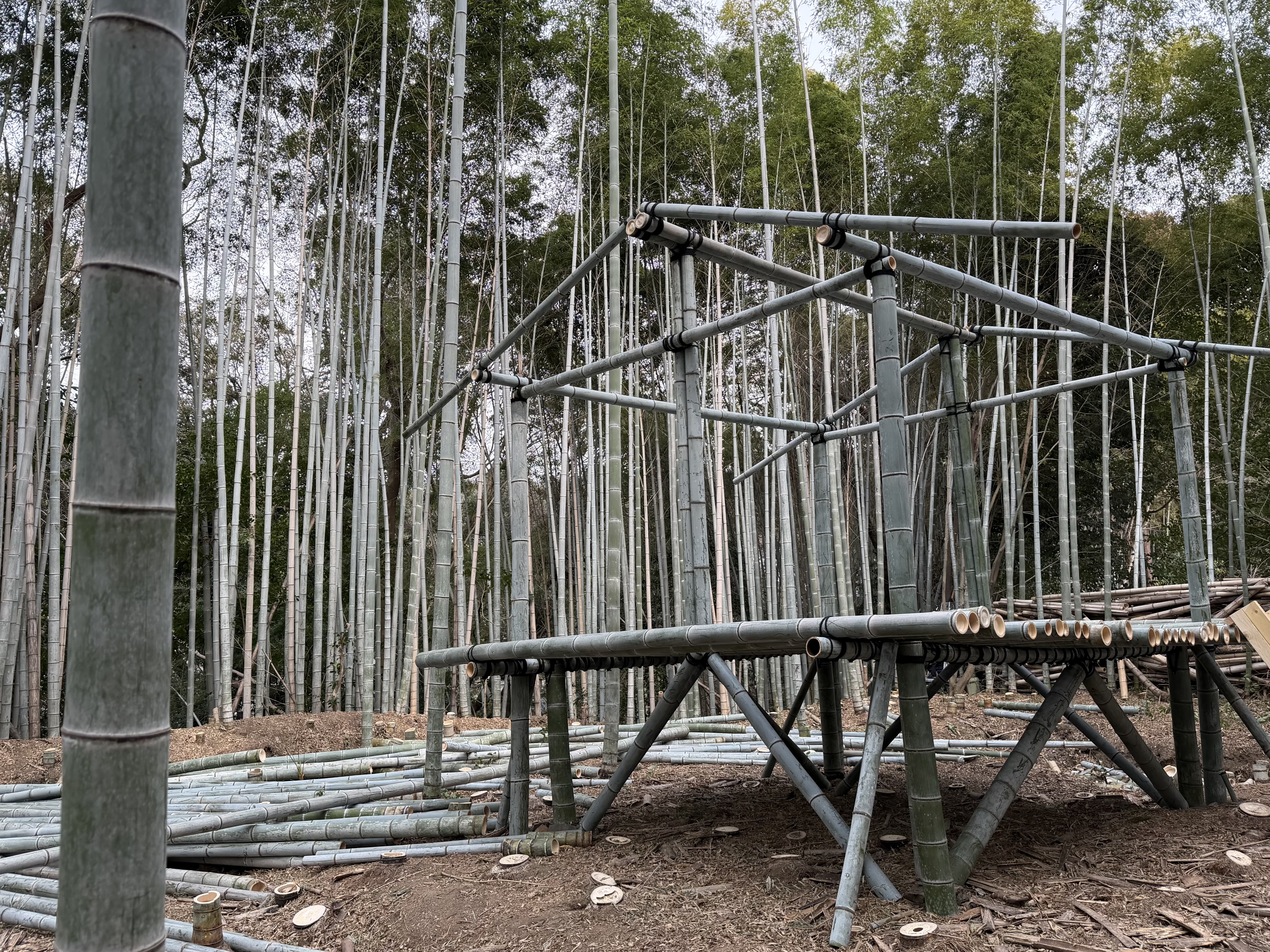 竹林の一角に設置された黒川岳の作品は、長年手入れされていなかった場所を整備することから始まった。枯れた蔓を積み上げて壁状の構造を作ることで外部の音を和らげ、風に揺れる蔓の音、鳥の声、足元の葉の音など、周囲の環境に含まれる微細な音に意識が向けられる。作品の構想に関して「耳を澄ますと、鳥の声や足元の枯葉を踏む音が聞こえてくる、自然の気配に包まれた空間にしました」と語る。