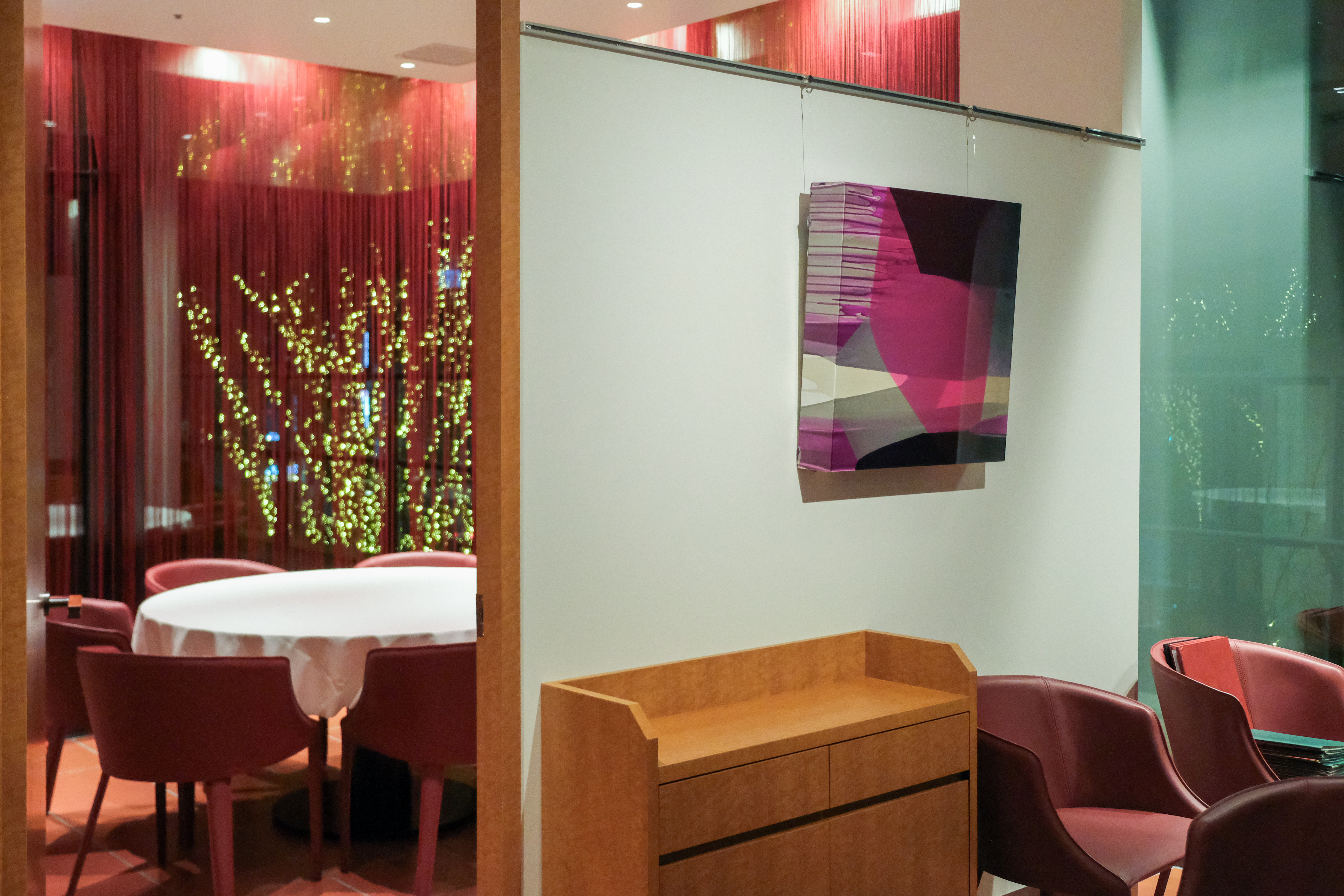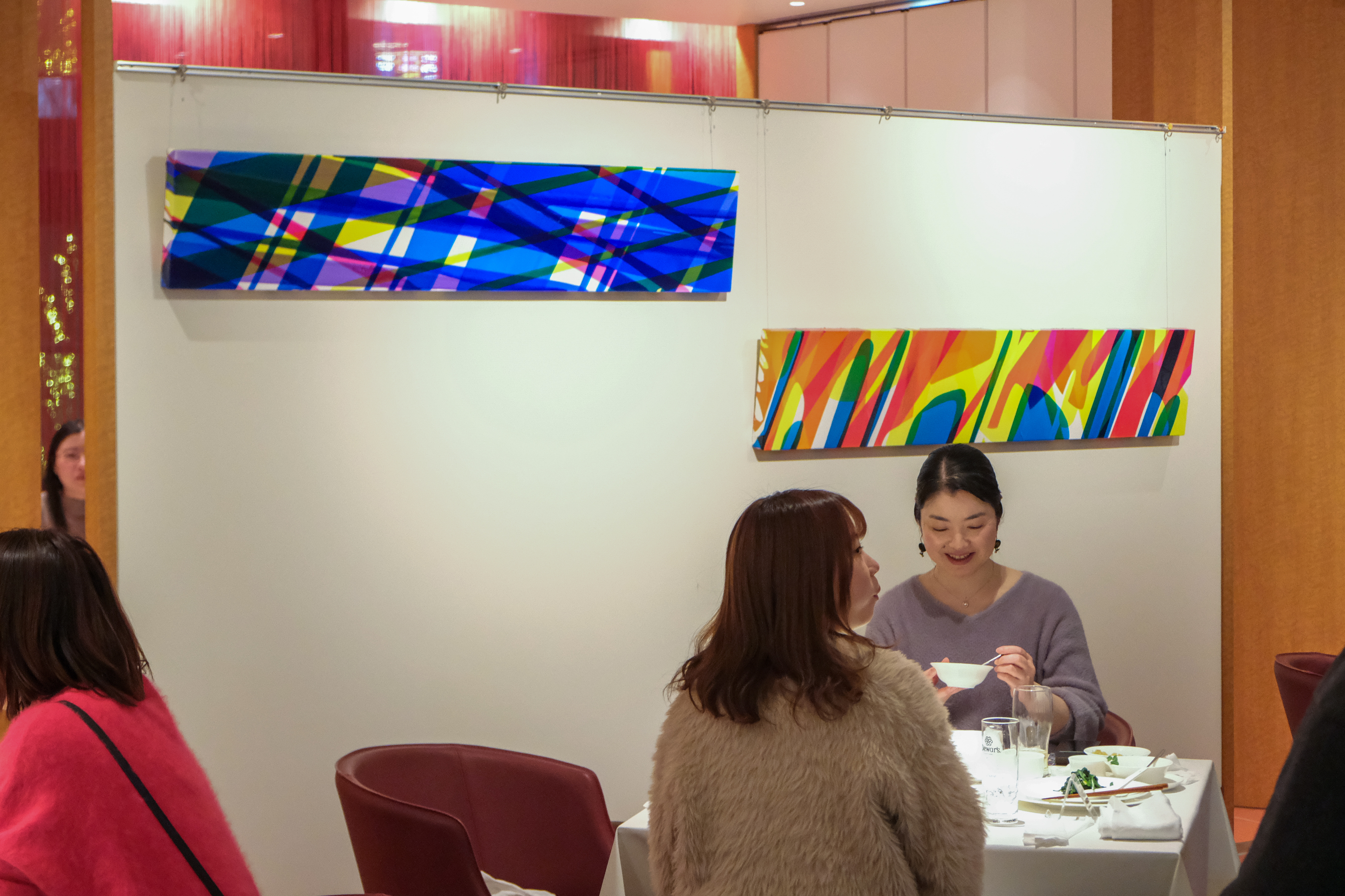 中島は「ホワイトキューブの空間と異なり、匂い、音、会話、温度といった要素がつねに画面の周囲を漂う飲食店という場所だからこそできる表現がある」と語り、2020年以降の近作を中心に展示を構成。鮮やかな色彩が重なり合う抽象画はすべて、注ぎ口のついた容器で絵具を流し描く作家独自の手法で制作したものだ。重力によって生み出される色材の様々な振る舞いは、赤と白を基調とした店舗に新鮮な奥行きをもたらしている。