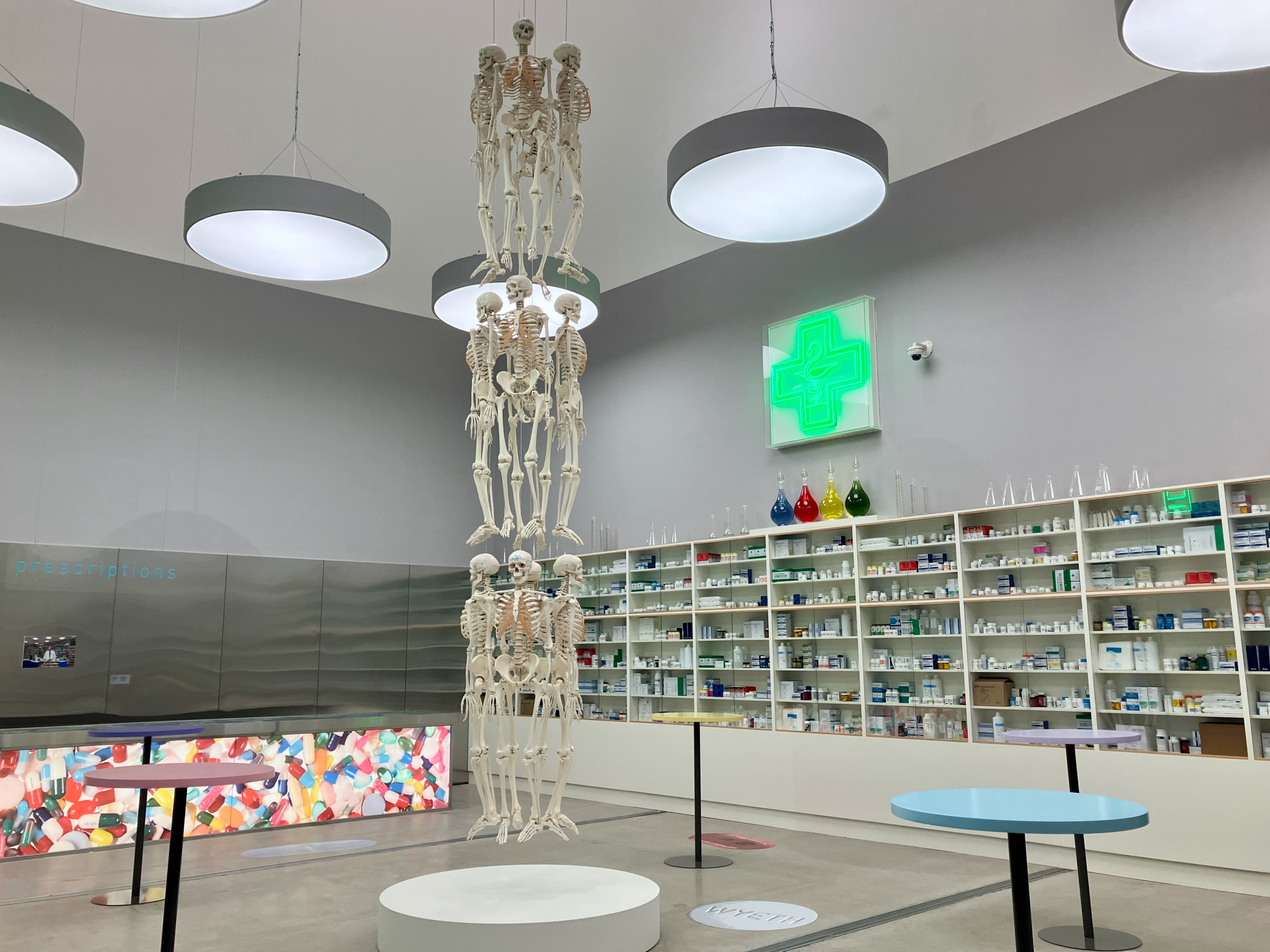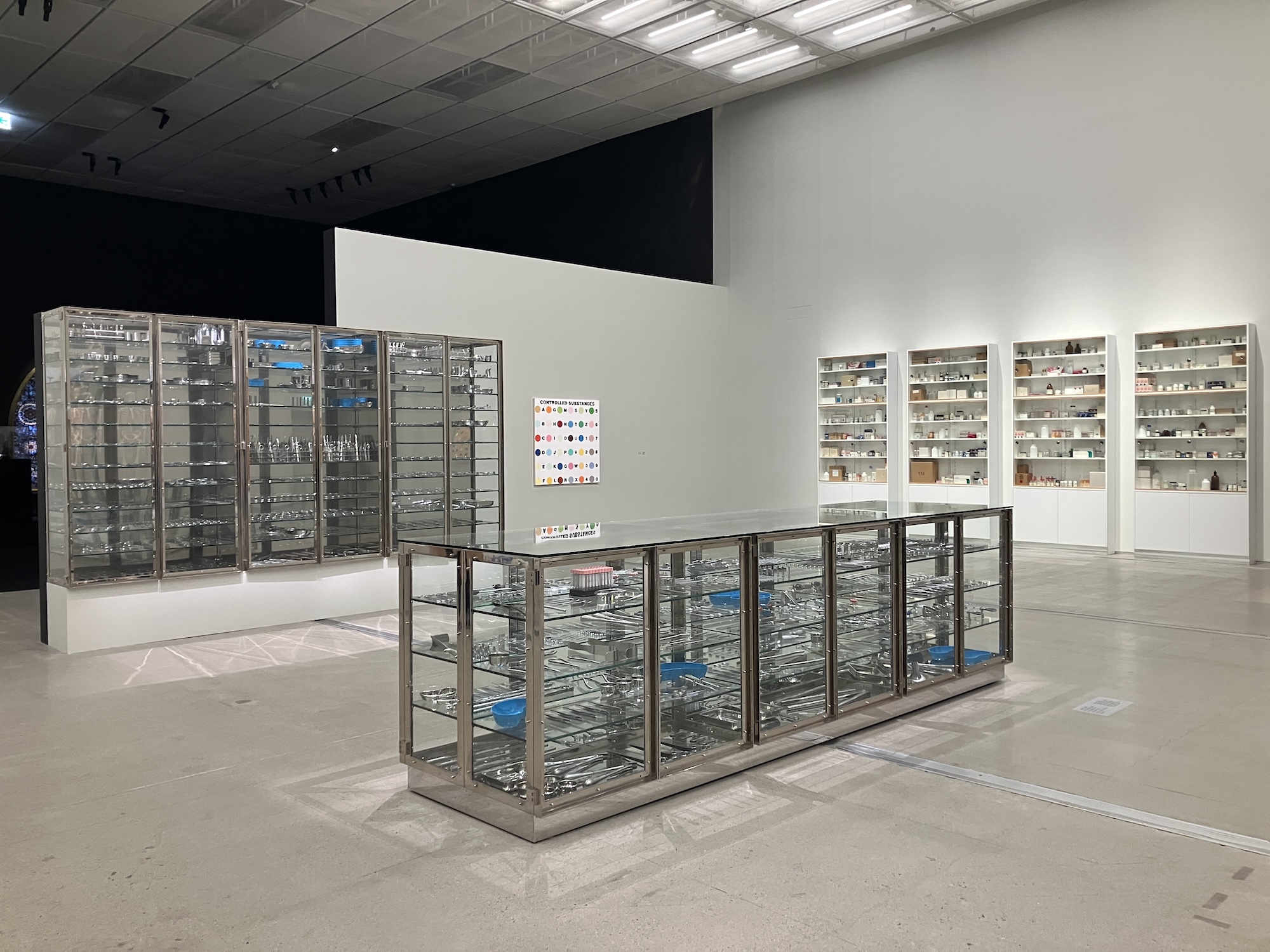 地下1階フロア最後の展示室では、ハーストが1998年から6年間にわたってロンドンで営業したレストラン「Pharmacy」の一部を再現。薬棚が並ぶ壁、天井からぶら下がる骸骨──本物の薬局と見間違う人もいたというその内装が展示空間に蘇り、その異質さによって現代医学への信頼がいかに視覚と空間によって演出されているかを問いかける。