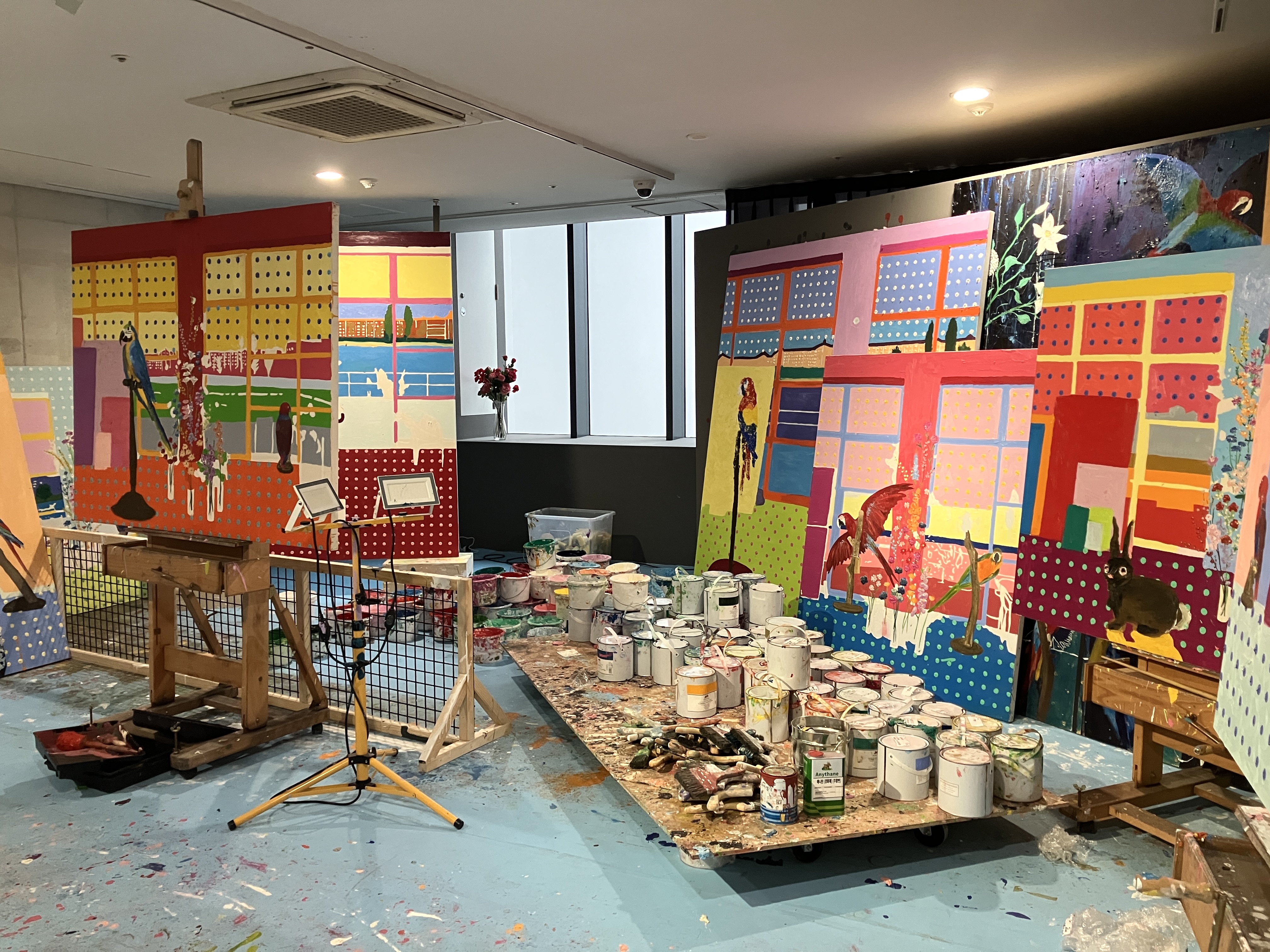 エスカレーターで2階へ上がった先の「MMCA Studio」では、最終章としてロンドンにある作家のアトリエ「River Studio」が再現されている。窓辺に佇む鳥や生き物を描いた作品を含む多数の絵画が並び、そのなかには現在進行中のもの、未完成のものも含まれる。ハーストは前日夜までこのスペースで作業していたといい、使い込まれた絵筆、絵の具のついた作業着、作家が収集したオブジェなどが雑然と置かれている。自身が絵画への思いを綴ったメモも紹介されており、近年取り組む絵画作品がどのような過程から生まれているのかに思いを馳せることができる空間だ。