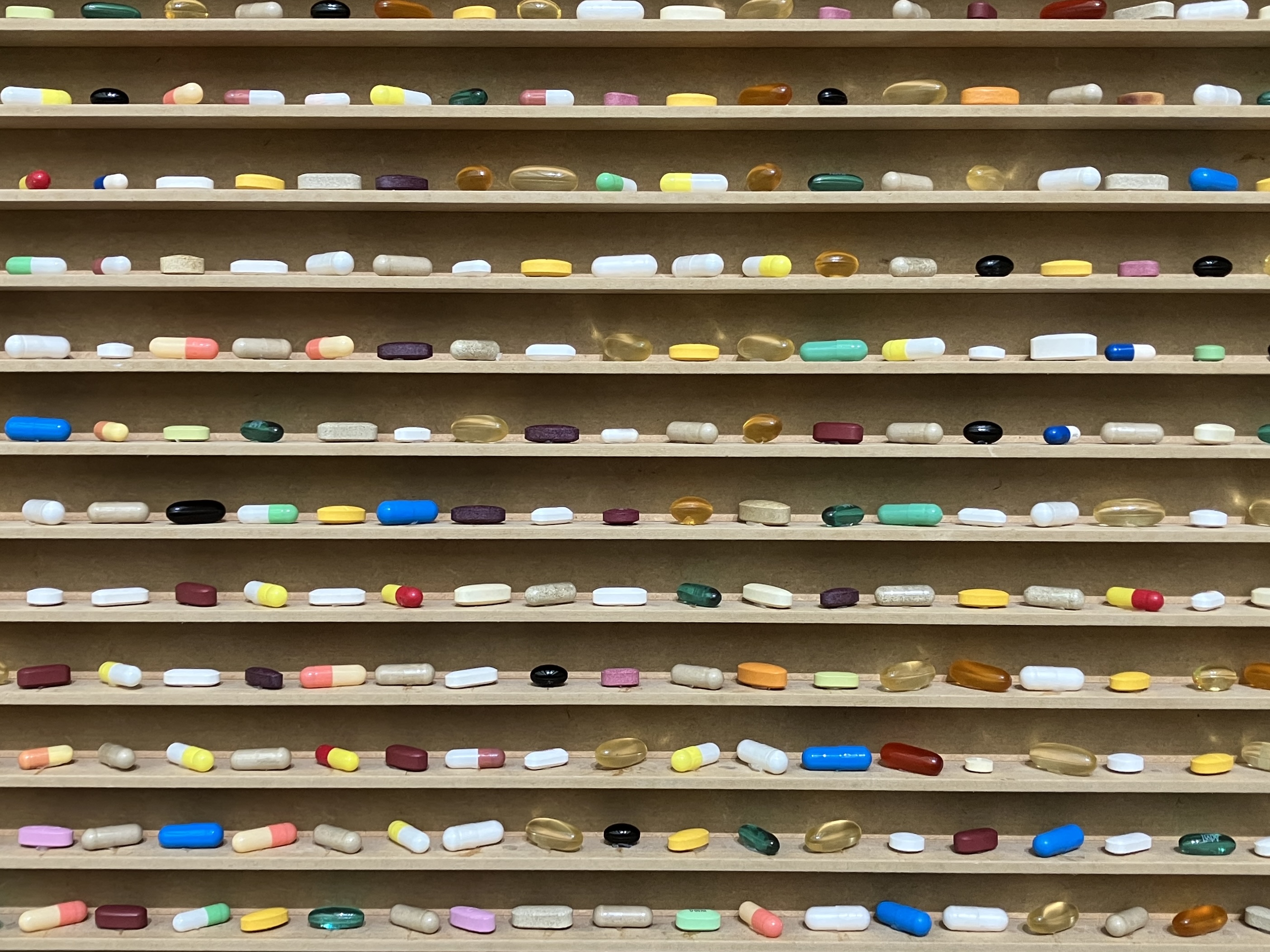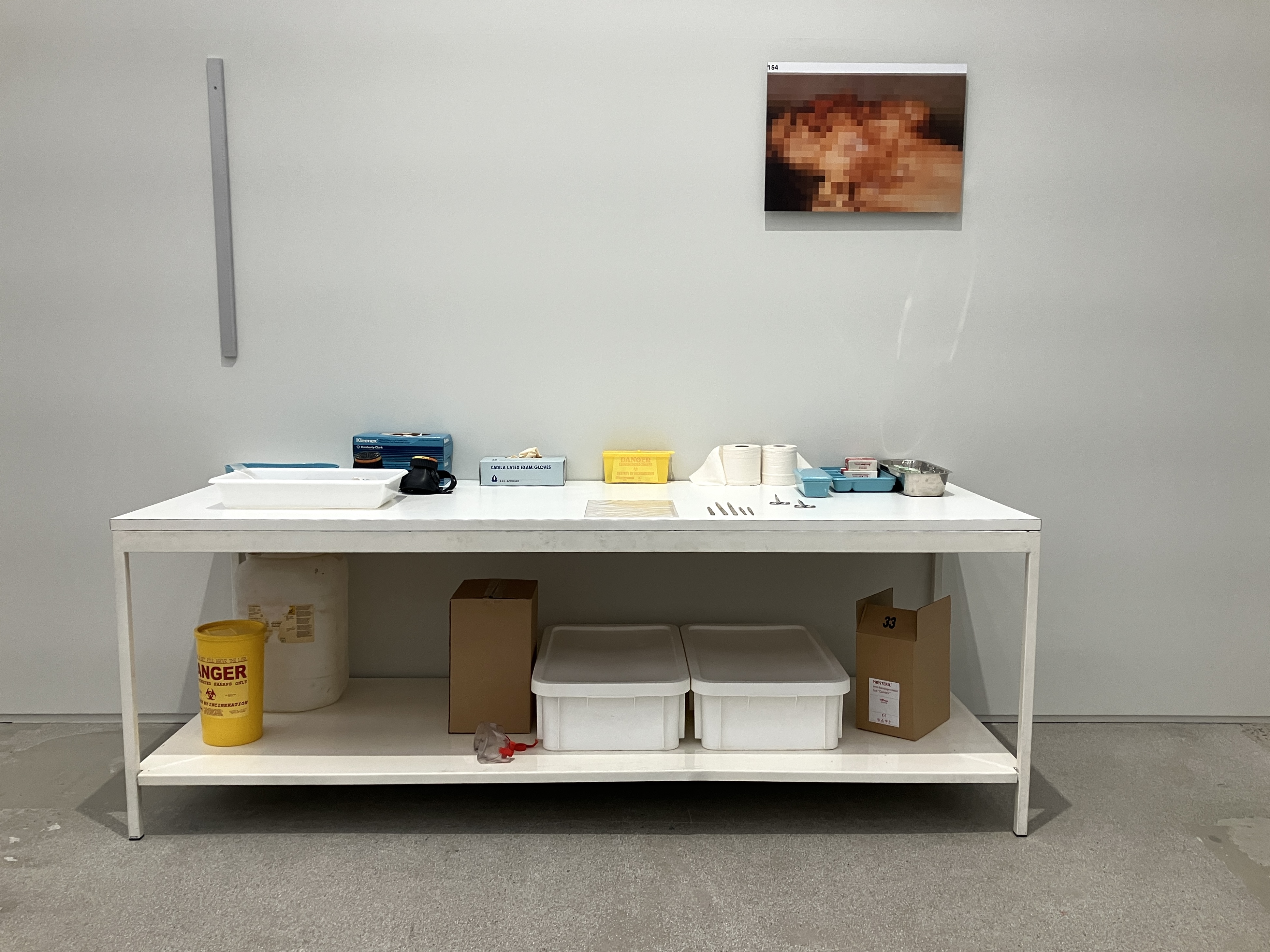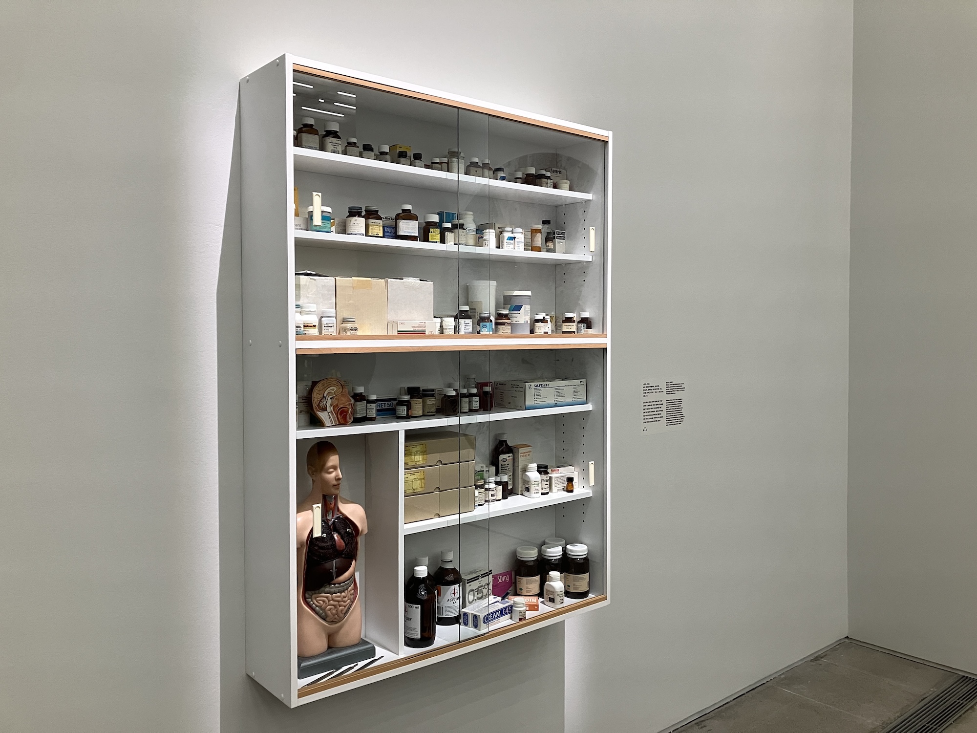 「Medicine Cabinets」シリーズの最初期の作品──亡くなった祖母が残した空の薬瓶や医薬品パッケージが祭壇のように並べられた《Sinner》──や、医療器具を整然と配したインスタレーションなど、医療や科学への盲目的な信頼、自らの生をコントロールしようとする人間の欲望に焦点を当てた作品が並ぶ。