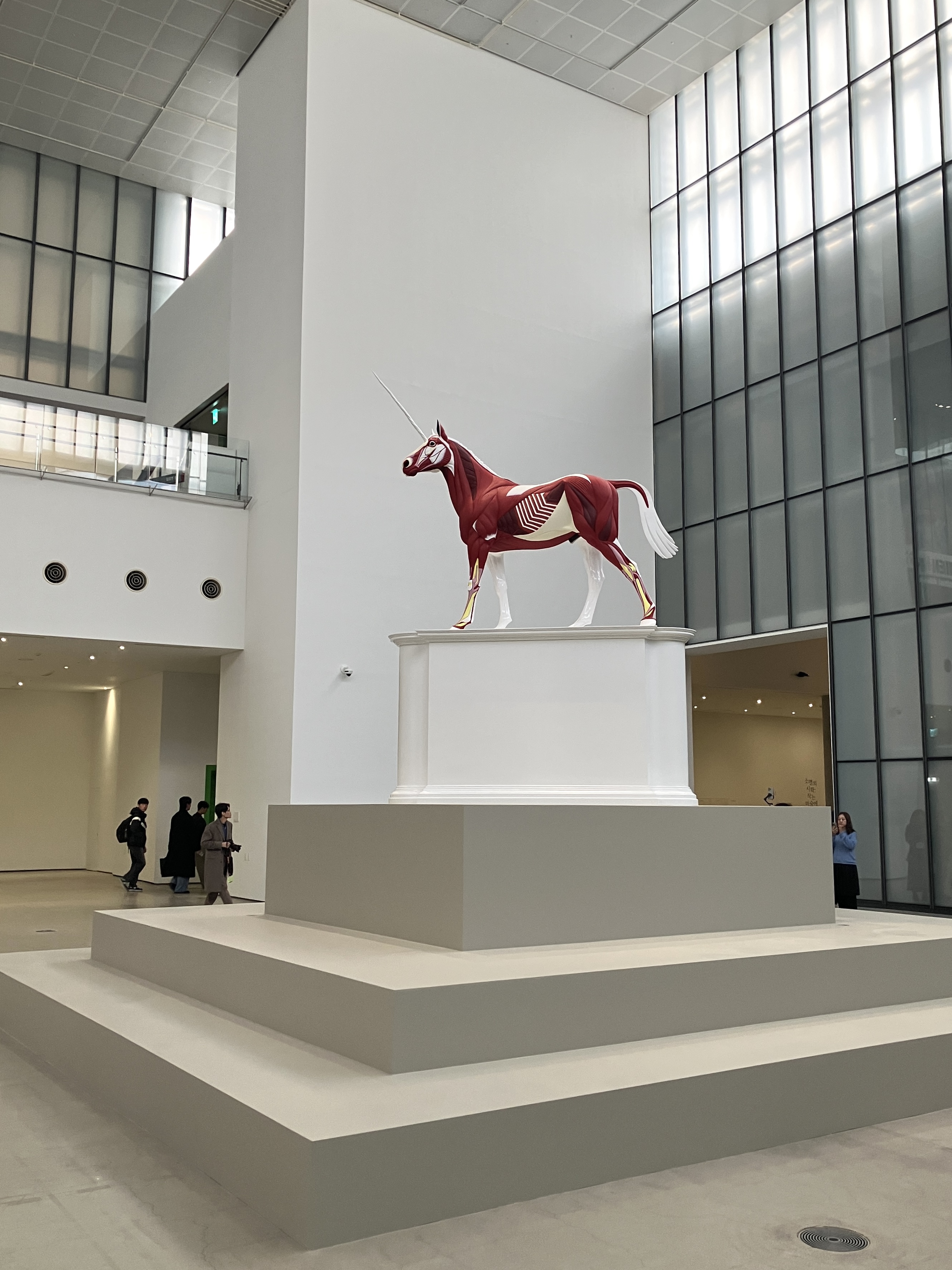 さらに神話や宗教的なイメージを取り入れたいくつかの彫刻作品も見ることができる。展示室を出た地下1階の吹き抜けには、体半分が解剖模型となったユニコーンの立体作品が、重ねられた台座の上に象徴的に展示されている。