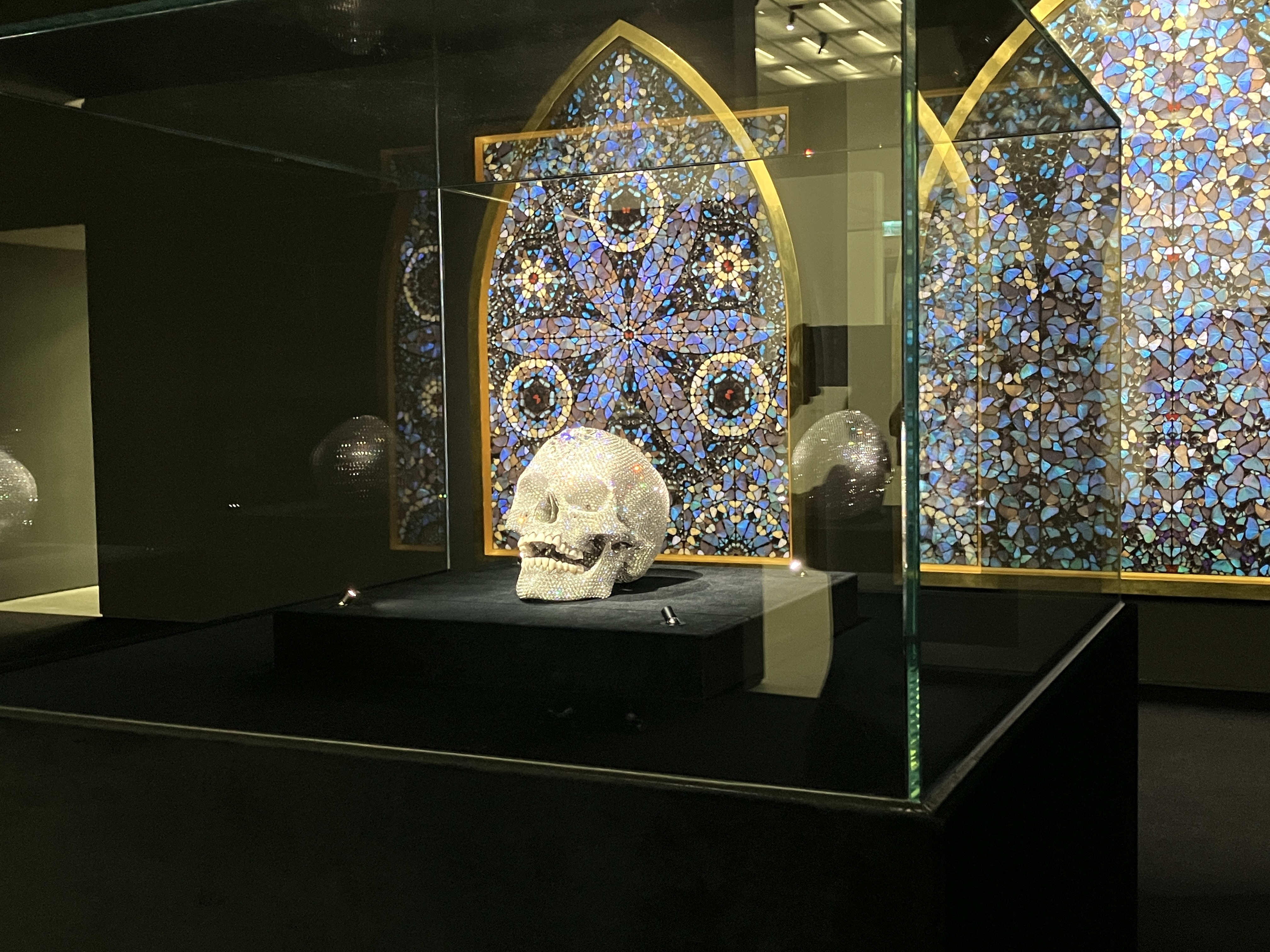 壁面と床が黒で統一され、荘厳な雰囲気が演出された展示室では、アジア初公開となる《For the Love of God》が公開されている。プラチナで鋳造した頭蓋骨に8601個のダイヤモンドと人間の歯によって構成される本作は、必ず朽ちる人間の肉体と、永遠と美の象徴であるダイヤモンドが一体となった作品だ。当時120億円で落札されたことも話題を呼んだ。背景にはハーストの重要なモチーフのひとつである蝶の羽を数千枚並べて聖堂のステンドグラスのように作り上げた《Contemplating the Infinite Power and the Glory of God》が広がり、頭蓋骨は崇拝の対象であるかのように静かに輝く。美しく完璧な表面のなかで、生身を晒す歯の部分だけが生々しく浮かび上がり、生のリアリティを伝えるようでもある。