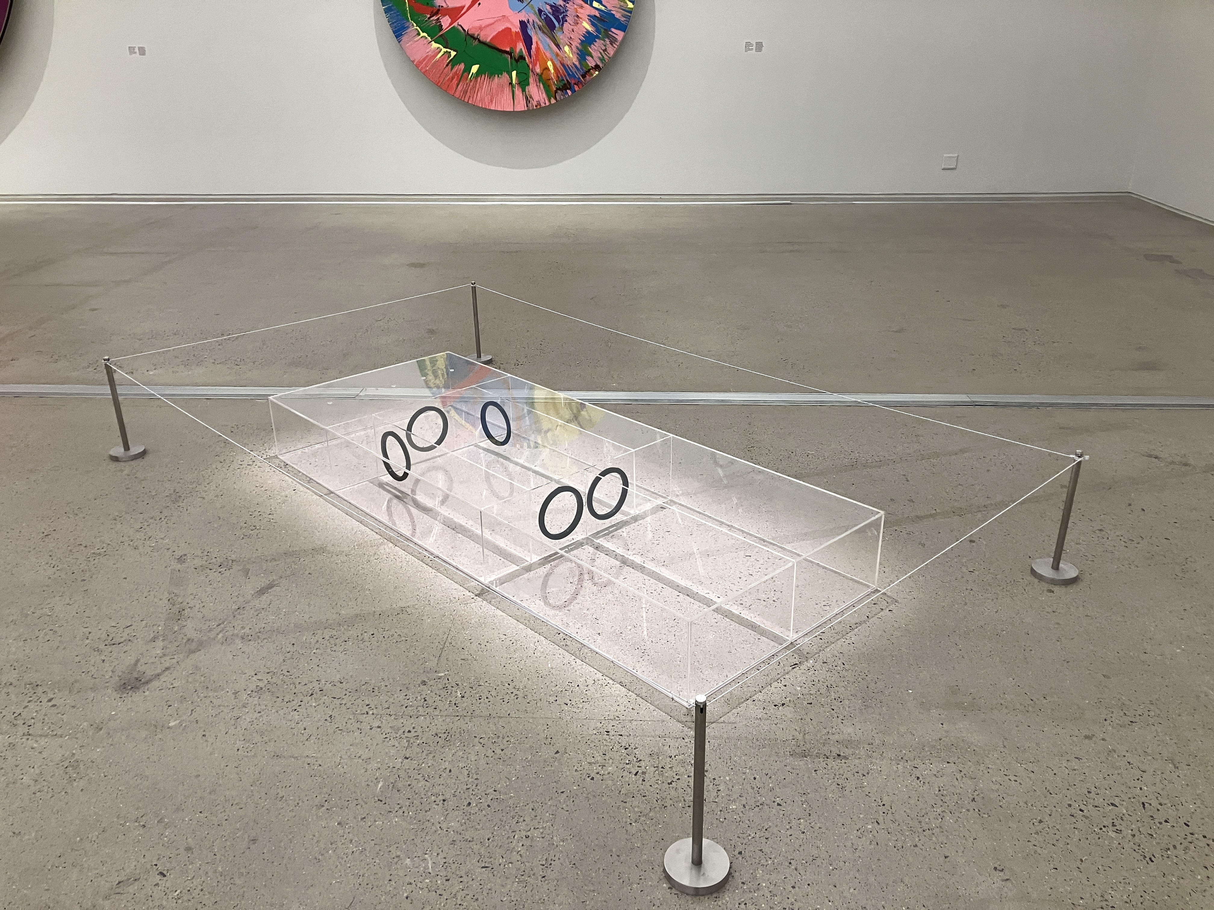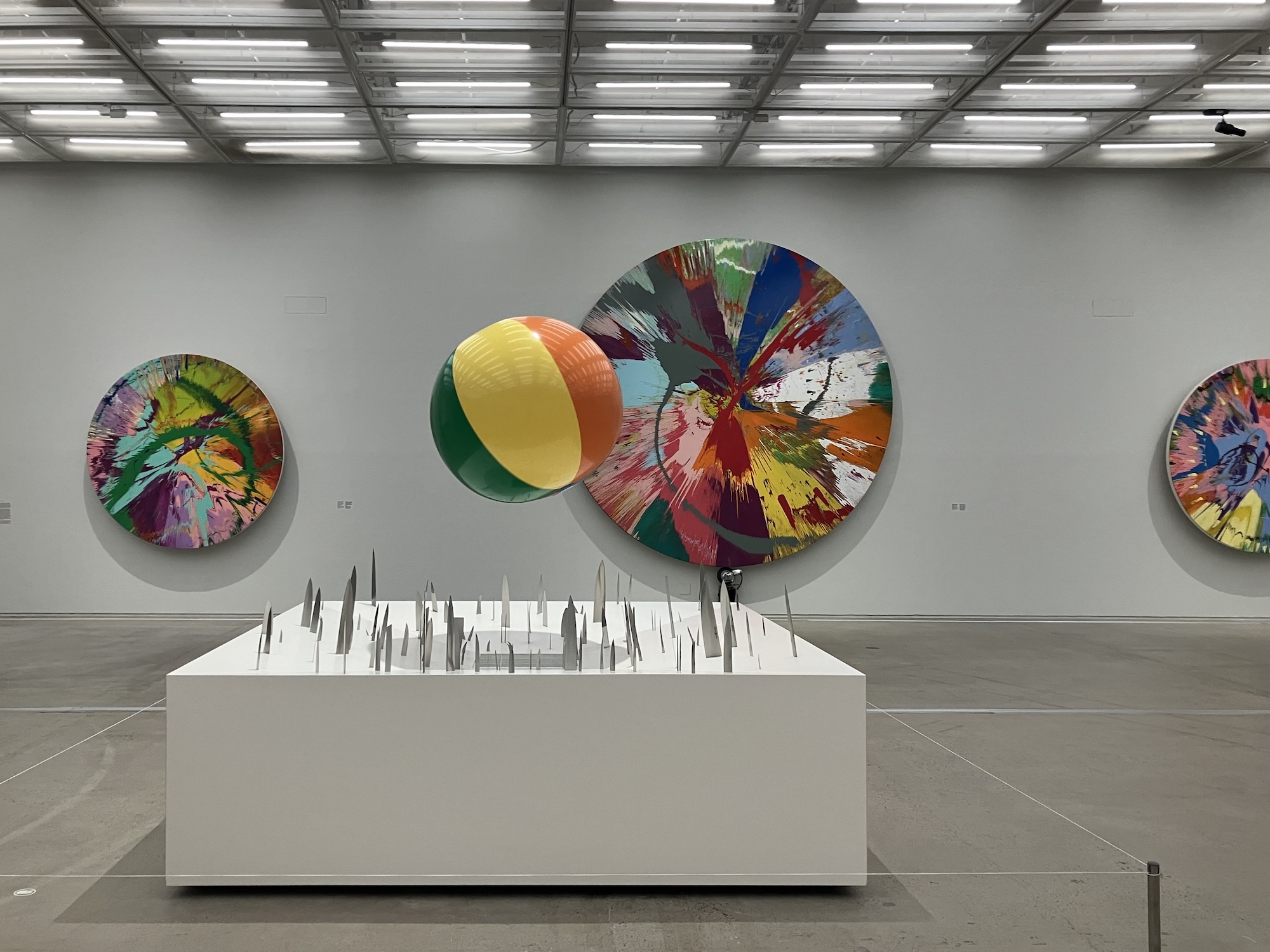 ここでは代表的な2シリーズの初期作品も見ることができる。様々な色の点を規則的に配置した「スポット・ペインティング」と、回転するキャンバスによって色彩の配置を偶然に委ねた「スピン・ペインティング」が向かい合うように展示され、秩序と無秩序、制御と偶然という相反したテーマを浮かび上がらせる。中央に浮かぶビーチボールとその下から無数のナイフが刃を向ける《The Fragility of Love》は、その名の通り愛の脆さ、あるいは生の不安定さを想起させる。
