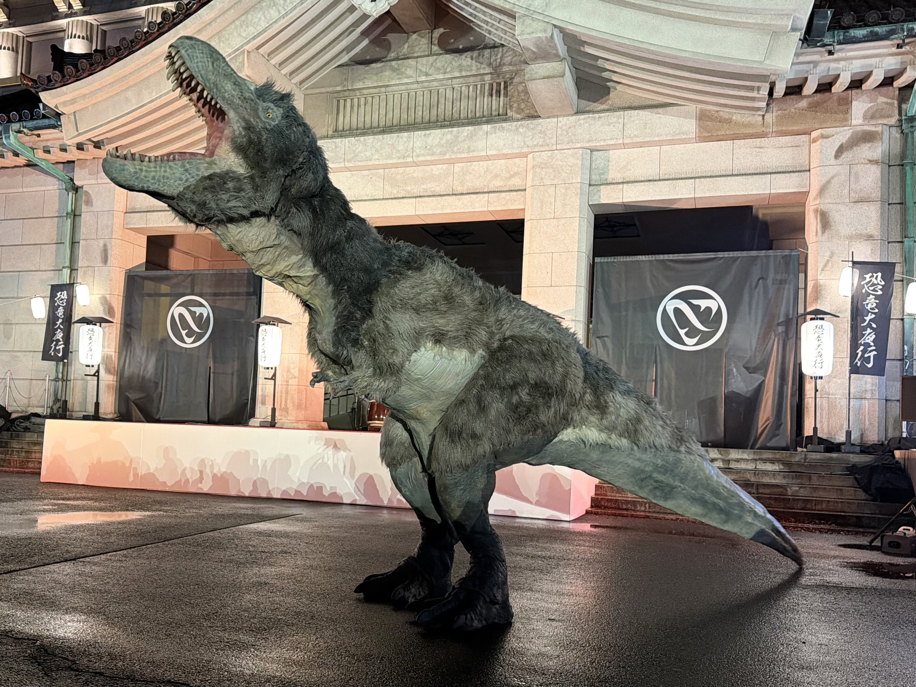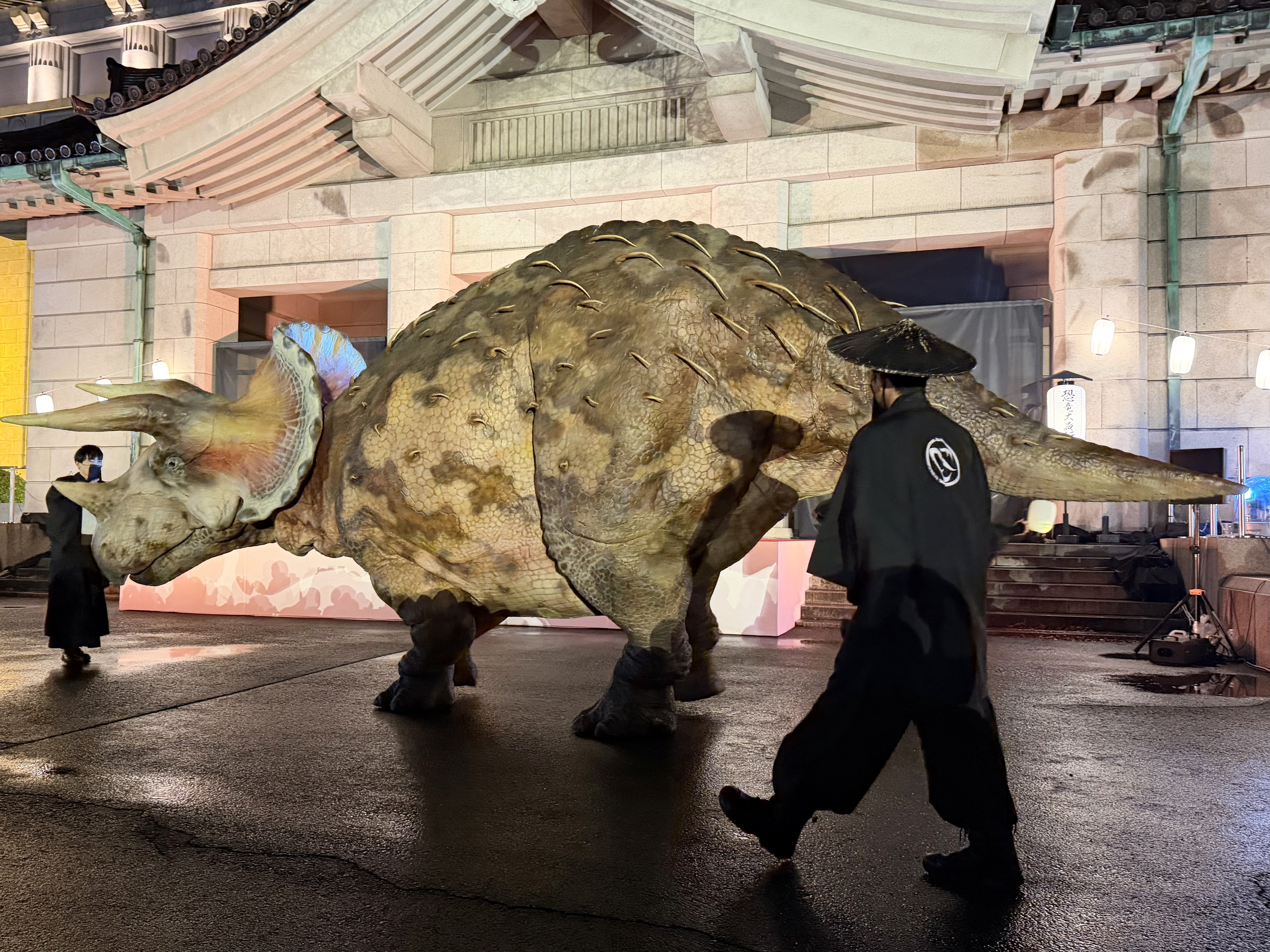 こうした恐竜たちは、人の動きに合わせて動く恐竜型メカニカルスーツとして制作されている。皮膚の質感や筋肉の動き、身体の重さを感じさせる動きまで丁寧に作り込まれており、たんなる着ぐるみとは異なるリアリティさがある。