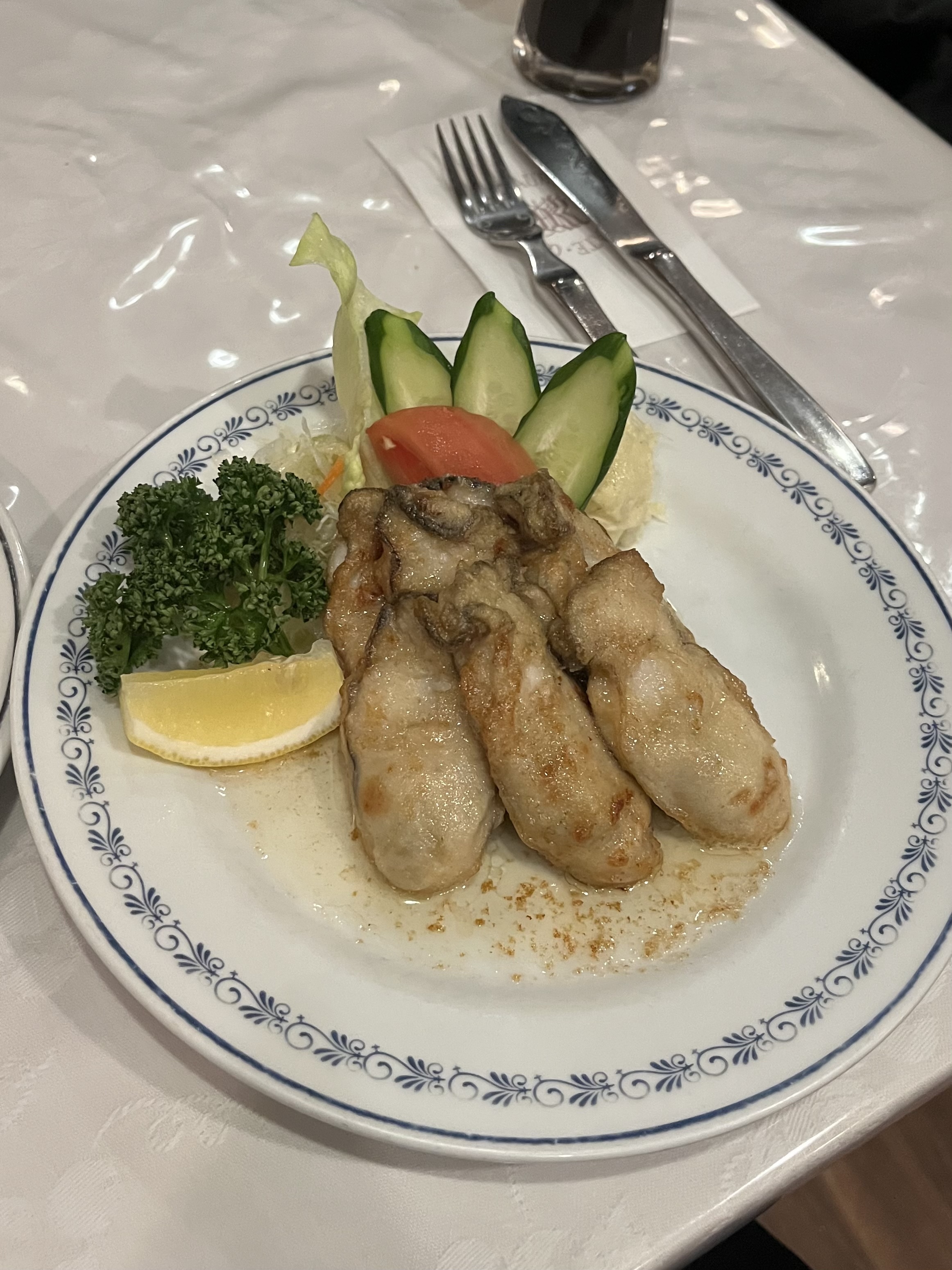 皿に並んだ牡蠣は、通常の1.5倍、いや2倍はありそうな大きさ。口に運ぶと、その存在感にまず驚かされます。ひと粒ごとの旨みがしっかり感じられ、まろやかなバターと牡蠣の風味が口いっぱいに広がります。