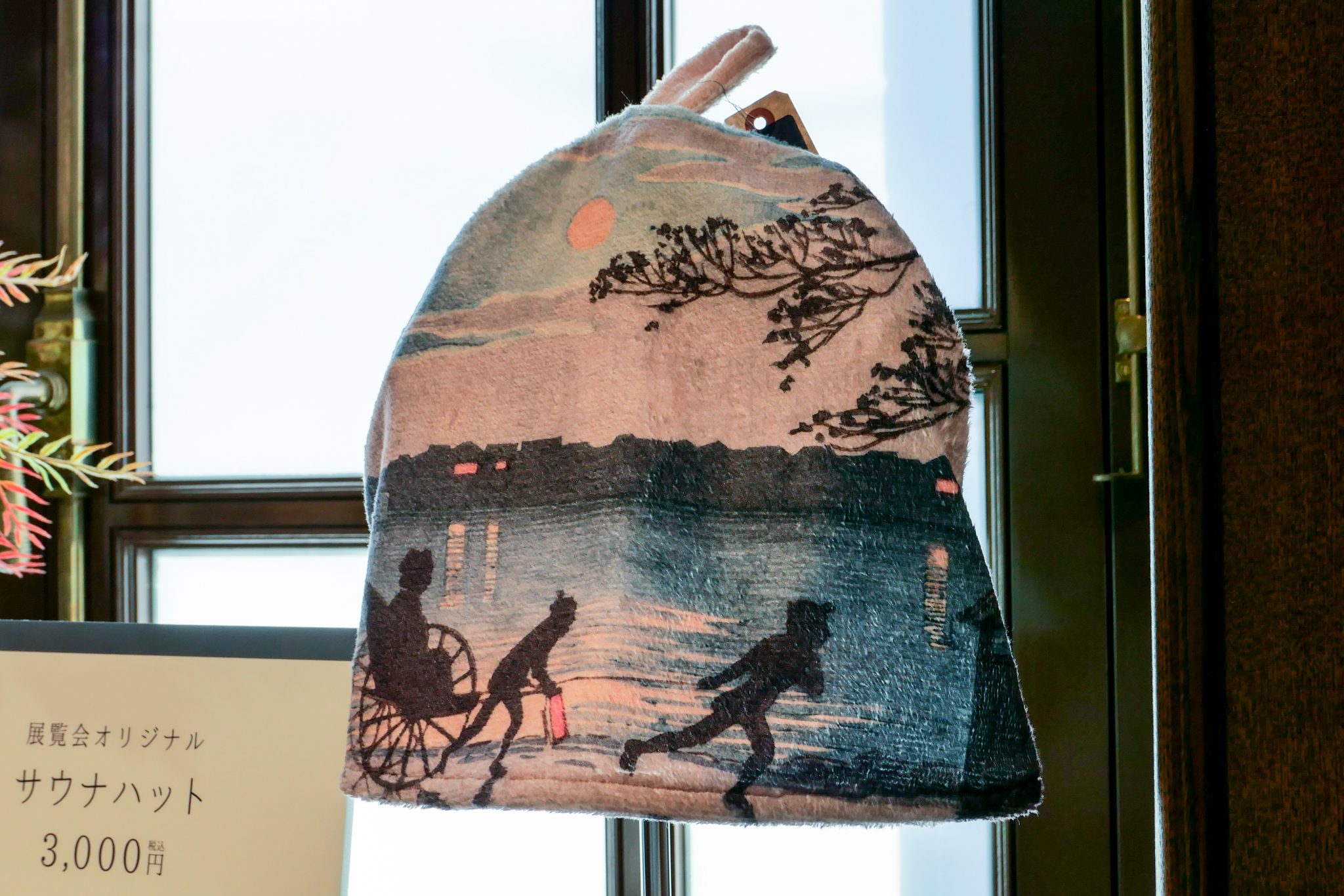 小林清親が生まれた墨田区は銭湯の街。そんな土地柄にちなんで、サウナハットがグッズ売り場に登場。着け心地と作品の再現性を両立させたオリジナル商品。価格は3000円(税込)。