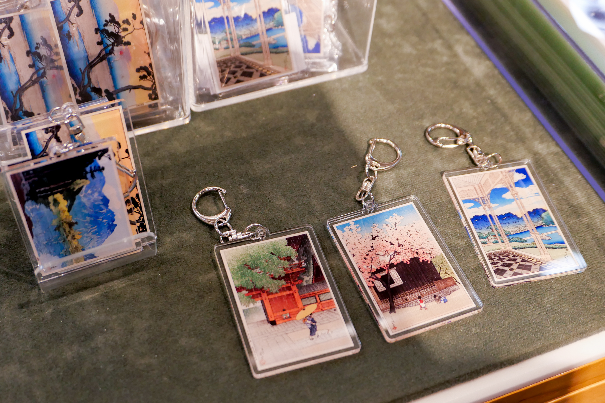 新版画の名作がデザインされたアクリルキーホルダー。色鮮やかな風景画を眺めていると、旅に出たくなる。価格は1200円(税込)。