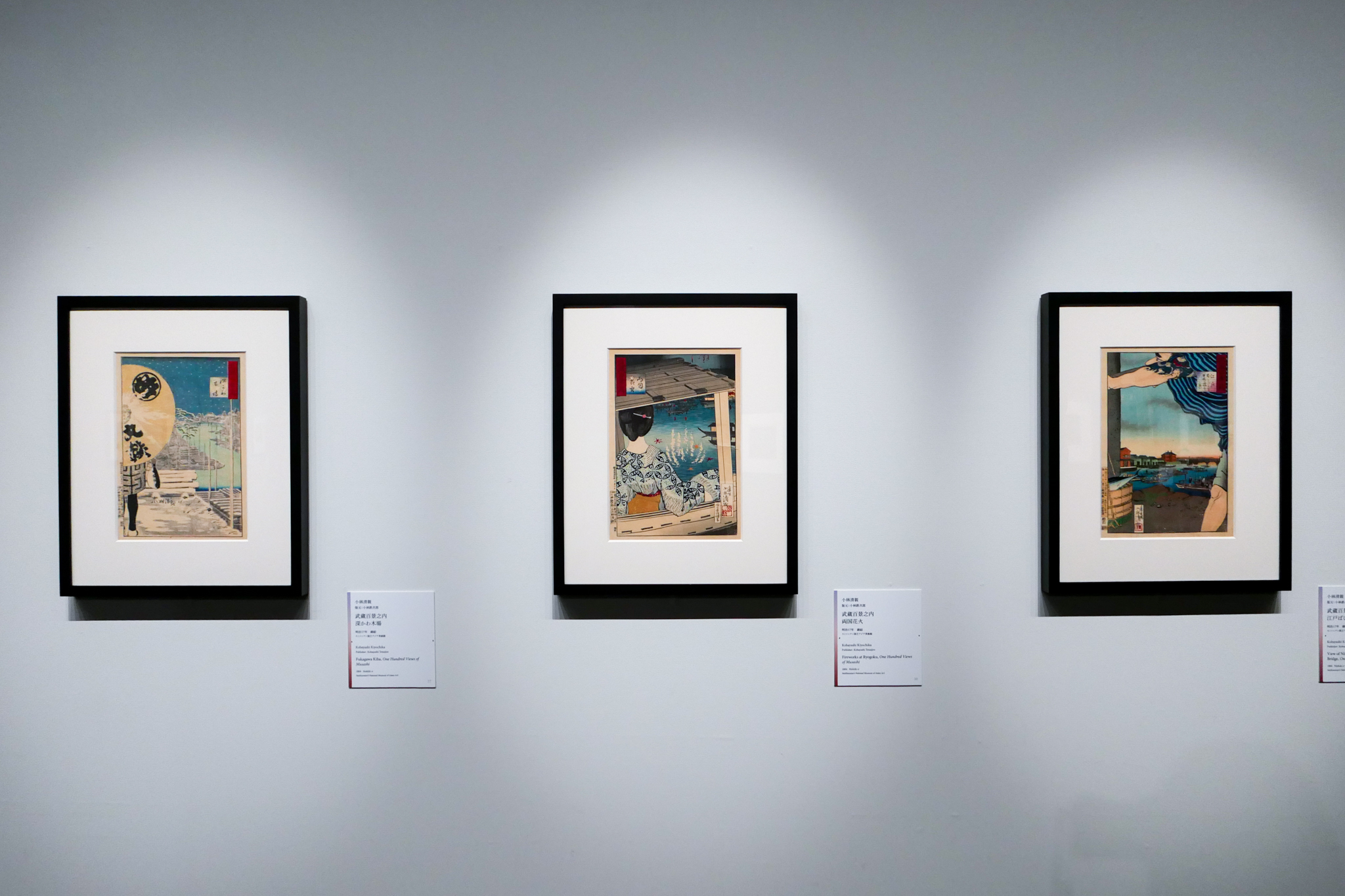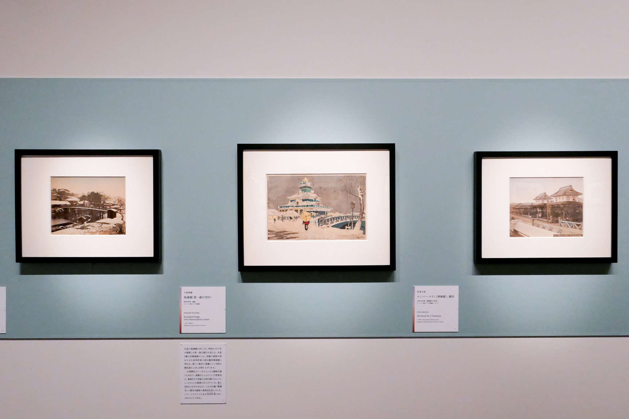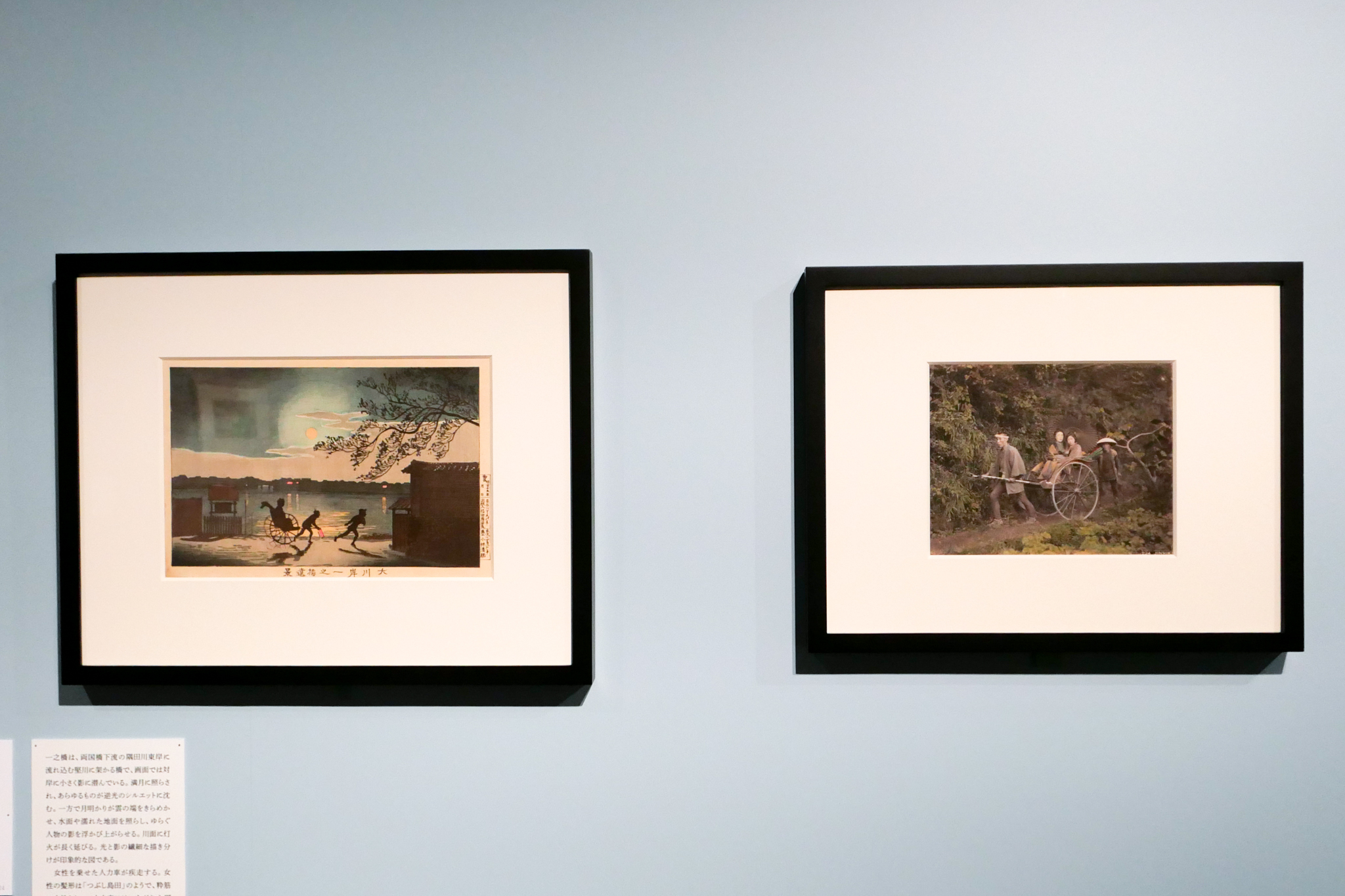 当時の日本人の姿や風俗を記録した写真は、それを持ち込んだ外国人たちには好奇の視線の対象であると同時に、江戸の生活と情趣の貴重な記録でもあった。やがて文明開化によって失われゆく風景を惜しむノスタルジックな態度は、写真と浮世絵が共有するものとなっていく。本展では版画と写真を交互に並べることで、ふたつのメディアがとらえた明治の風景を見比べることができる。