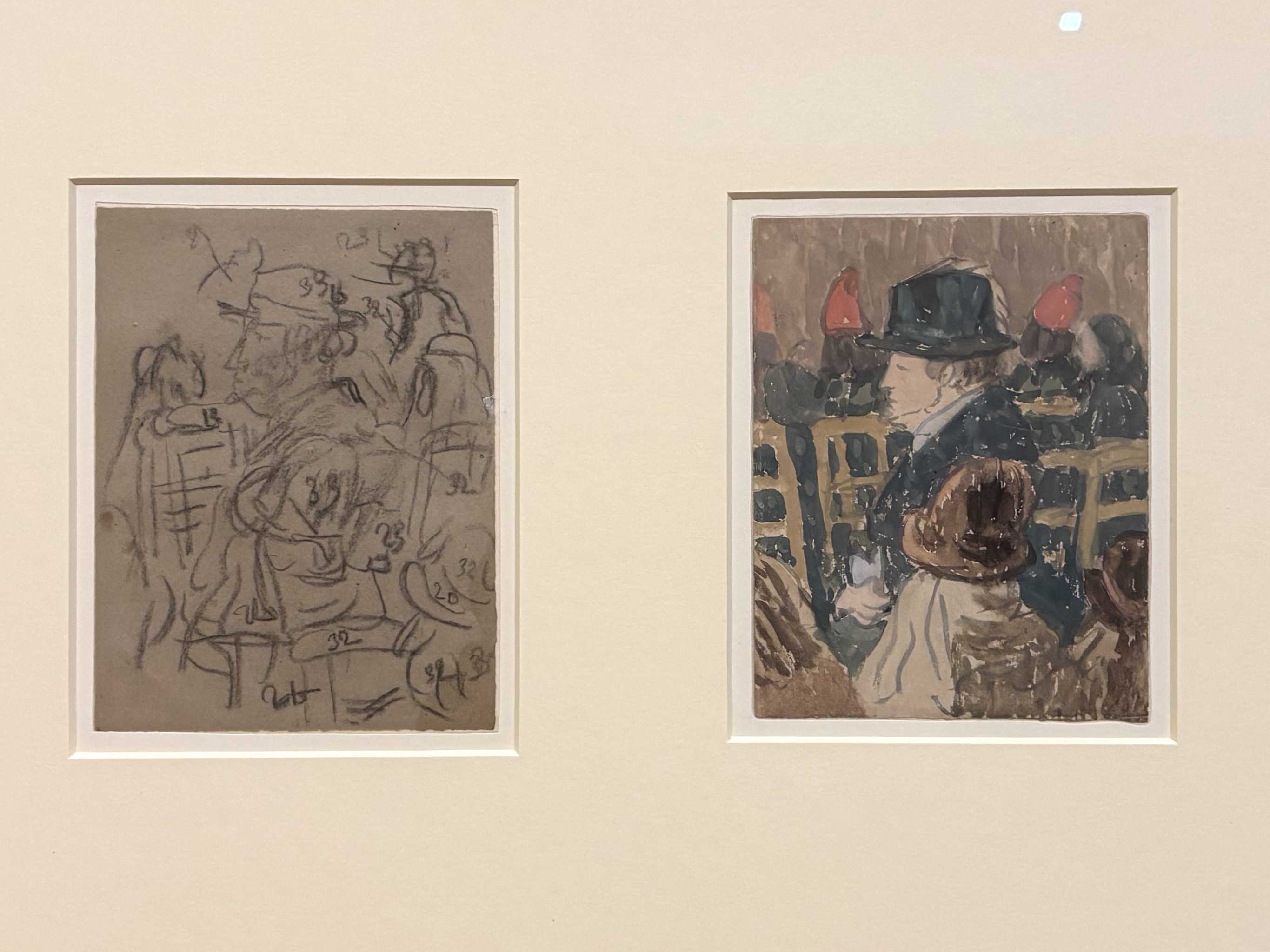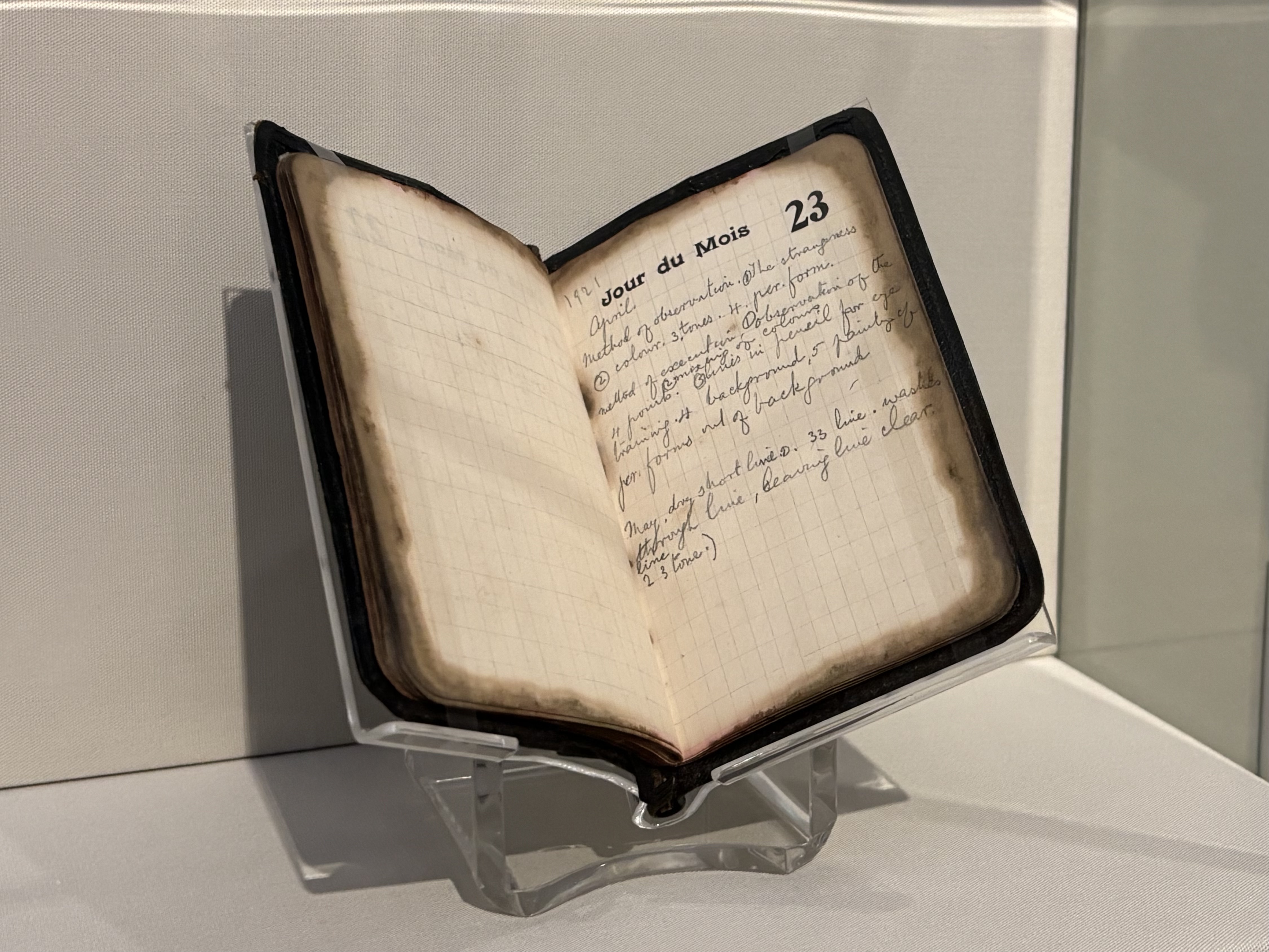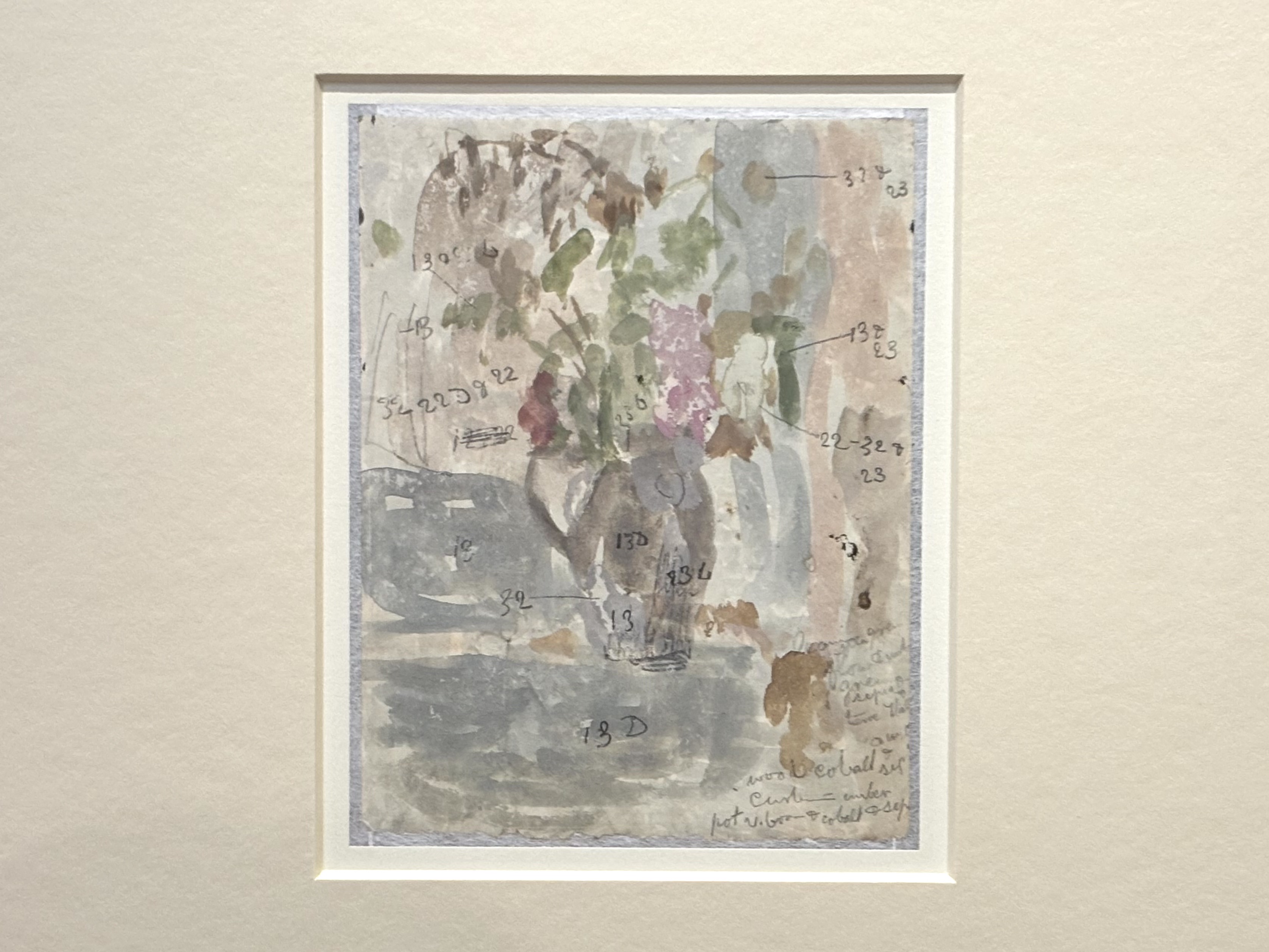 色彩理論に深い関心を寄せていたジョンの素描には、ほとんど必ずといっていいほど色彩に関するメモが付されている。それはたとえば、「夜の砂浜に色あせて咲く四月のパンジー」といった詩的な表現で記されることもあれば、番号による記録として残されることもある。また、両方の組み合わせの場合もある。驚くべきことに彼女は自ら調合した色やトーンを識別するために独自のコードを考案していたのだ。それらは鉛筆や木炭で素早くスケッチした対象の色やトーンを後から思い出すための手がかりとして用いられていたと考えられているが、そのコード自体はいまだ解読されていない。