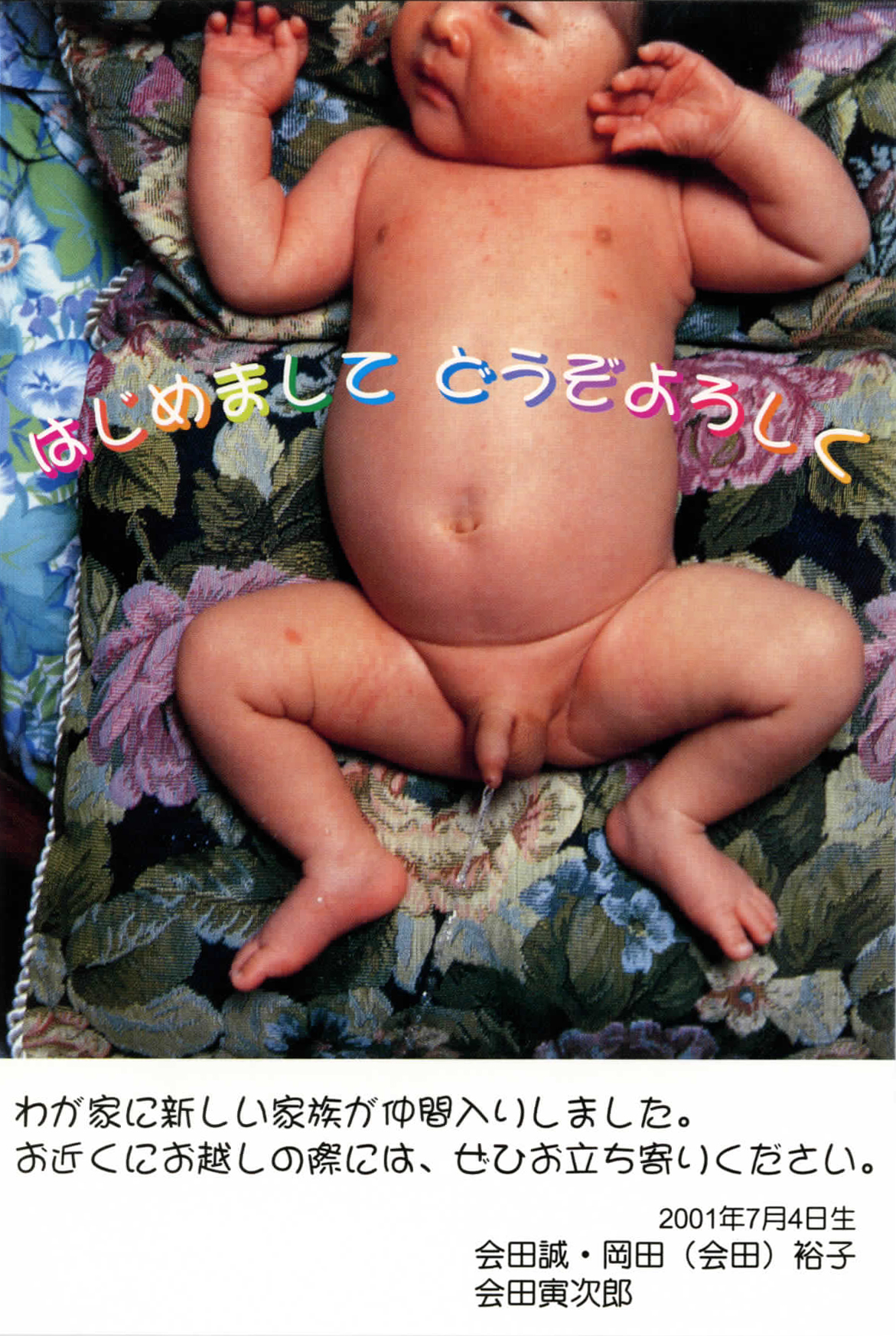 そもそも、当時は作家を続けるなら結婚や出産はタブーという空気があった。そんななか私たち夫婦(編集部注:岡田のパートナーは美術家の会田誠)は、「アーティスト同士で子供つくるのもいいんじゃね?」みたいなノリで子供をつくり、 あえてバカップル的に大げさにアピールしようと、生後3ヶ月で「会田誠+岡田(会田)裕子+会田寅次郎 三人展」(ミヅマアートギャラリー、2001)を開催して、新生児の写真を展覧会のDMにして美術関係各所に送りました。普段は世の家族写真系のハガキは冷めた目で見ているタイプですが、作家が夫婦になり家族も作り得るのだということをポーズとして示すためにやったんです。
