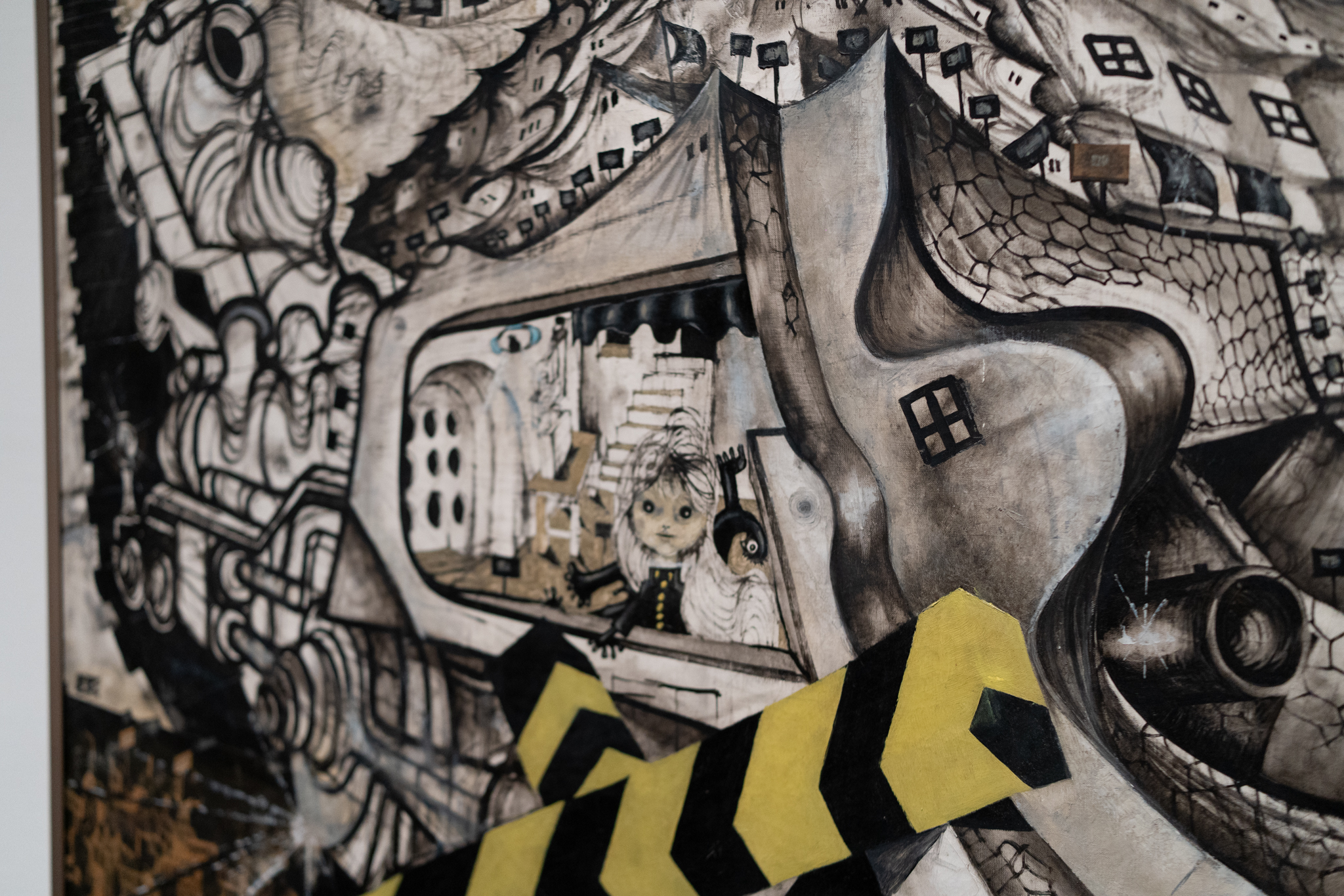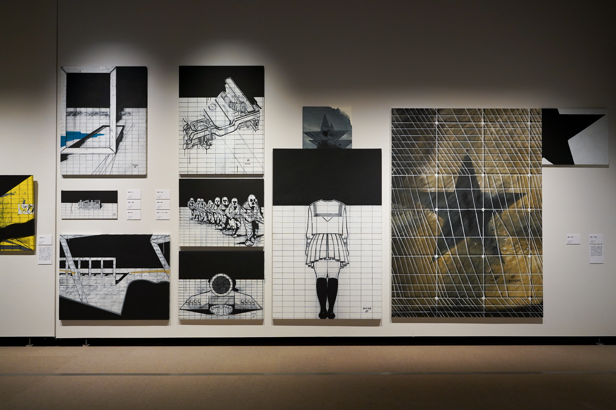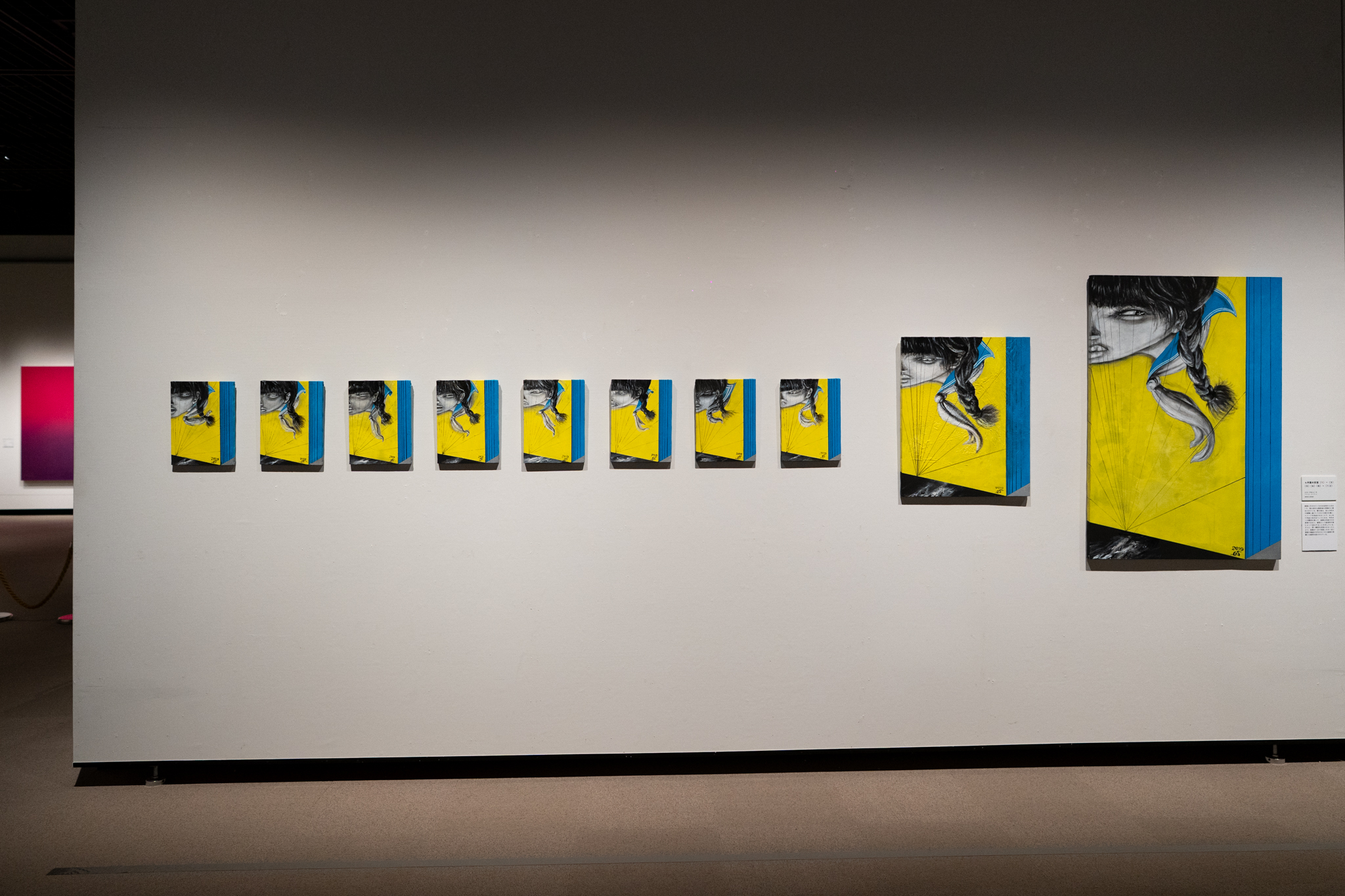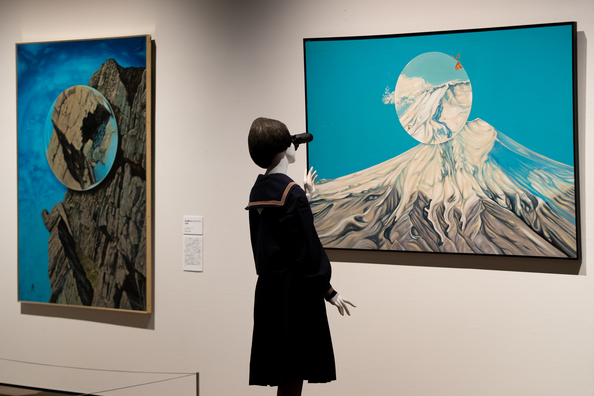 富士山の山頂付近と空中分解する旅客機の一部を拡大した絵画と、それを双眼鏡で覗き込むマネキンで構成したインスタレーション《女学生に関する芸術と国家の諸問題》。本作は、「見たものを見る」視覚行為が幾重もの入れ子状になっているが、絵画単体は富士山上空を観光飛行中の英国機が墜落し多数の犠牲者を出した1966年の事故を主題にしている。大惨事さえも「見る」対象に変換し消費する眼差しを意識させられる作品とも言える。