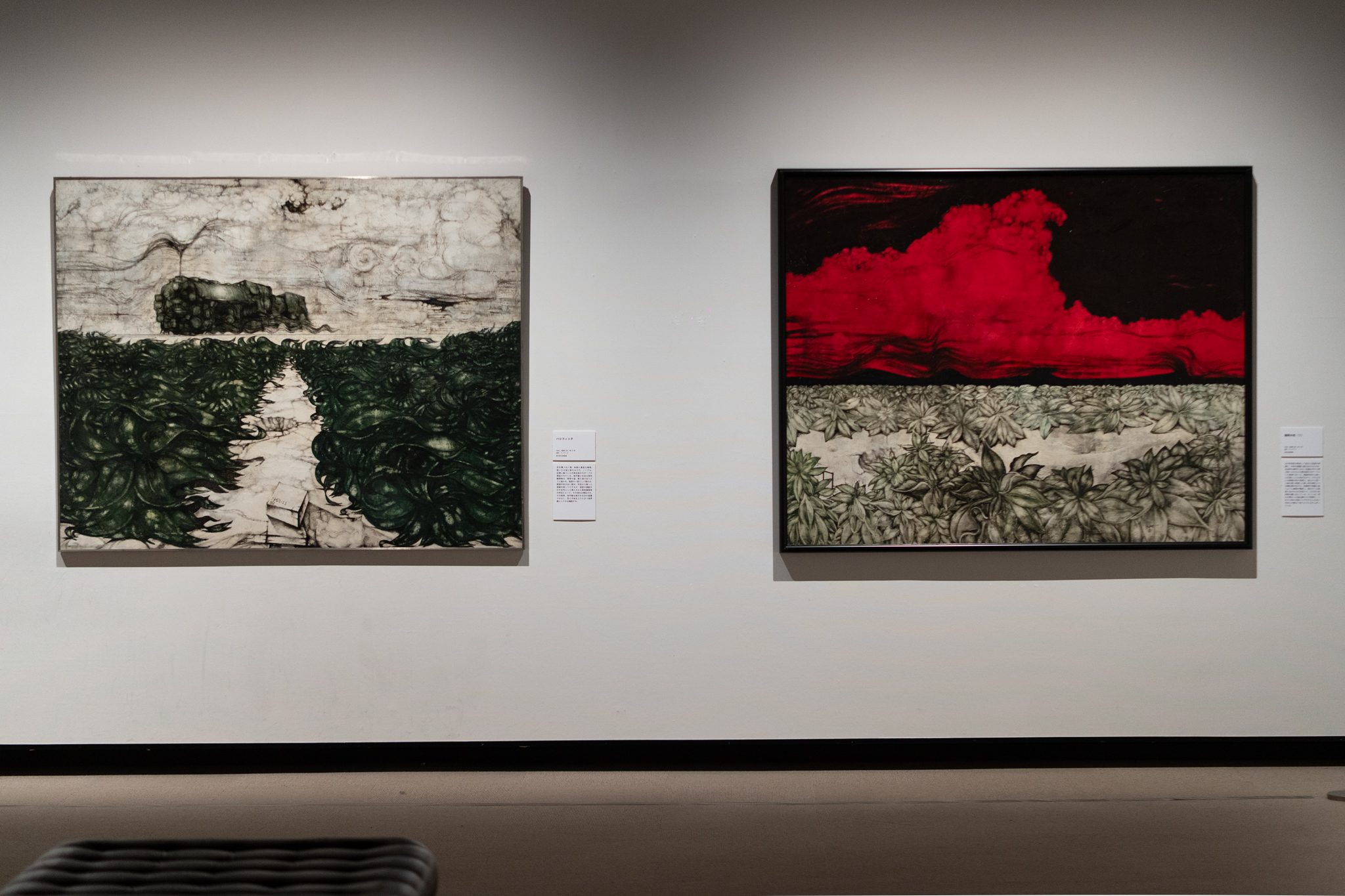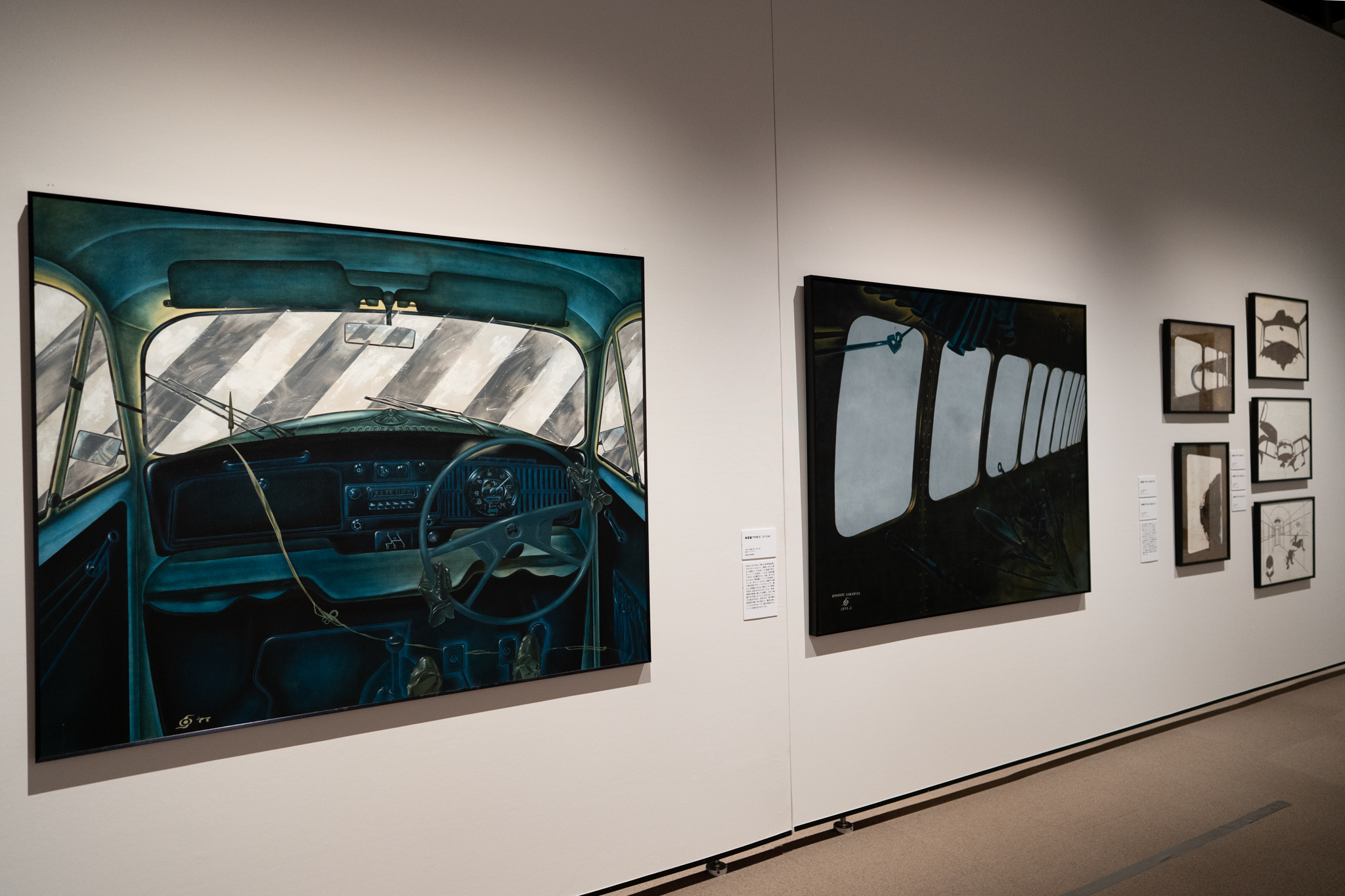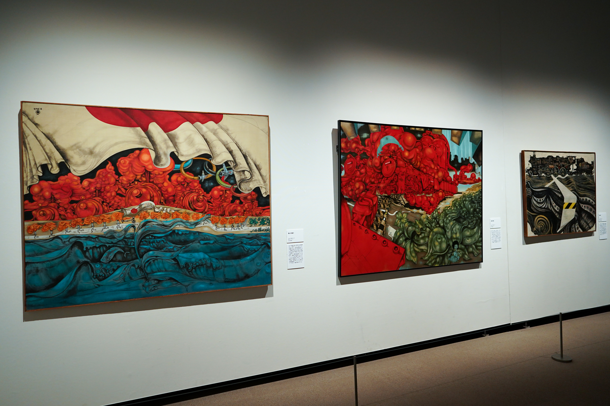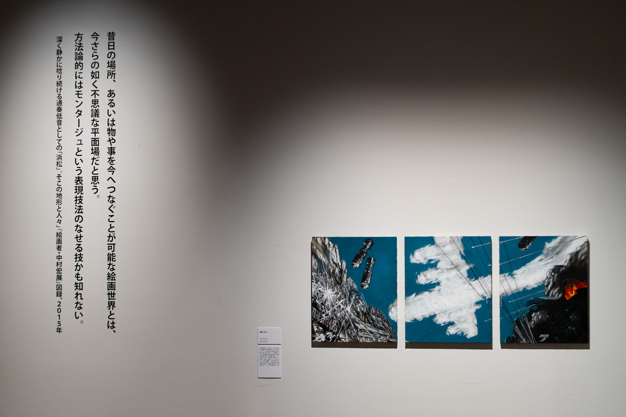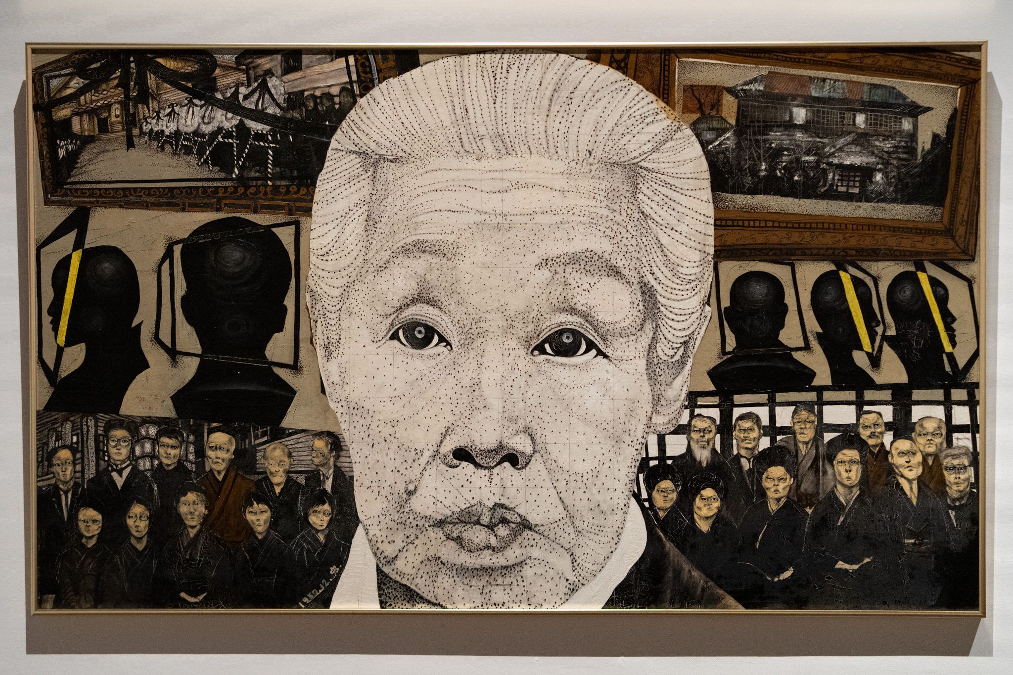 第2章「記憶の中の風景」は、中村が60年代前半に手がけた観念的な風景の作品や、自身の家族を題材にした《四世同堂》などを紹介する。地平線や積乱雲、血のような鮮紅色が目を引く前者は郷里・浜松の三方原台地の景色を参照したと考えられるが、鑑賞者が多様に解釈できる匿名の風景として提示している。《四世同堂》は祖母の遺影を中心に、その銅像や葬儀場面、列席した家族の肖像をアルバムのように並べた。近年取り組んだ、太平洋戦争下で経験した空襲や防空壕の記憶を見つめ直した「戦争記憶絵図」の作品も並ぶ。
