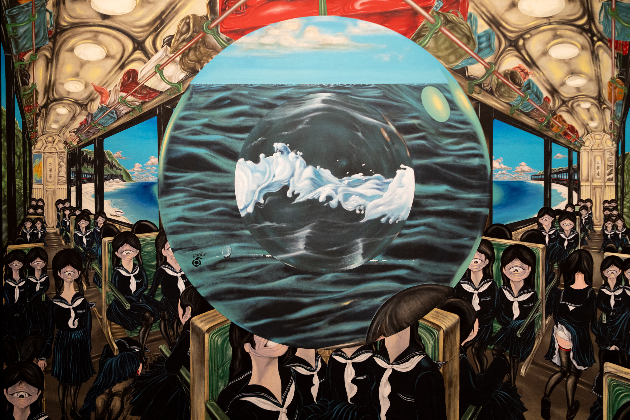 この時期の作品に現れる新たな要素が、望遠鏡を通じて拡大され円形に切り取られた「風景」だ。《円環列車・A-望遠鏡列車》は、ひとつ目の女学生集団が望遠鏡で眺める海景が画中画のように描かれる。「(他者が)見たものを見る」という、日常的に生じる視覚の入れ子構造を絵画化したとも言えるだろう。