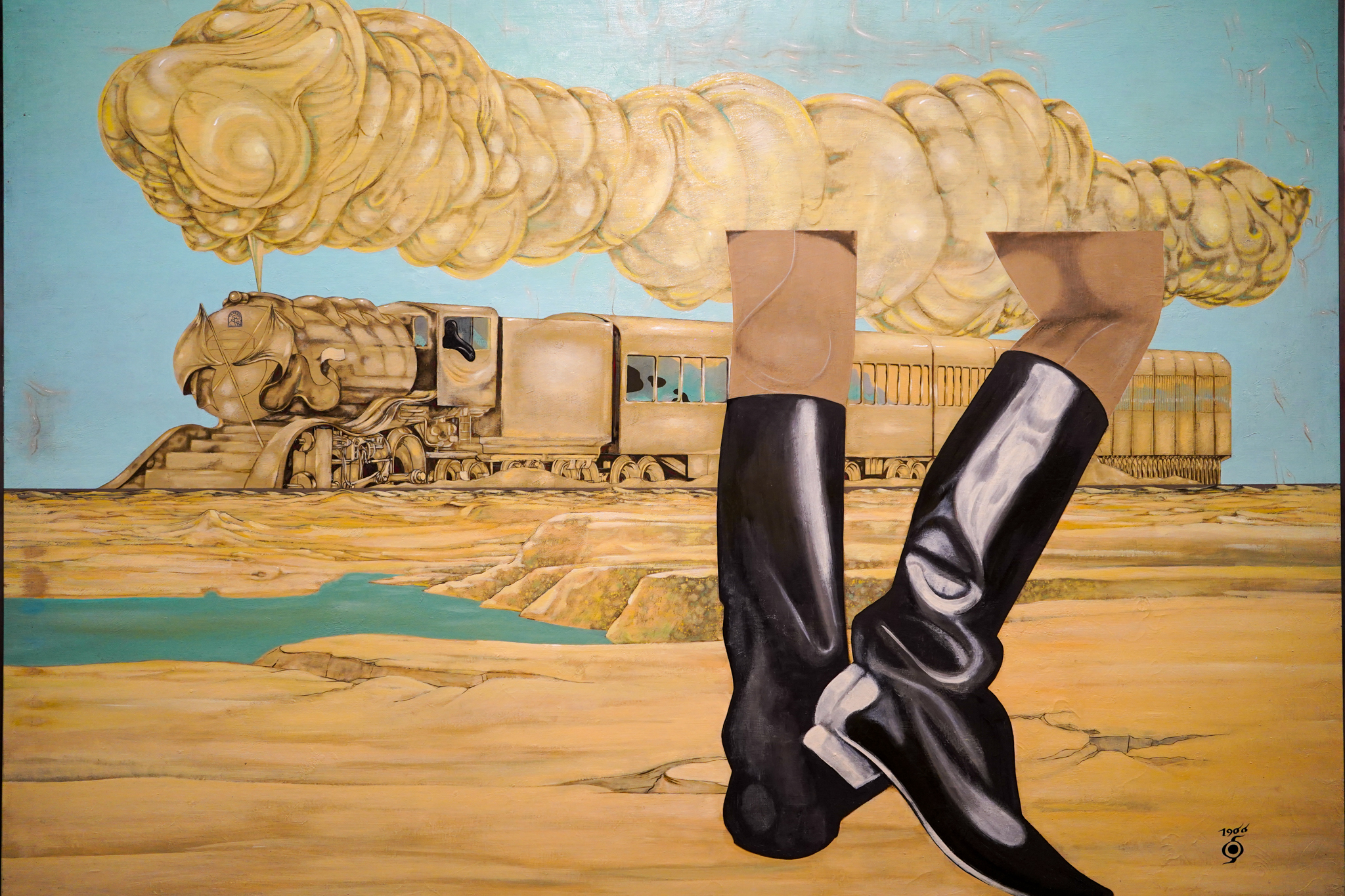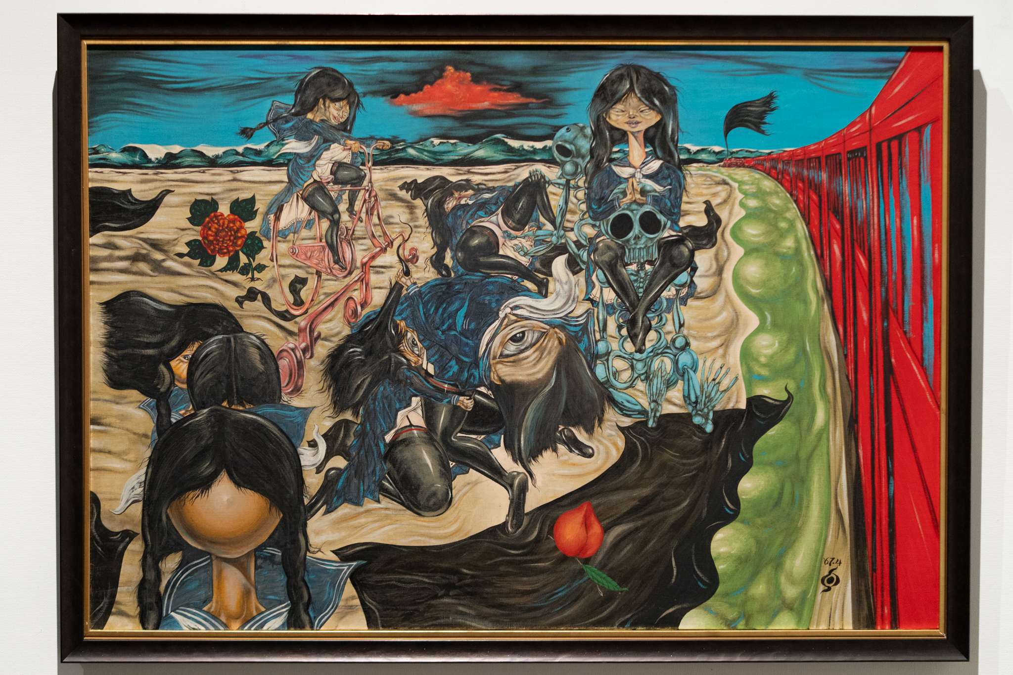 第3章「セーラー服と蒸気機関車」は、60年代後半以降、中村作品のアイコンとなるセーラー服姿の女学生や金属的な光沢を持つ機関車に焦点を当てる。いずれも自身の記憶に基づく観念的な「記号」だが、同時に通俗的なエロティシズムやフェティシズムを連想させる性質も持つ。これらを中村は「呪物」と呼んで繰り返し描き、鑑賞者の感覚を刺激して解釈を促す装置として用いた。女学生は土俗的気配が漂う「ひとつ目」や骸骨と戯れる姿にするなど強烈なキャラクター造形がなされ、生死や人知、社会規範を超える存在のようにも受け取れる。