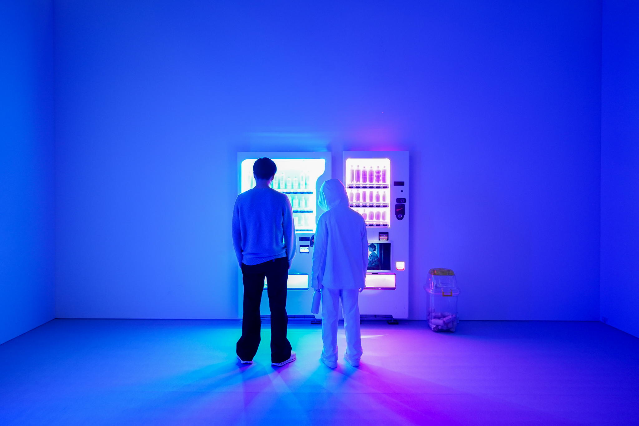 今回の個展では、3点のインスタレーションも発表している。《Encounter》は、自分の平面作品から抜け出してきたような人物の立体造形と自販機の作品で構成した新作。絵画として描いてきた空間を、鑑賞者がその内部を歩き回り、体感する場へ拡張した。