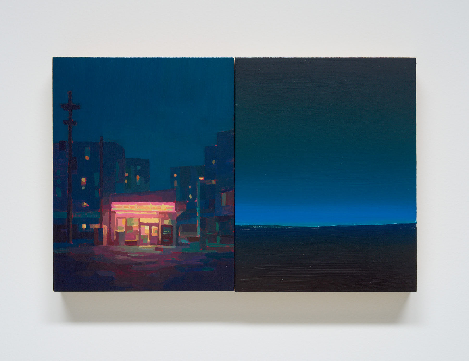 光への関心は、帰国後は作品の主要モチーフのひとつである自販機に向かった。国内のあらゆる場所に設置されている自販機は、都市生活の「記号」であると同時に、夜間は発光する人工の光そのものでもある。今回の個展でも、夜の風景のなかに自販機を配した作品を複数出品している。