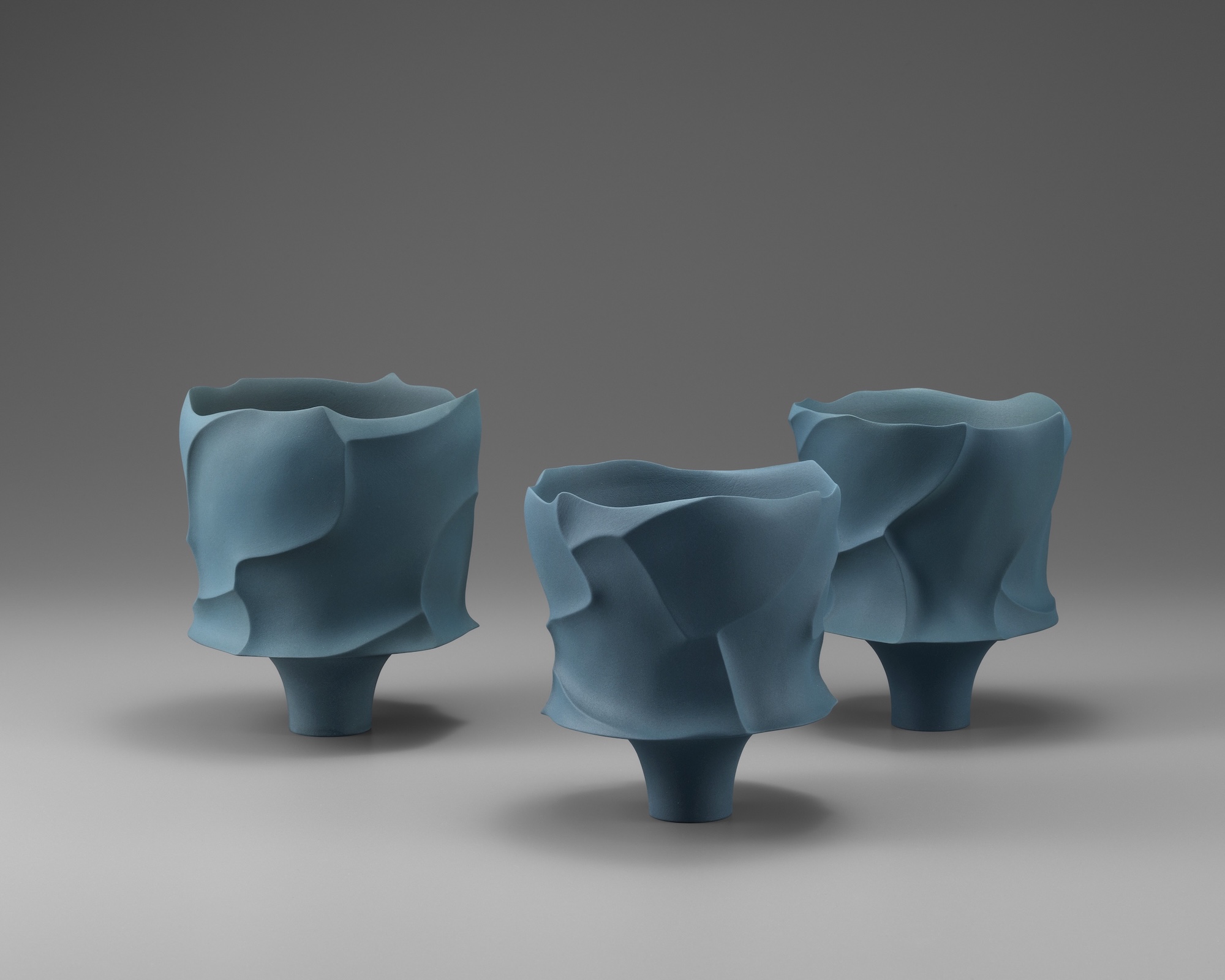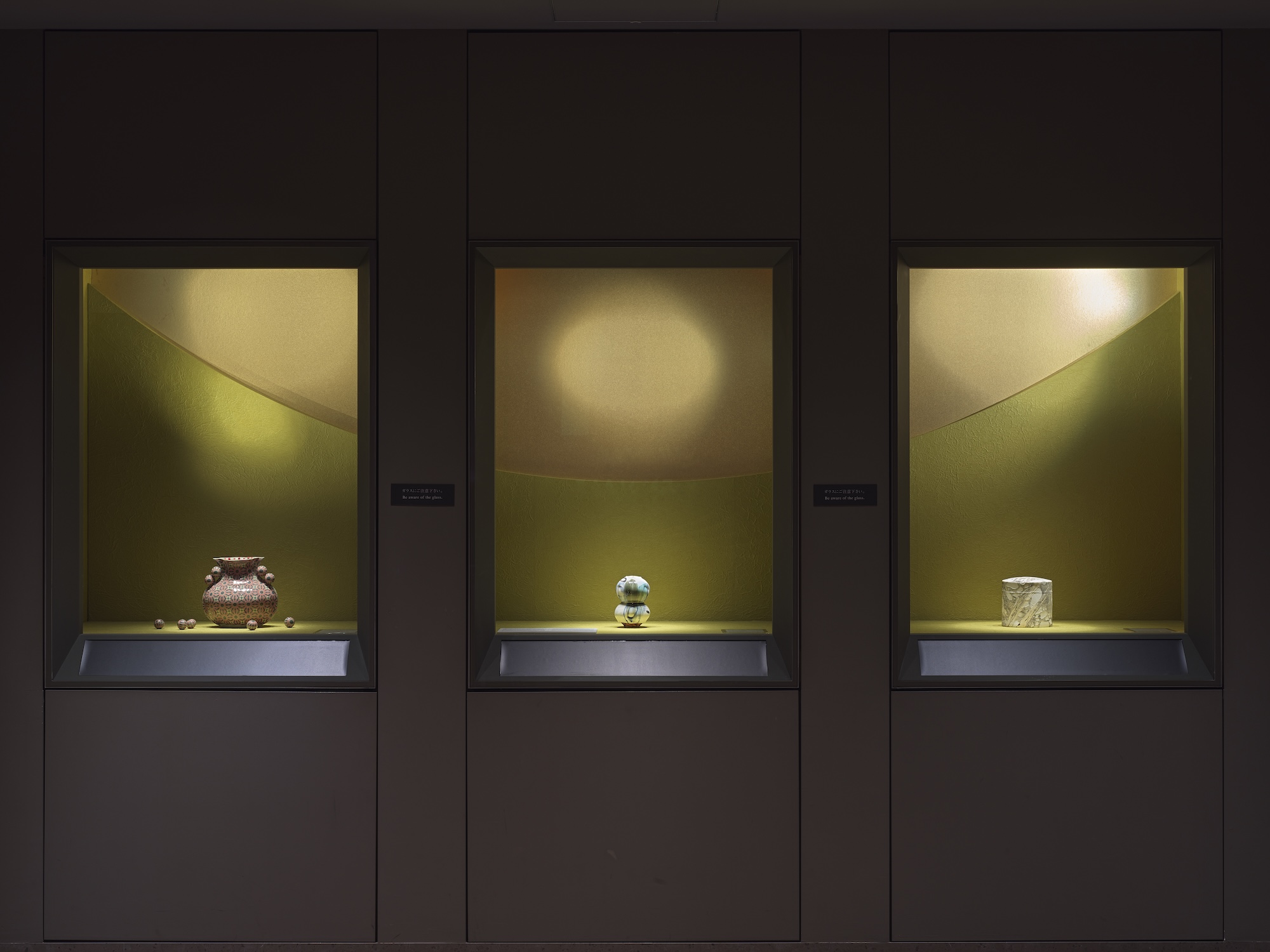 岡山県備前市内の鉱山で自ら採掘した磁器粘土を用いて、新しい時代の備前焼を追求する石田、ろくろ成形の過程で現れる痕跡や記憶との対話を3点の構成に表したチャウ、作品は小ぶりながら、ひょうたん型に多様な質感、表情で遊び心ある花器を制作したブラウンと、作家のバックグラウンドや用いる素材・技法も異なる様々な作品が並ぶ。
