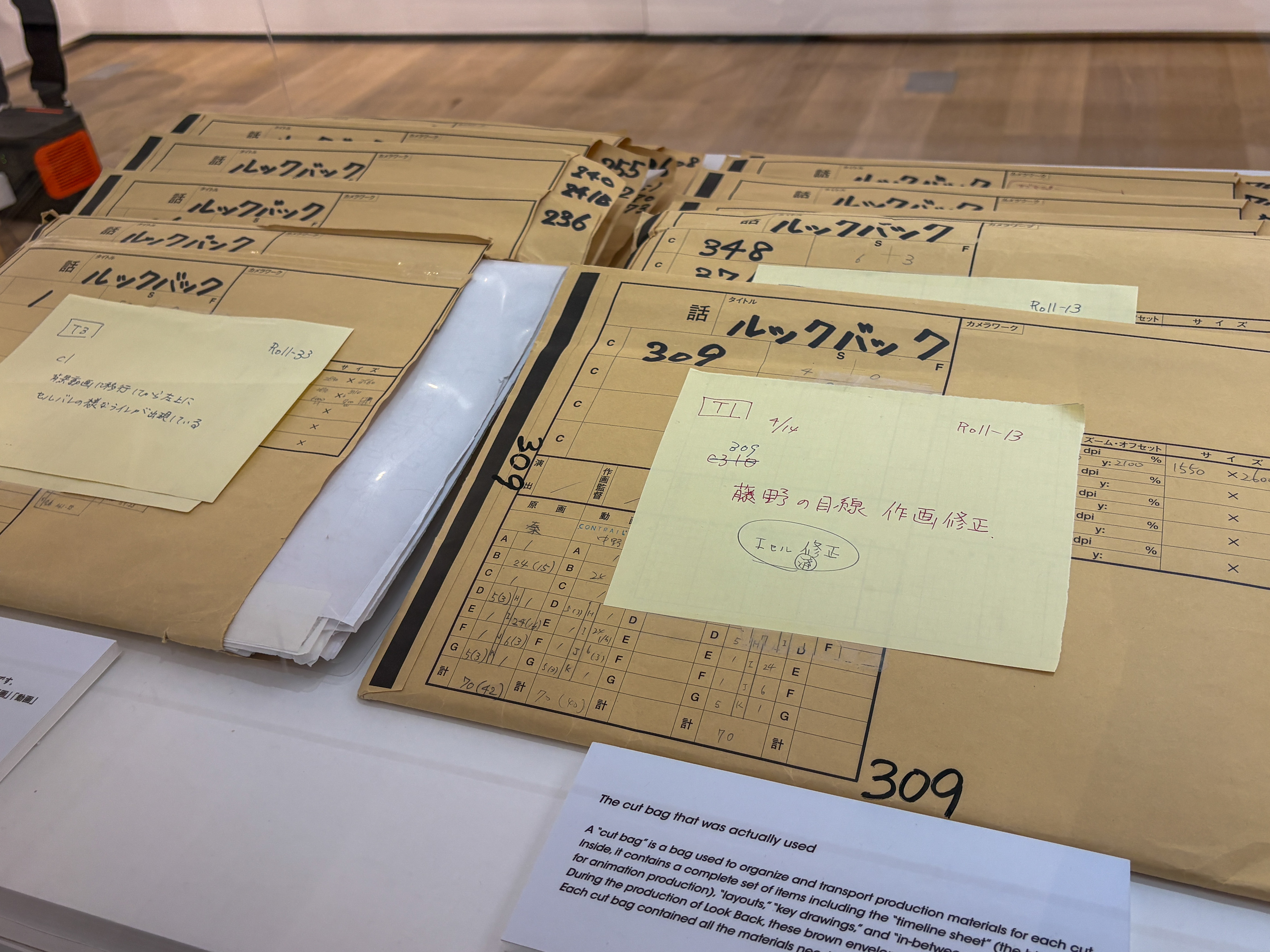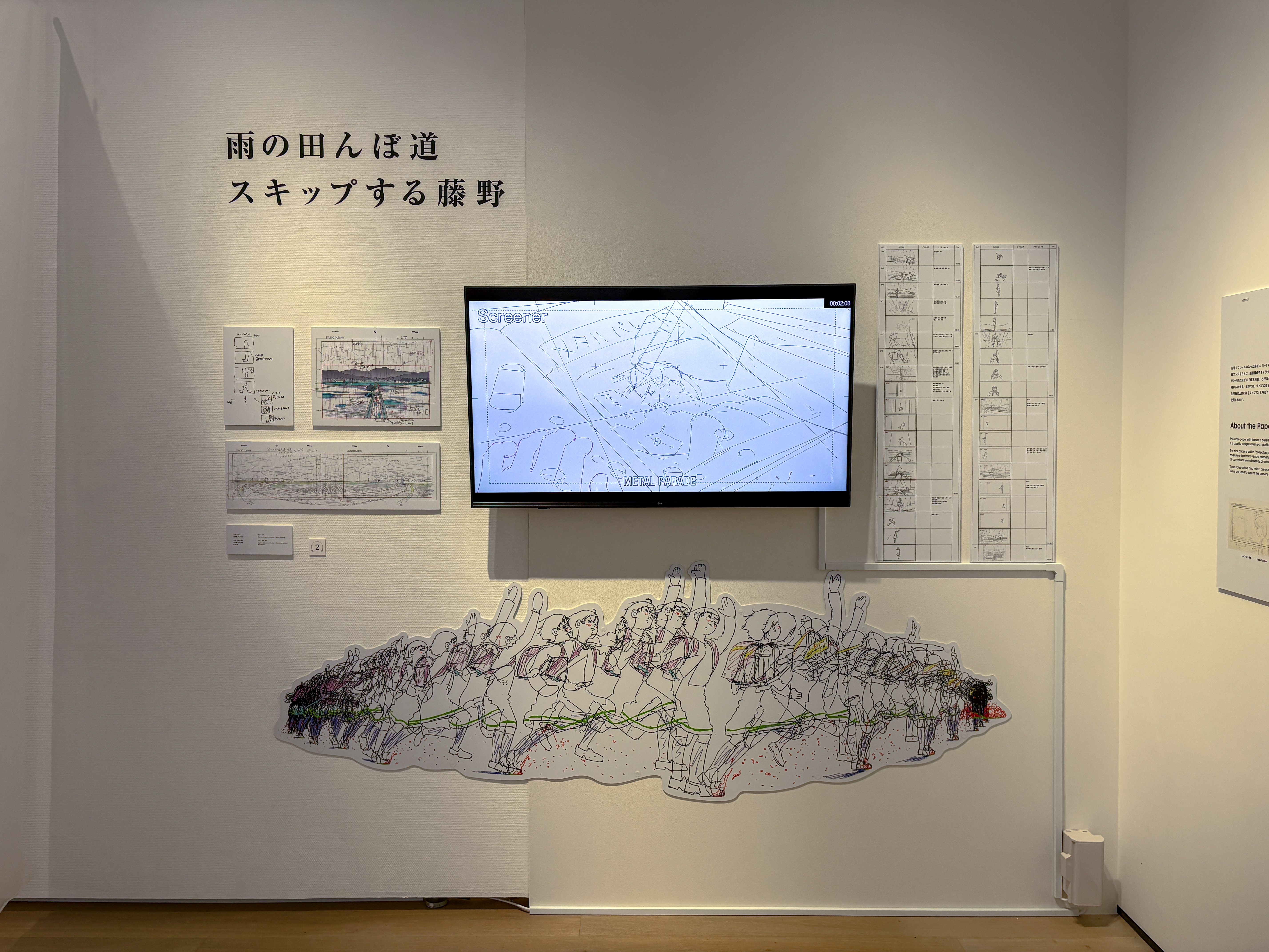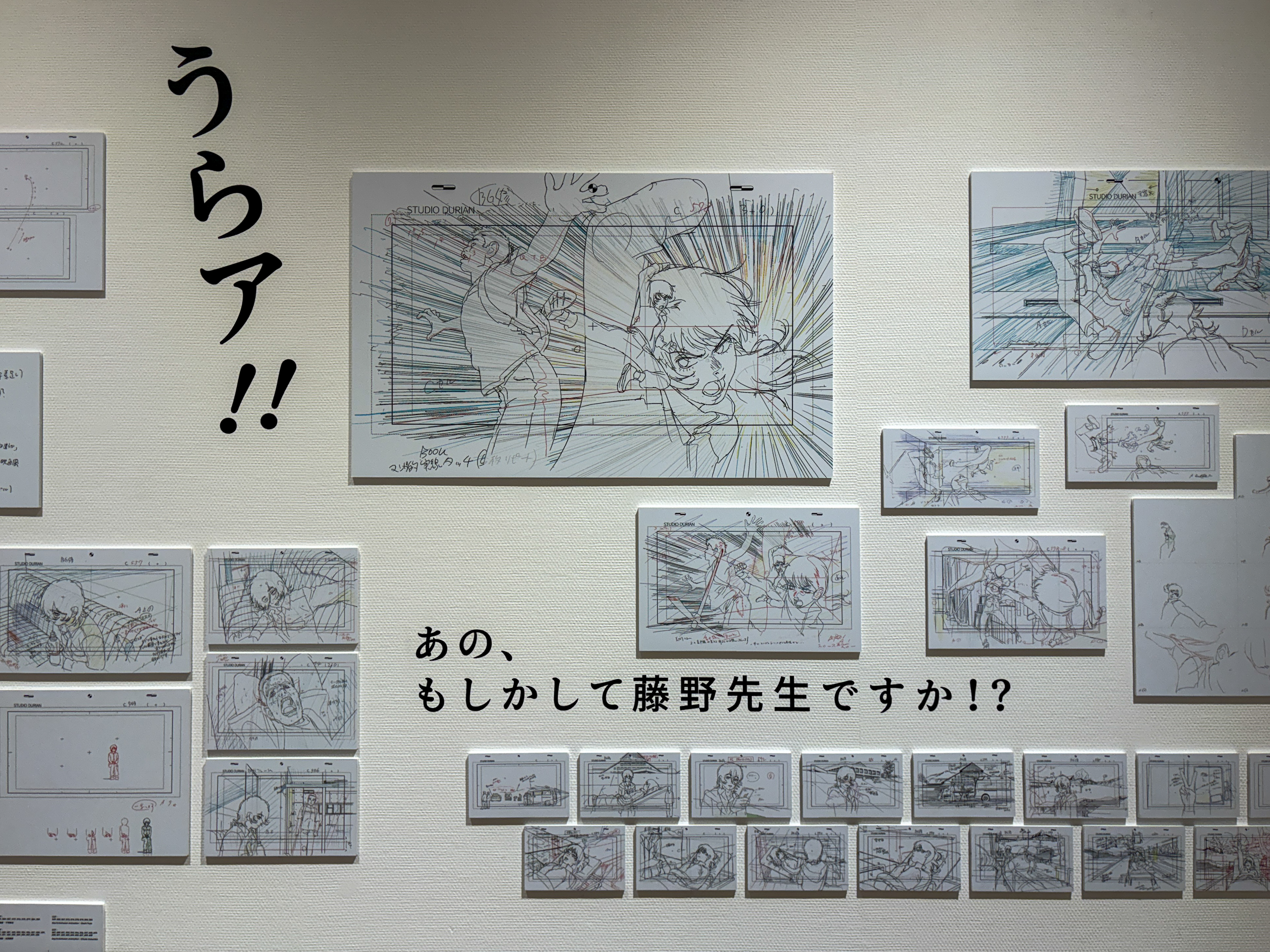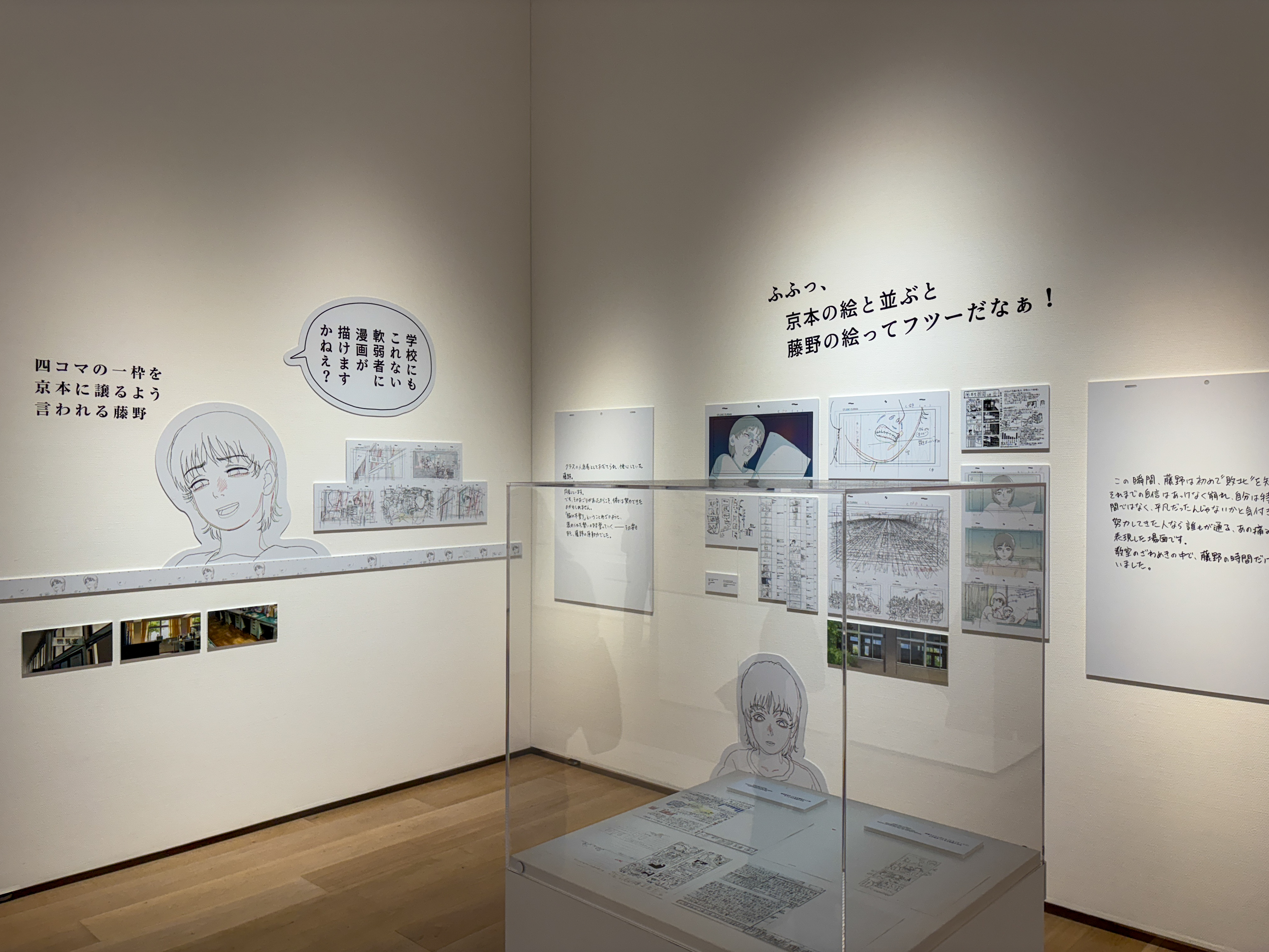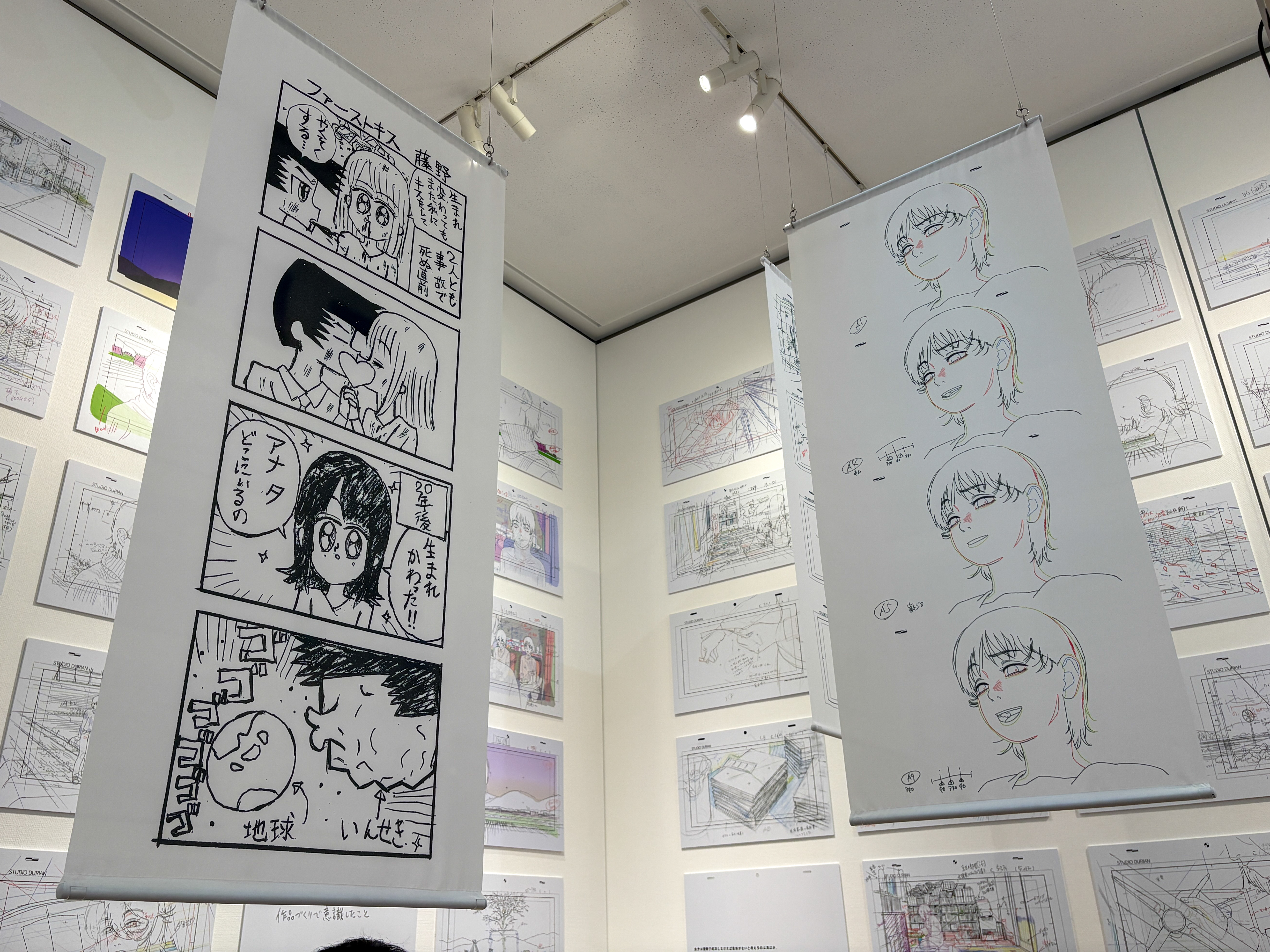 劇場アニメ『ルックバック』の上映特典として数量限定で配布された藤本タツキの『ルックバック』制作時のネームや、本展キービジュアルの原画ならびに背景ボード、押山清高が本展のために描きおろしたマンガなど、ここでしか見られないコンテンツが数多く紹介されていた。