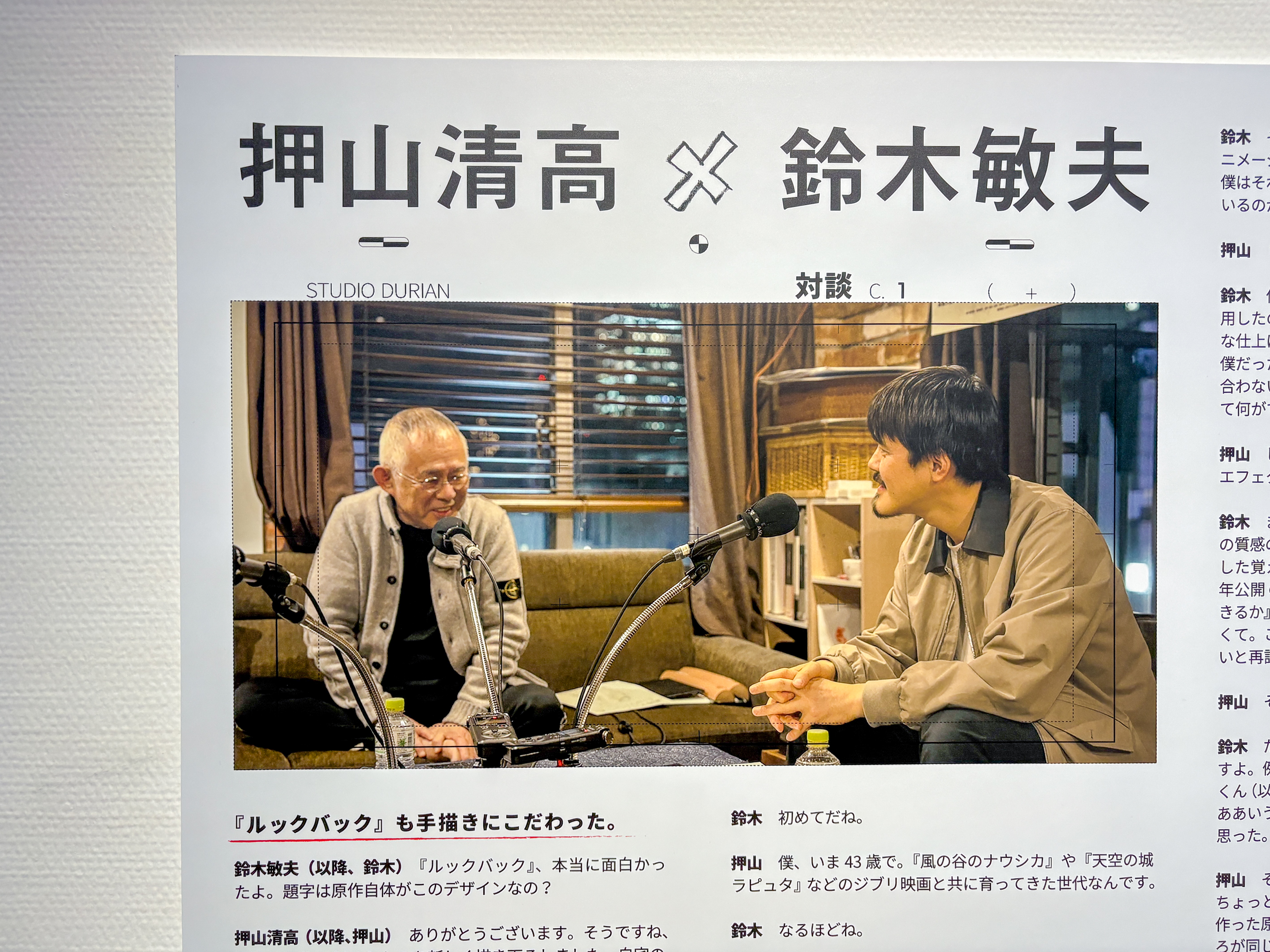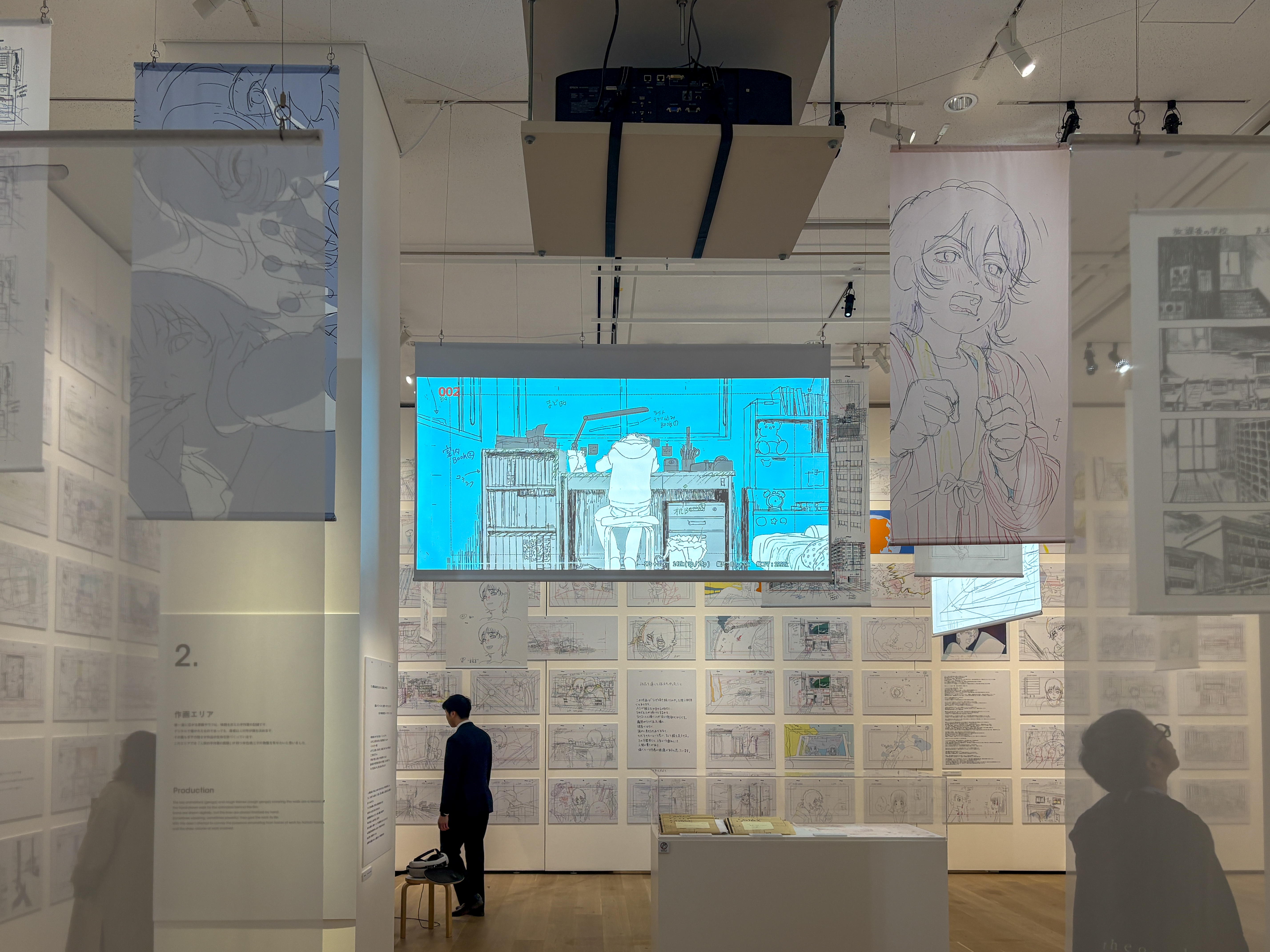 また、本展の開催を記念してスタジオジブリの鈴木敏夫との対談も実現。会場にはその対談の一部が展示されている(全文は図録に掲載)。押山監督は元々スタジオジブリのアニメーターとして『借りぐらしのアリエッティ』や『風立ちぬ』の原画を務めていた。パネル展示を通して、スタジオジブリでの仕事の記憶や、日本のアニメーションへの想いについて、ふたりの会話を追体験することができる。