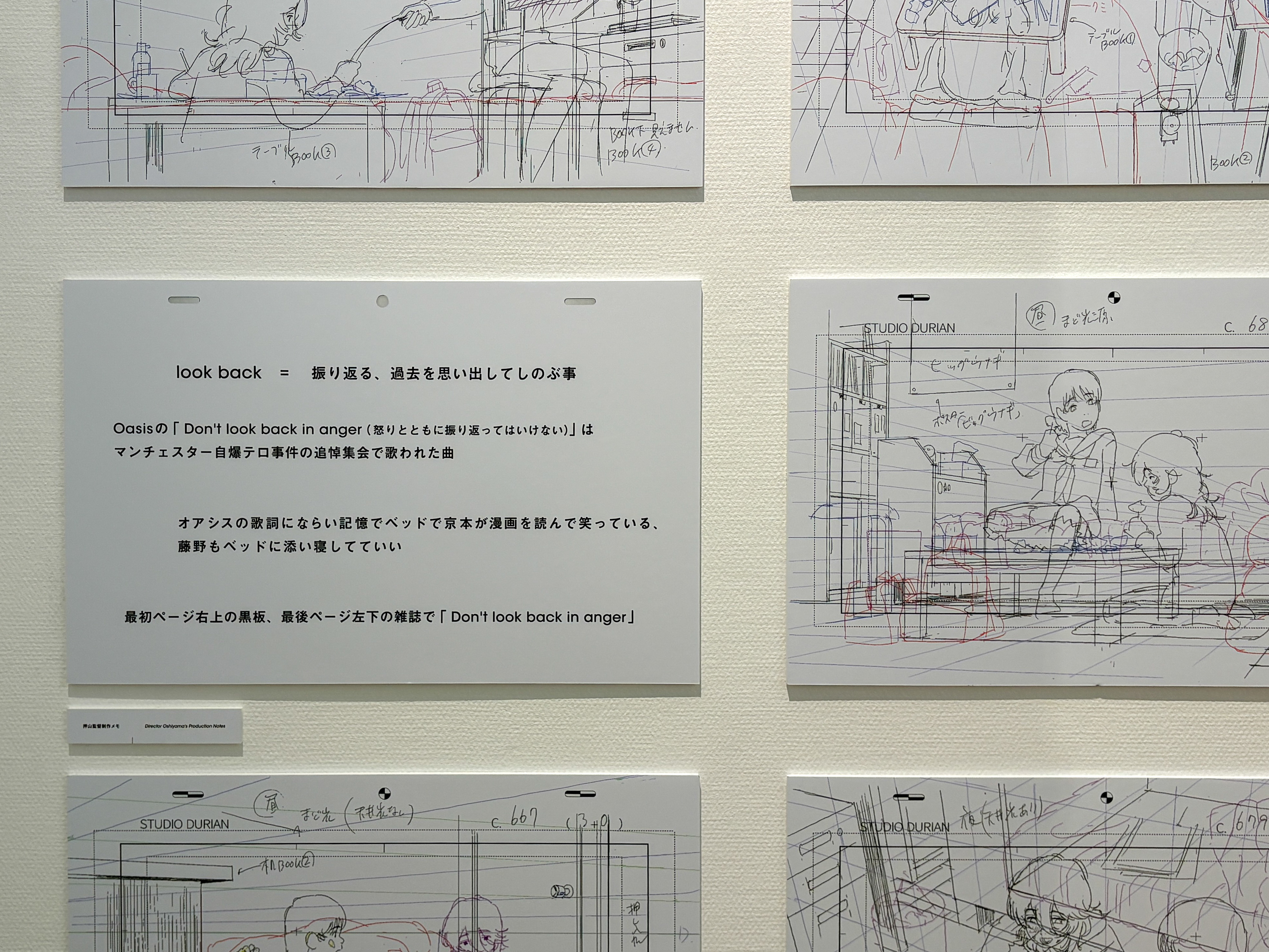 原画の森のなかで目をこらしながらキャプションを読むと、制作陣が作品に込めた細かすぎるこだわりが見つかることもある。たとえば、作中で京本がベットに横たわりながらマンガを読んでいるシーンには、英ロックバンド・オアシスの名曲「Don’t look back in anger」へのオマージュが込められていた。この楽曲はマンチェスター自爆テロ事件の追悼集会で歌われたという背景を持っており、作品後半の追想シーンでは同楽曲を想起させるモチーフが散りばめられている。