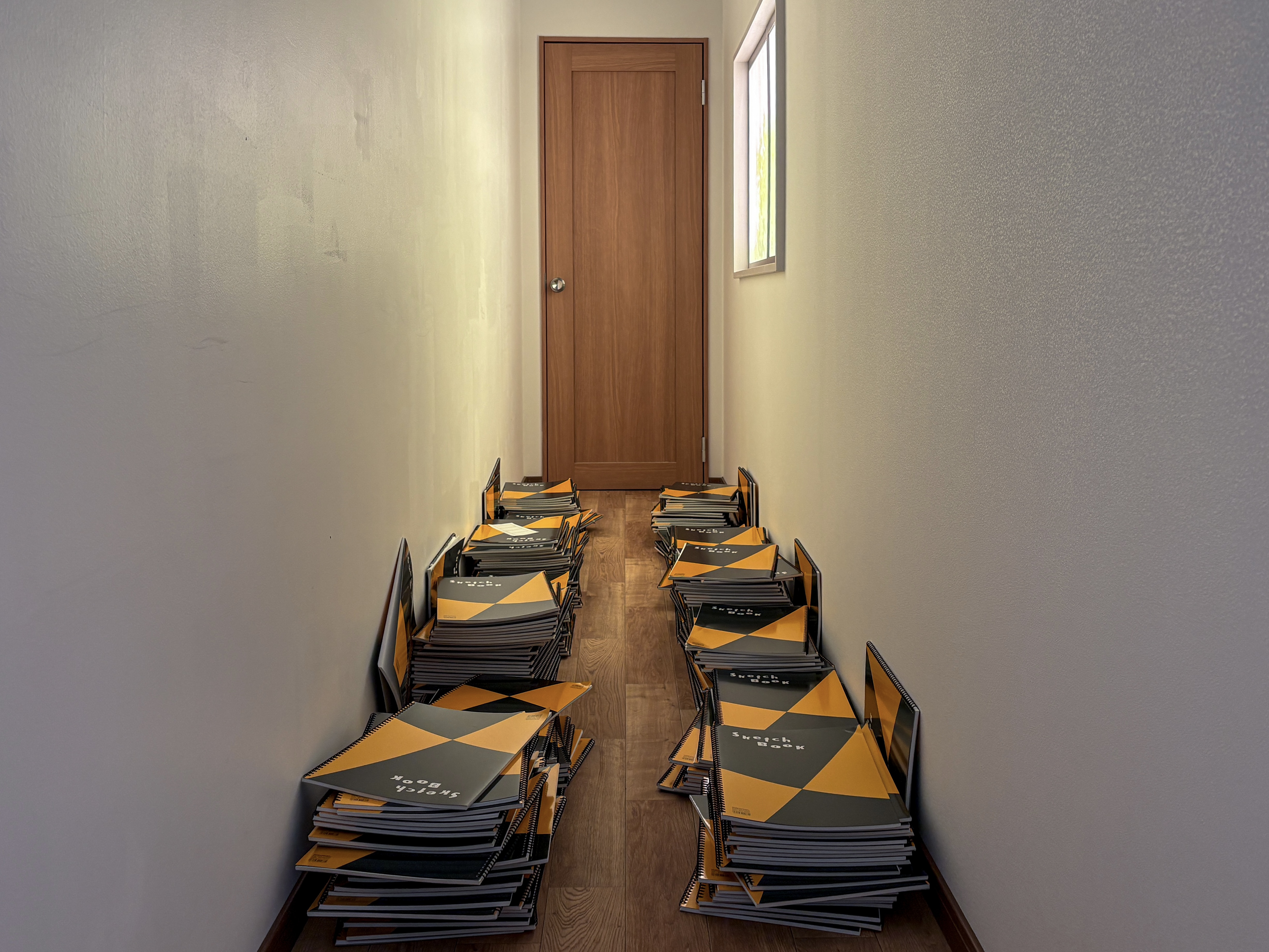 会場に入ってすぐ広がる「映像エリア」には、藤野が雨の田んぼ道をスキップする場面が映し出されている。藤野が描くことに立ち返るこのシーンは、パラパラマンガ、静止画、そして一冊のスケッチブックへとそのかたちを変化させ、"描く"という行為そのものに光を当てる展覧会のテーマを象徴する。