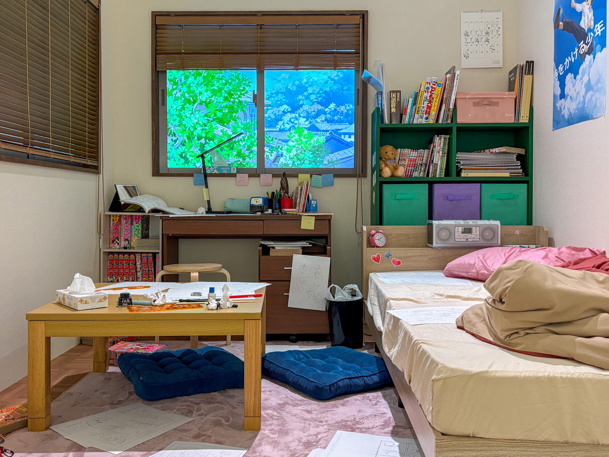 また、会場には藤本と京野のふたりが制作活動を共にした藤野の部屋、さらに京本の部屋に続くスケッチブックが積みあがった廊下、そしてふたりの絆を象徴する半纏(はんてん)の再現展示もある。物語が動き出すキーポイントとなる部屋を中心に、劇場アニメ『ルックバック』の世界観を体感することができるコーナーだ。