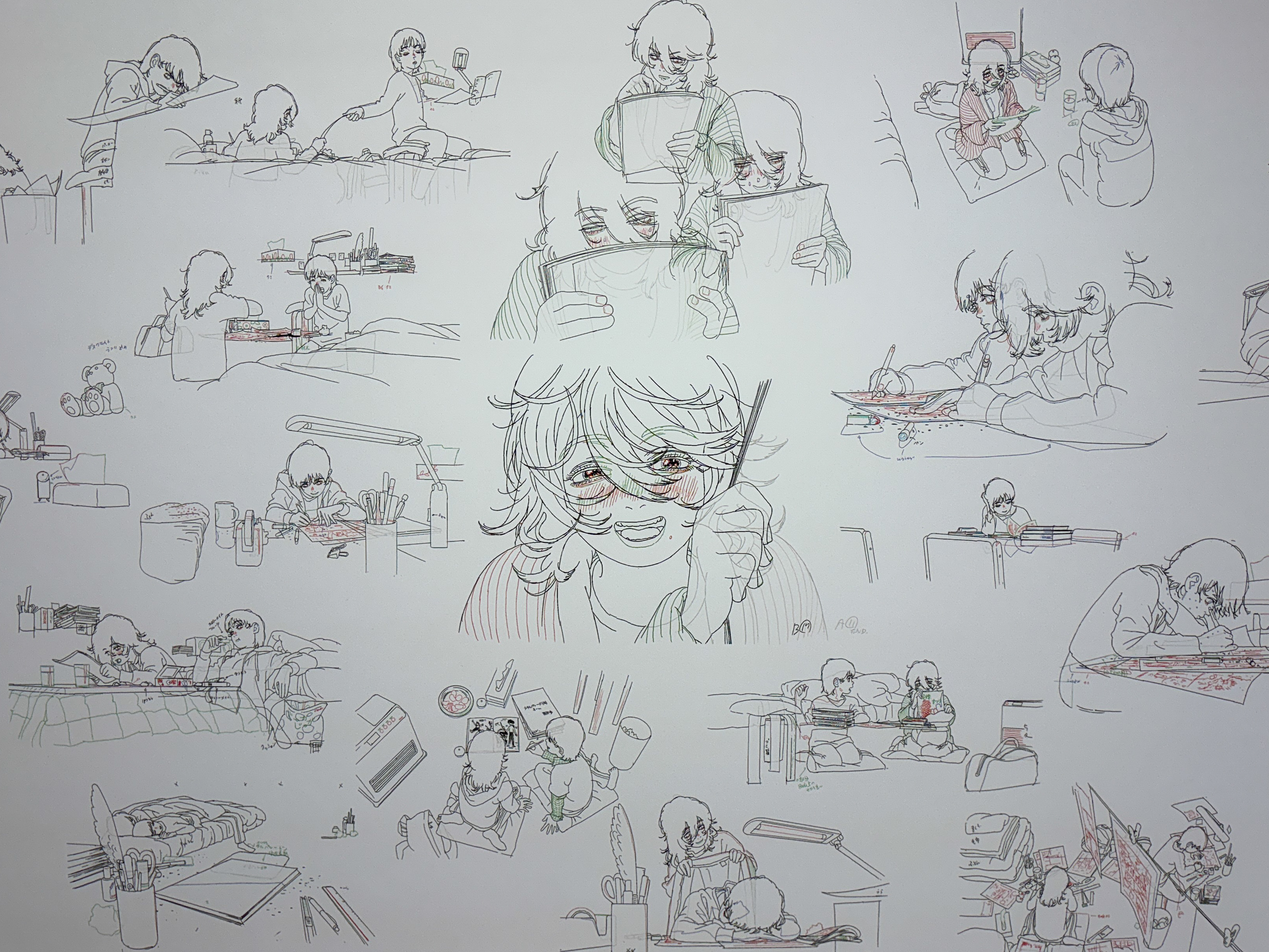 つづく「作画エリア」では、押山をはじめとするアニメーターの、劇場アニメ『ルックバック』にかけた熱量を感じられる原画の数々が部屋中を埋め尽くす。この"作画トンネル"を構成するのは、メモや設定画、原画など、どれも本展が初公開となる資料ばかり。わずかな揺らぎや力強さを残した「人間の手作業の痕跡」が、その存在感と物量によって鑑賞者を引き込む。