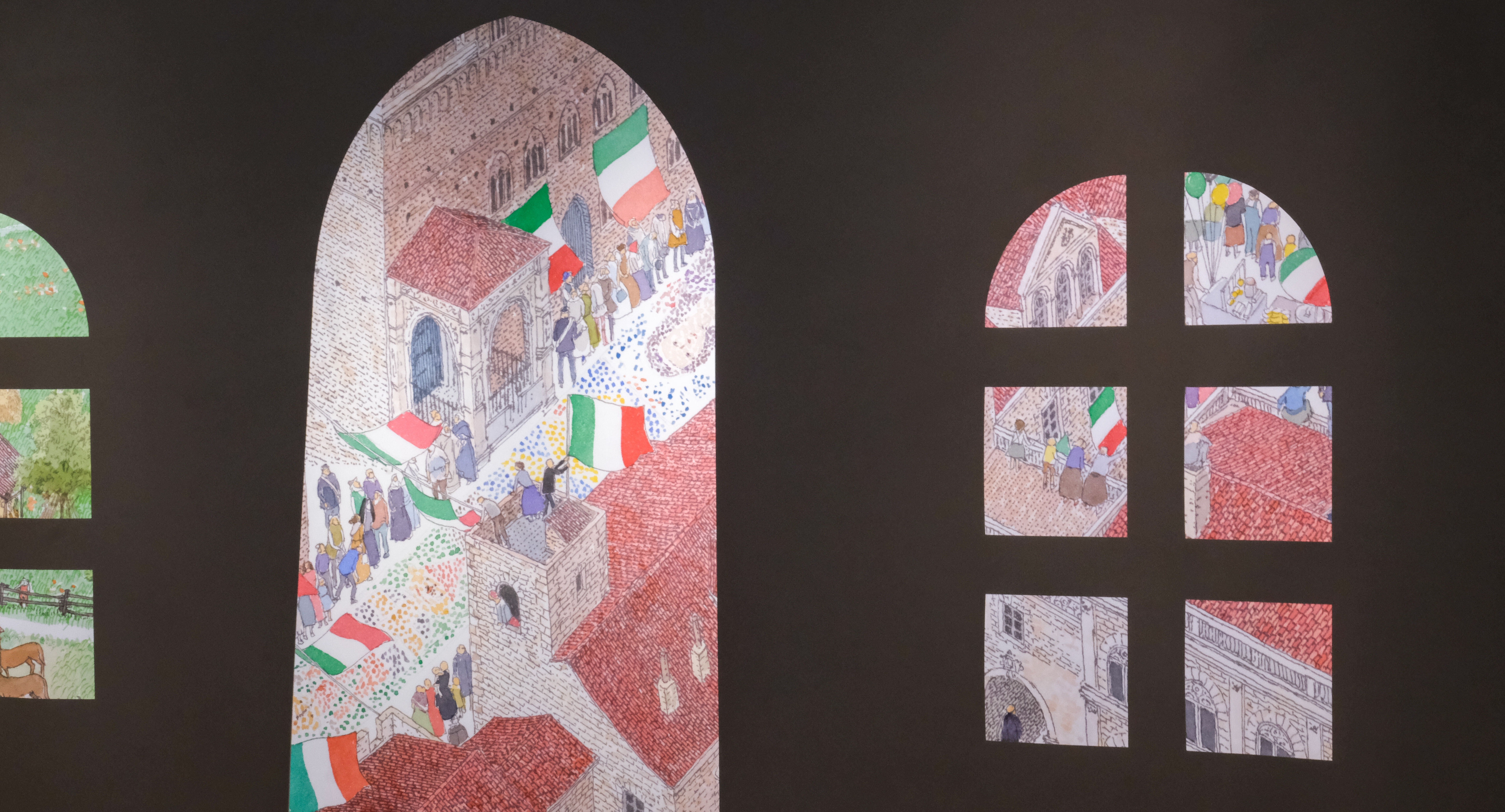 本展の見どころのひとつが、「旅の絵本」シリーズだ。1977年、安野がヨーロッパを旅した際、着陸間際の飛行機の窓から見た風景に着想を得て誕生した。街並みや自然、そこに暮らす人々の気配を、水彩の透明感と緻密な描き込みで表現しながら、画面のどこかに物語の断片や引用、見落としそうな小さな仕掛けを忍ばせる、安野ならではの視線の誘導が堪能できる。