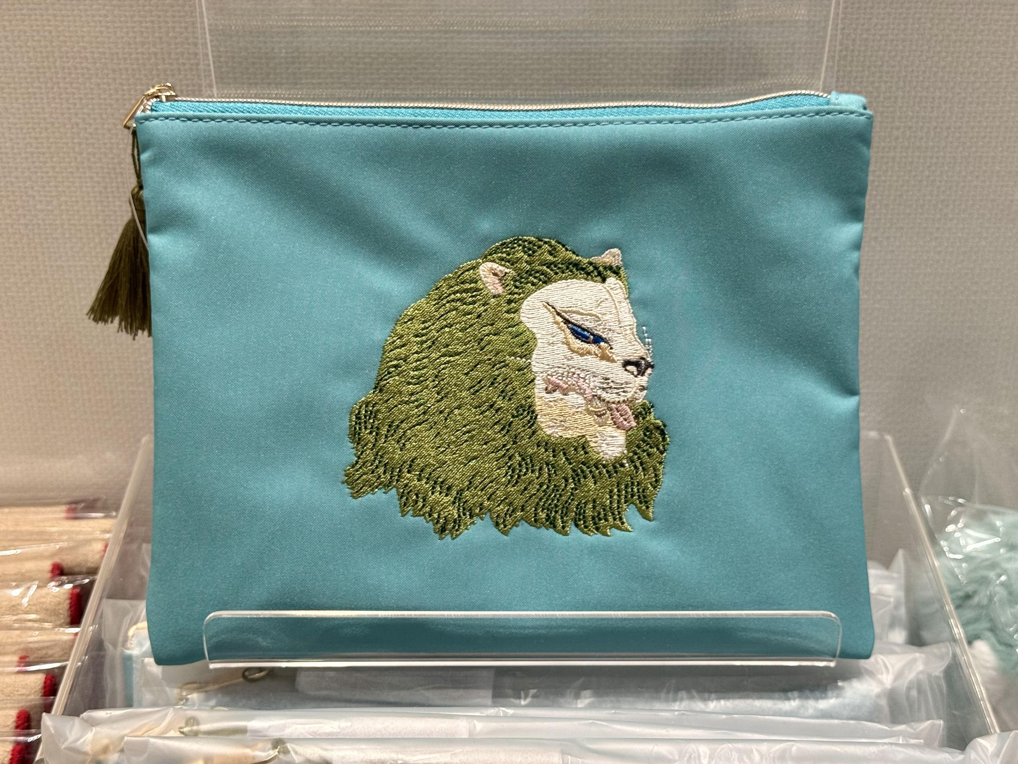 《獅子図屏風》の獅子を刺繍で落とし込んだポーチ。威厳たっぷりの獅子頭をやわらかなテキスタイルに置き換えているのがおもしろい。2530円(税込)。