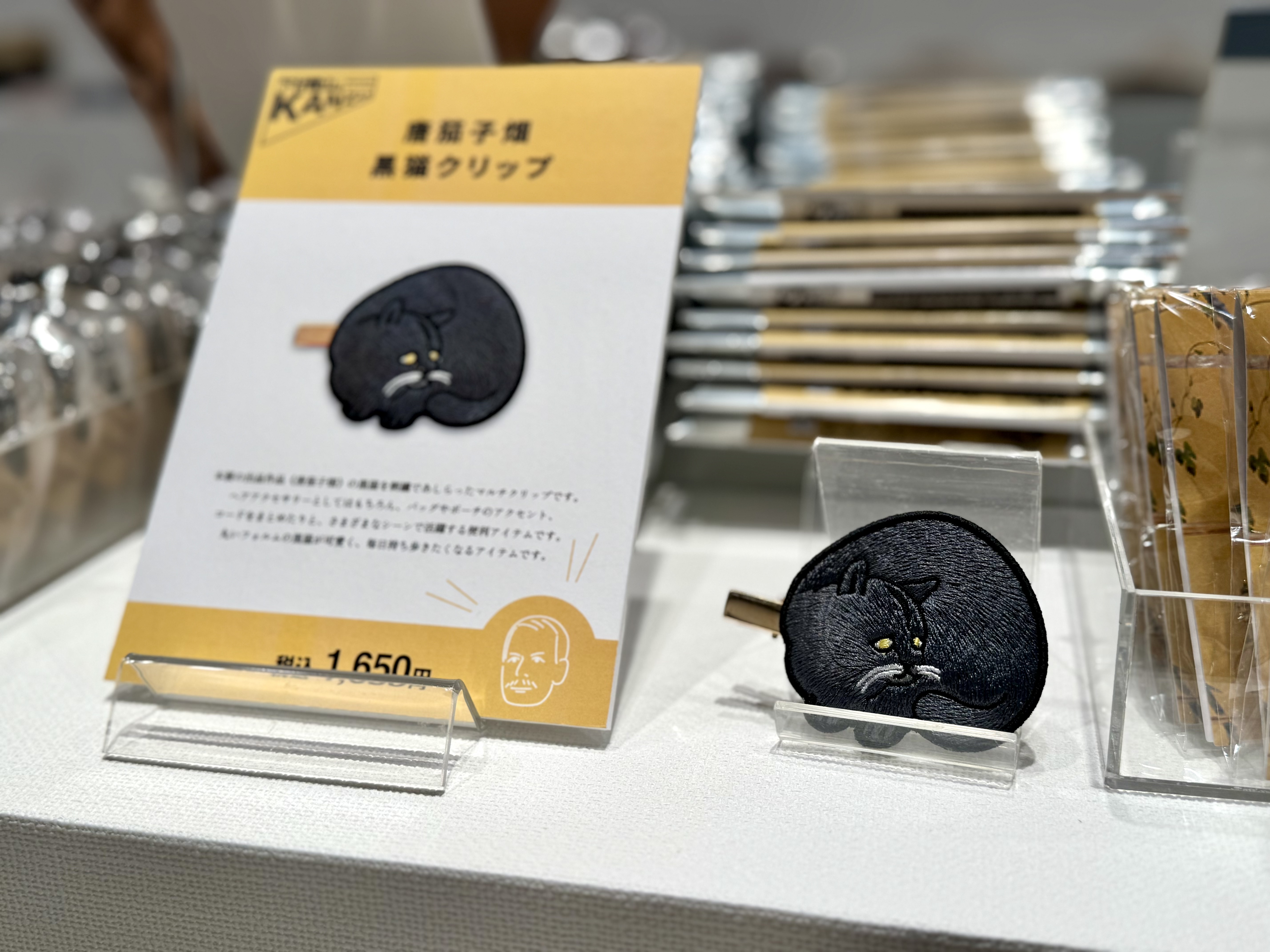 《唐茄子畑》に登場する黒猫をかたどった刺繍クリップ。髪につけるのはもちろん、バッグやポーチ、コーディネートのアクセントにも使えるので、実用品としての満足度も高い。1650円(税込)。
