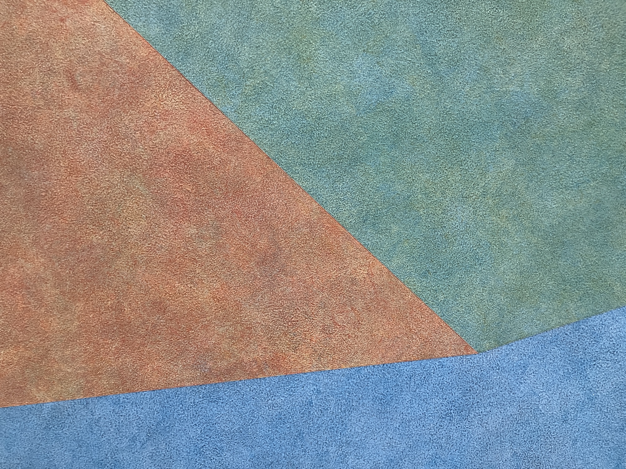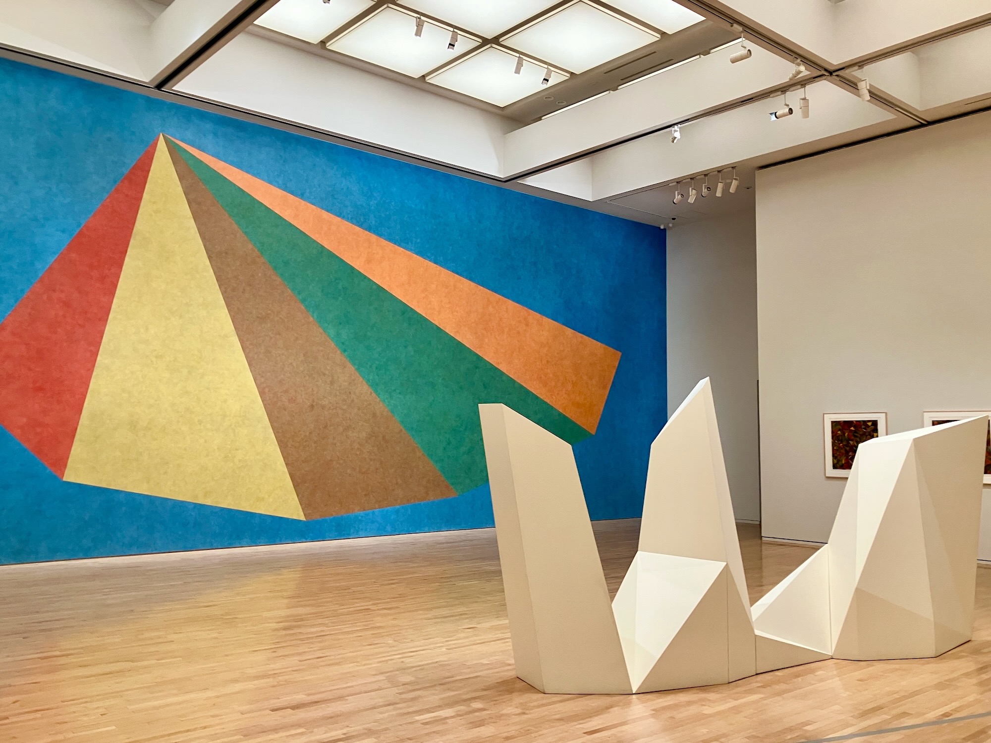 しかしそれらも、当初の簡潔なアイデアに基づいたものであり、《ウォール・ドローイング #770》における非対象なピラミッドの各面は、「位置」シリーズの基本形態から派生している。また暗みがかった赤や黄色、深い緑、茶色などの色合いも、ルウィットが重視した三原色である青、赤、黄とグレーを壁面で塗り重ねることで生み出されており、近づいて見ると茶色の面のなかに赤や黄色があるのがわかる。