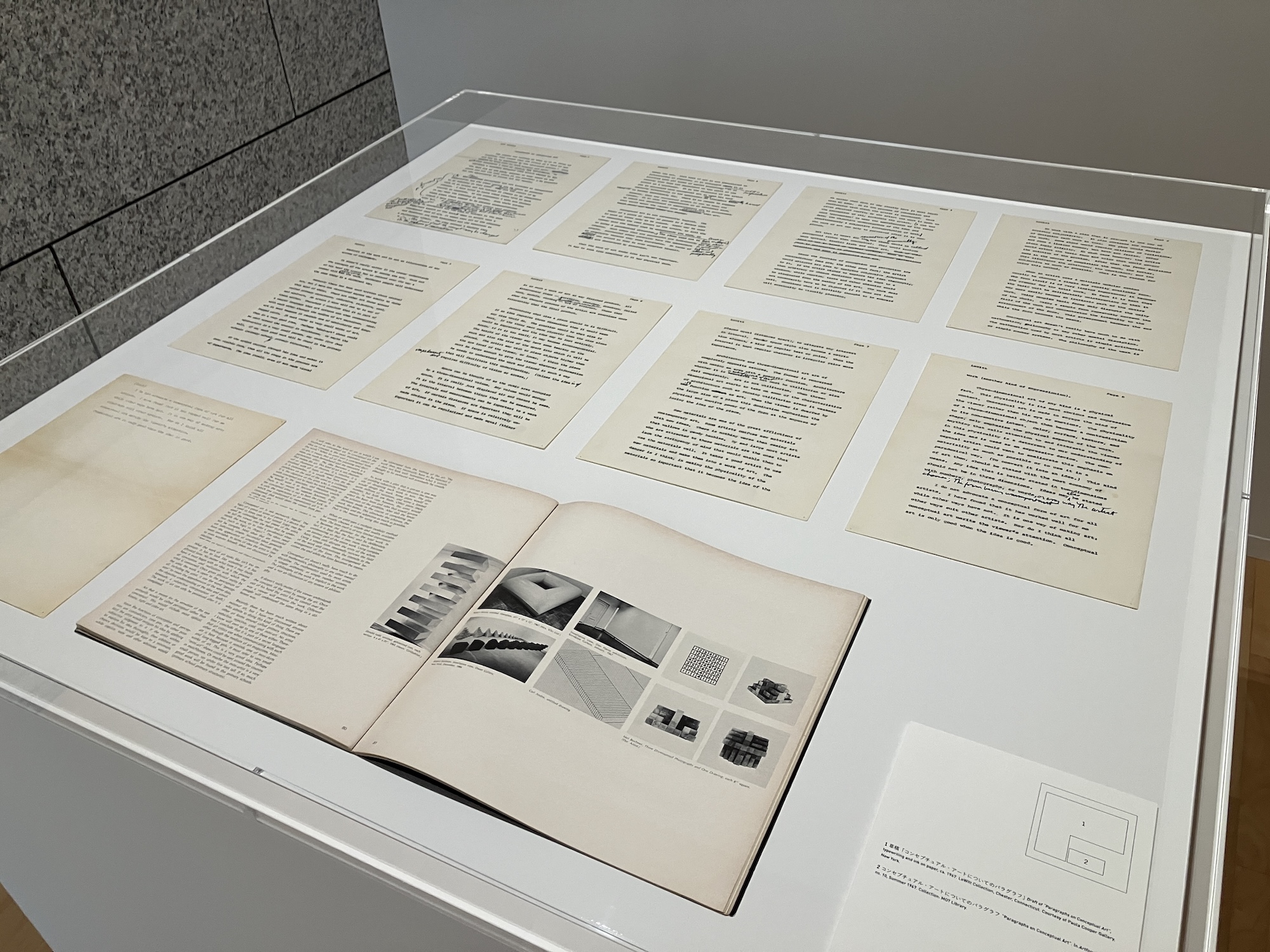 展示後半では、自身のアイデアを人々と共有することを重視したルウィットが、晩年まで作品として制作し続けたアーティスト・ブックや書籍が紹介される。「コンセプチュアル・アートについてのパラグラフ」の草稿も展示され、作家の思考のプロセスをたどることができる。