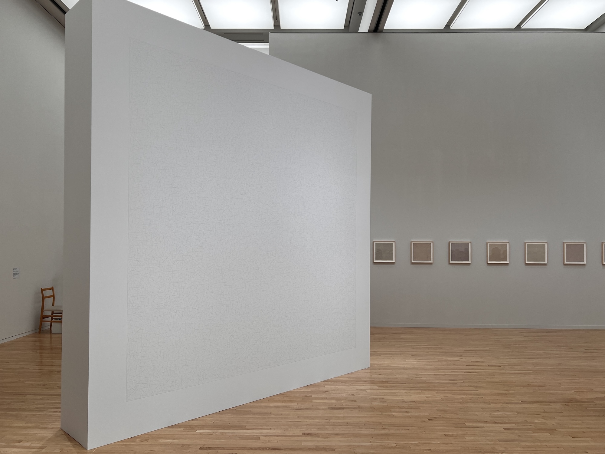 本展で最初に目にするウォールドローイング《ウォール・ドローイング #46》は、ルウィットが初めて直線ではない線を用いたウォール・ドローイングの作品。友人であったアーティスト、エヴァ・ヘスの早逝を受け、「作品を通してふたりのつながりを残したい」とのアイデアから構想された。定規を用いずにフリーハンドで引かれた無数の線が白い壁を覆っているが、本作において「非直線」や「最大密度」という指示の解釈は描画者に委ねられている。