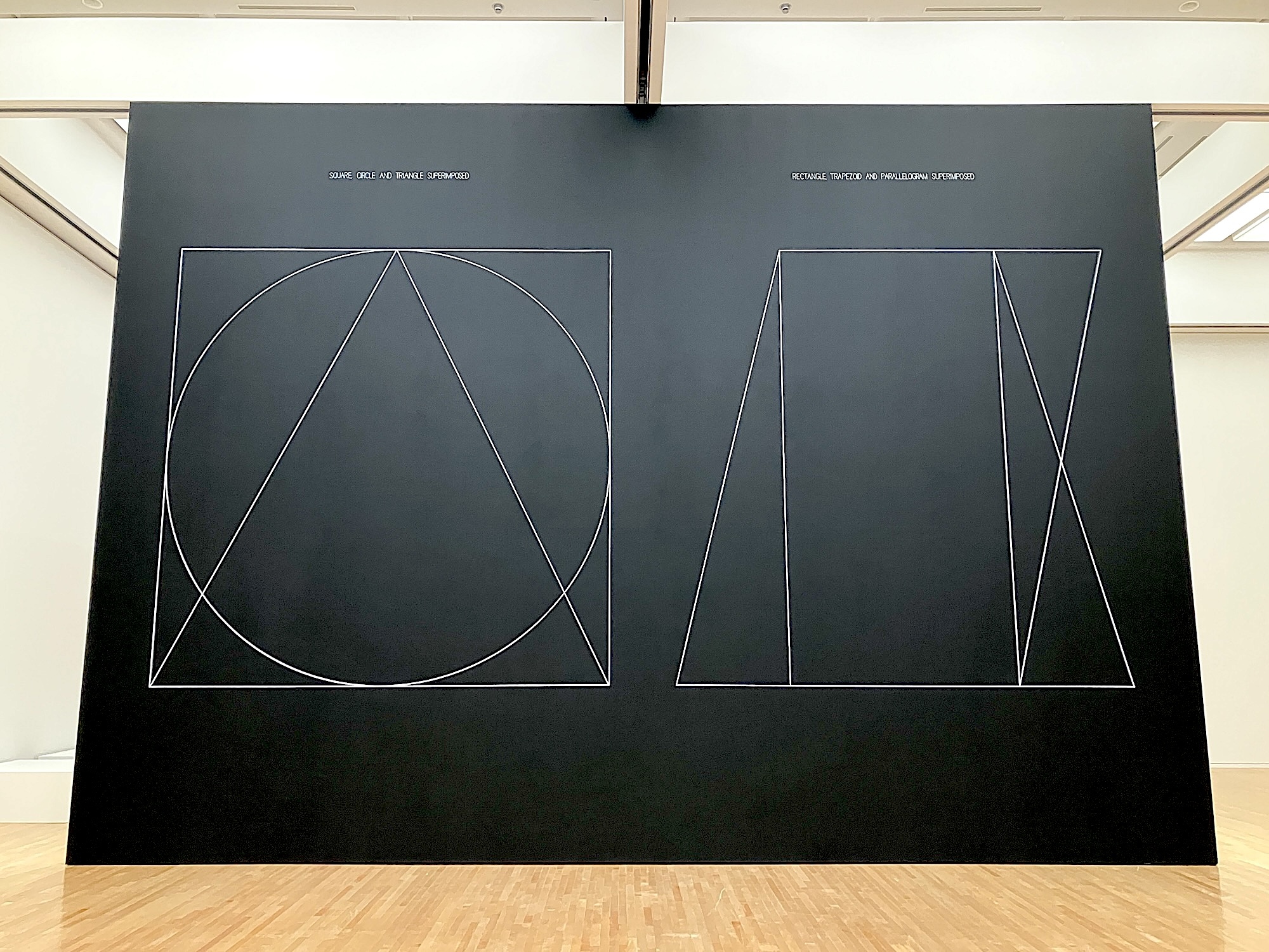 黒い背景に円と三角形、四角形の組み合わせが描かれた《ウォール・ドローイング #312》は、1978年に初めて展示された作品。正方形と立方体を基本となる形態として用い始めた1960年代に対し、1970年代以降はウォール・ドローイングに幾何学的なかたちが用いられるようになった。ここでも「正方形、円、三角形が重なる」「長方形、台形、平行四辺形が重なる」という指示が作品のなかに描かれている。