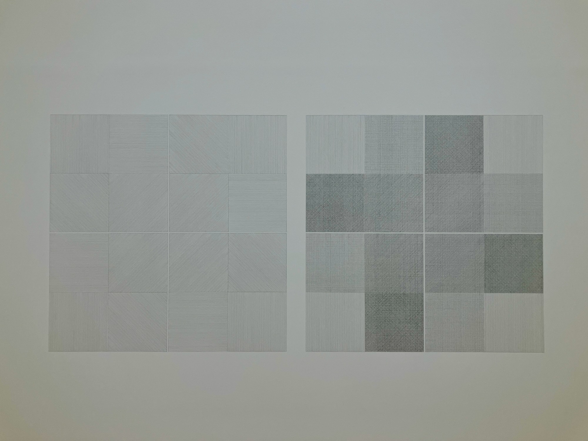 「ドローイング・シリーズ」では、四等分した正方形の中に引く直線の種類や配列がシステムとして定められている。直線が引かれる方向とそれらの配列の組み合わせ、そして線の描き方によって192通りのバリエーションが生まれる。
