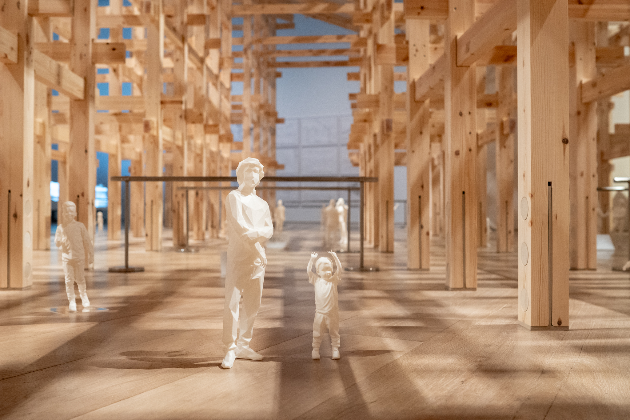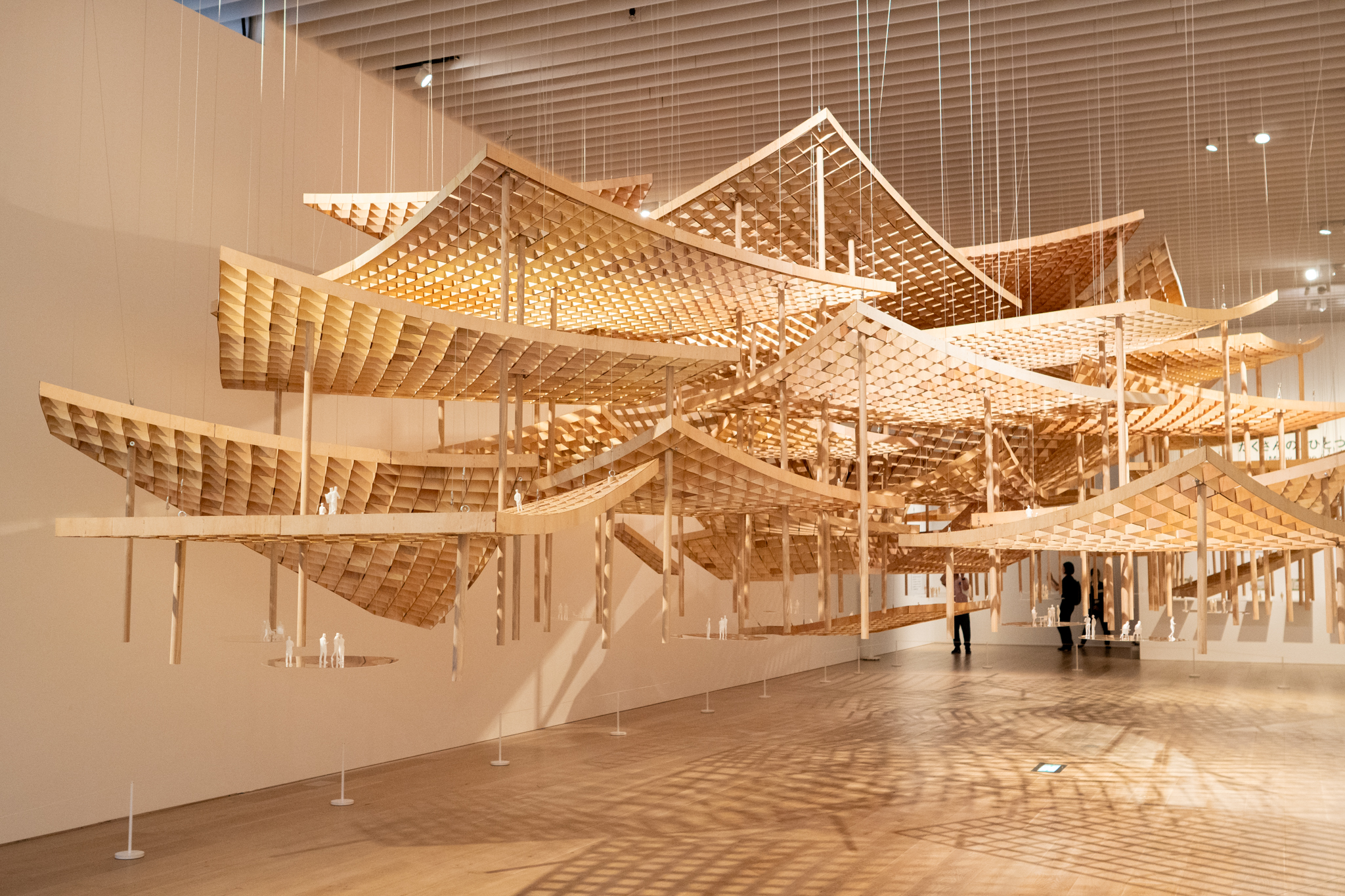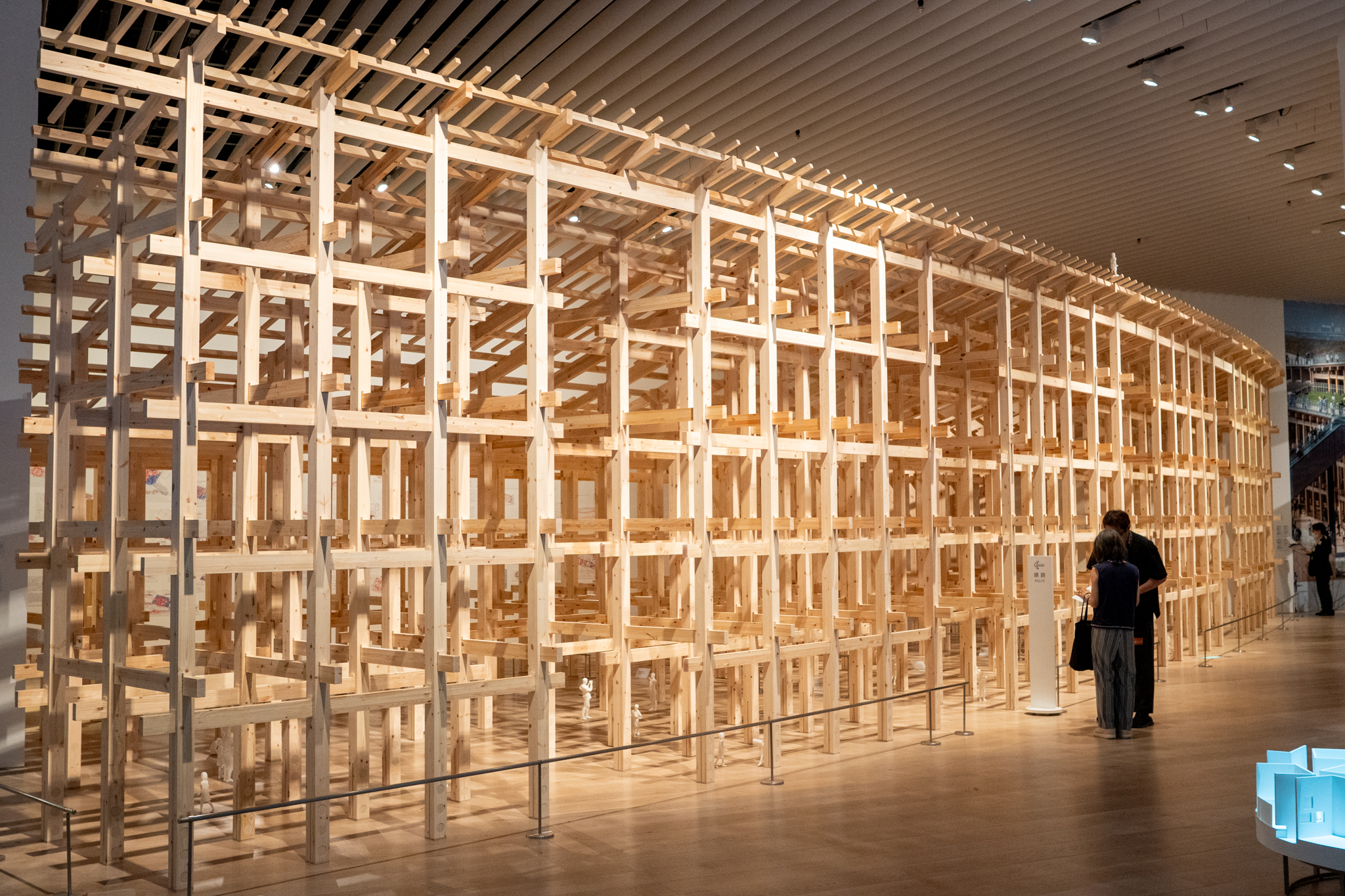 本展は、約30年のキャリアを網羅する初の大規模個展。初期作品から計画中のプロジェクトまで、模型や素材、アイデアの断片が「森」のように展示され、《大屋根リング》の5分の1スケールの部分模型も体験できる。