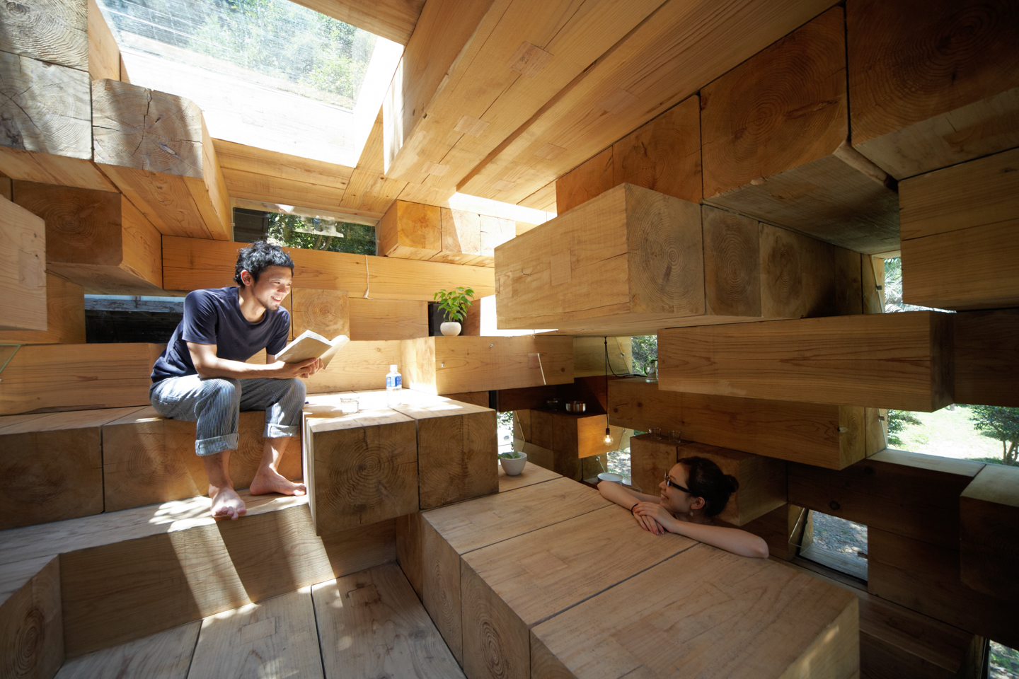 《ファイナル・ウッデン・ハウス》(2008、熊本)を設計する際、35cmの段差で空間を作るということを試しました。じつは家具を作るときのスケール体系と建築のスケール体系は連続しているんです。2段になったらちょうど机の高さになるのが良いと思い、1段の高さを35cmにしました。最初は透明感があるようにして、空間だけが浮いているように構想していたのですが、たまたまこのコンペで木を使った建物がお題になり、木材も全部支給してくれるという条件でした。これは2001年に構想した《プリミティブ・フューチャー・ハウス》の具現化になれると思い、制作しました。