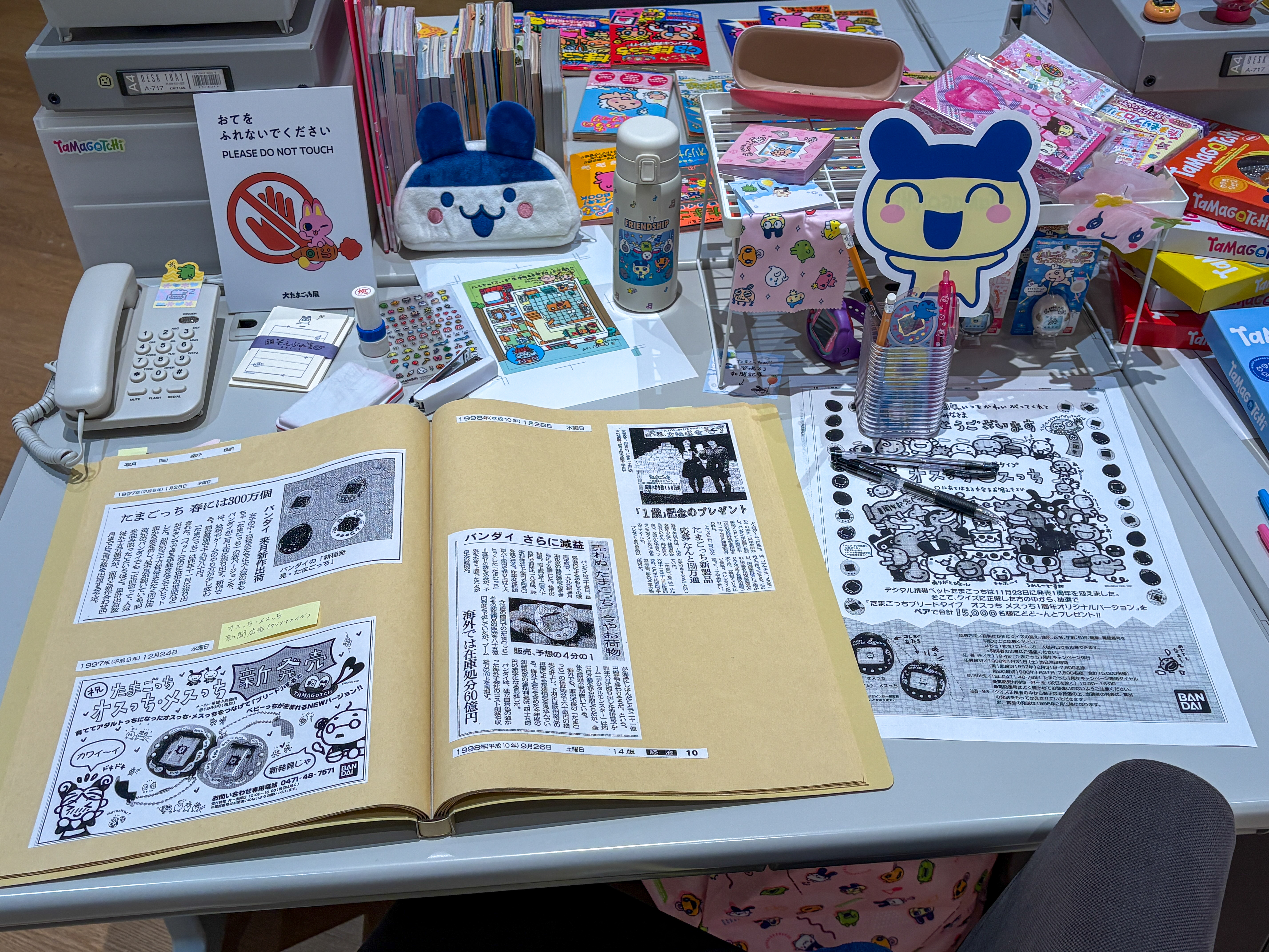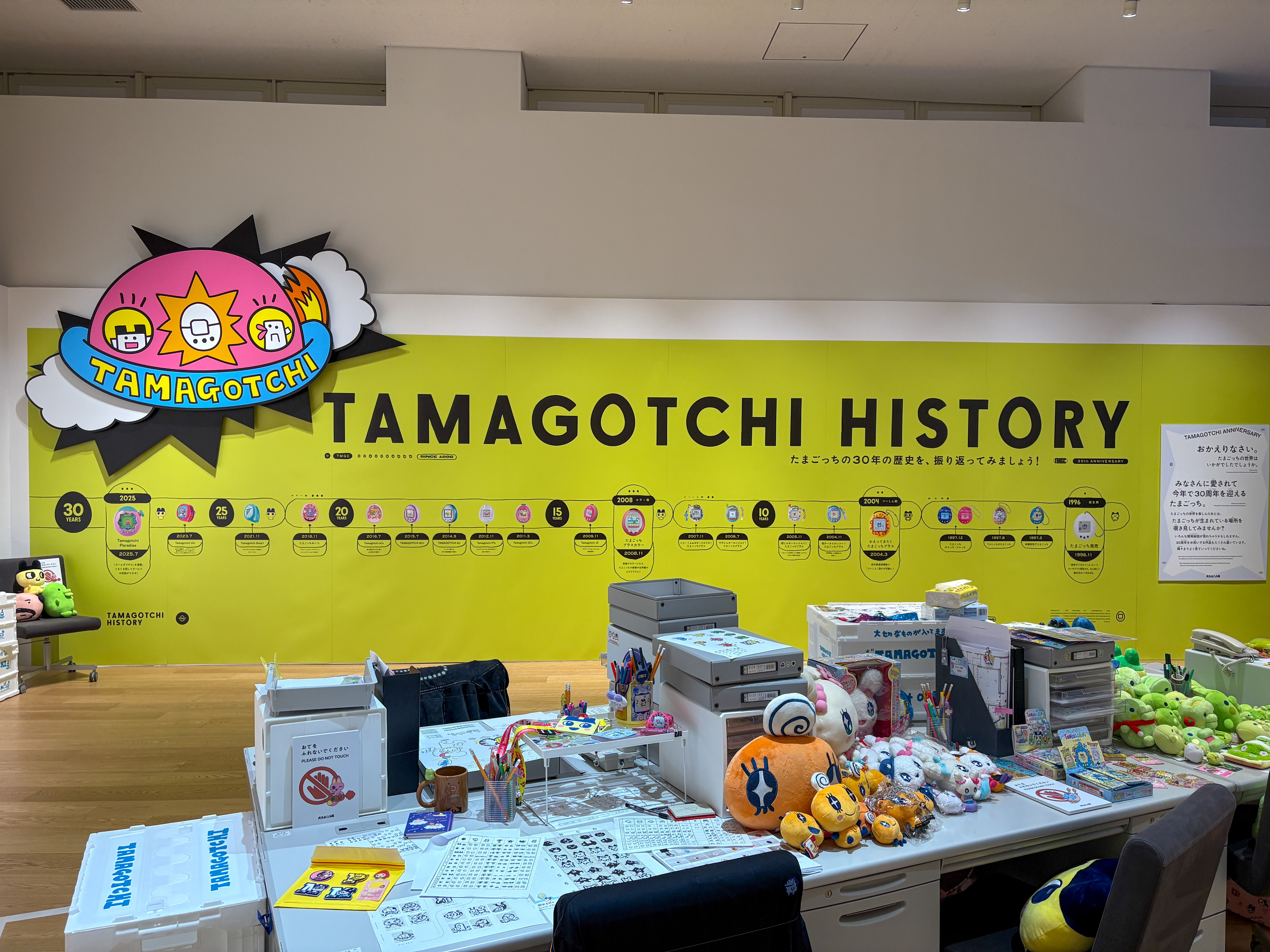 展覧会の最後を飾る「TAMAGOTCHI ANNIVERSARY」では、30年にわたるたまごっちの歩みを一望することができる。たまごっちの歴史を記した年表や、過去に発売された機種の一覧、開発秘話を示す資料などが並ぶ。