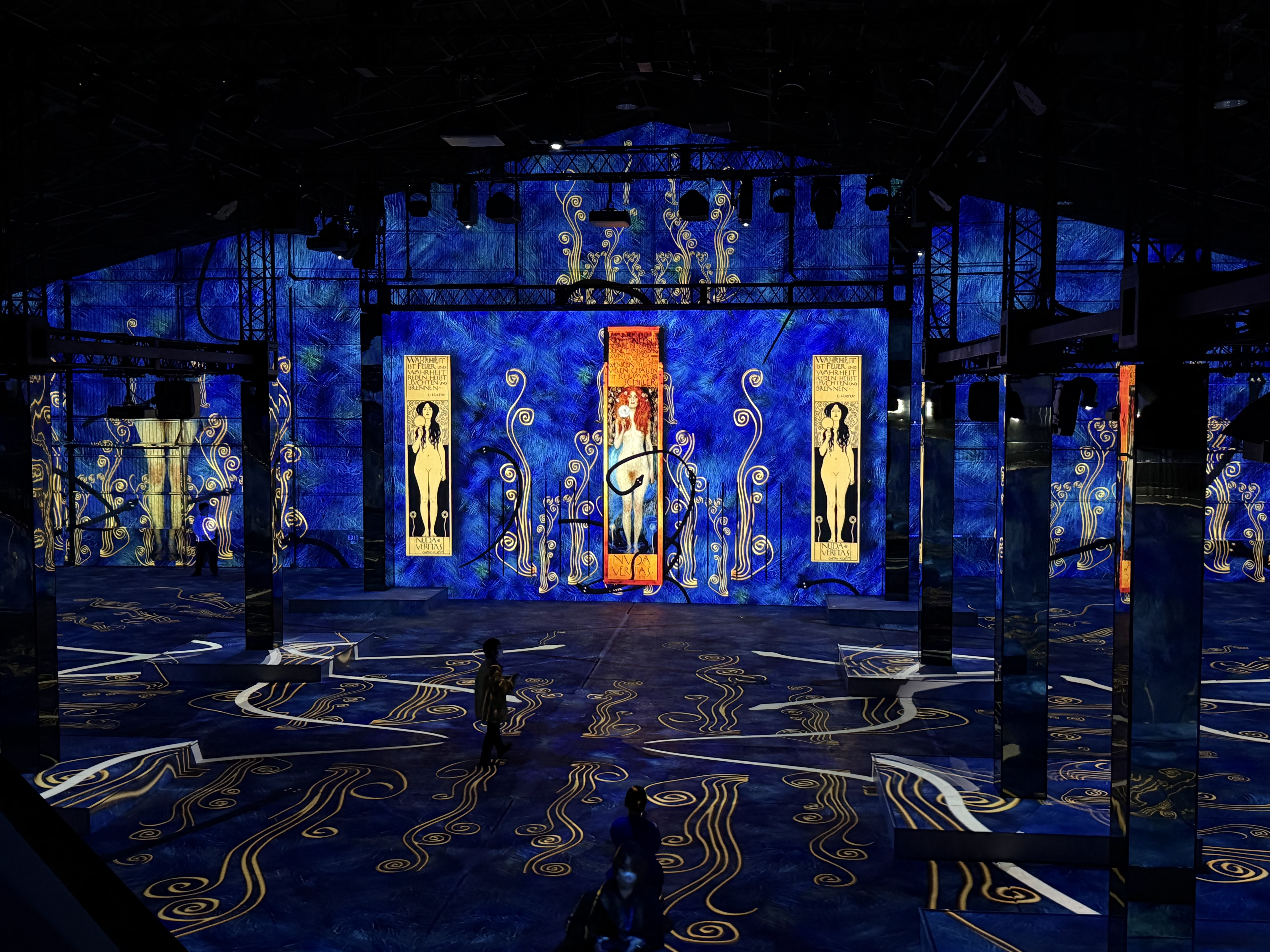 メイン展示を構成するのは、クリムトが描いた生命、愛、そして死という根源的なテーマ。40分におよぶプログラム「グスタフ・クリムト:黄金時代」だ。《接吻》や《ベートーヴェン・フリーズ》に代表される約170点の名作が、巨大な壁面や床一面を埋め尽くし、鑑賞者を「総合芸術」の渦へと引き込んでいく。特筆すべきは、クリムト独自の金箔の輝きと装飾美を、光の粒子として再解釈した映像演出だ。伝統的な絵画鑑賞ではとらえきれなかった、麗しくも官能的なディテールが重厚な音楽と掛け合わされ、鑑賞者の身体感覚へと直接訴えかけてくる。