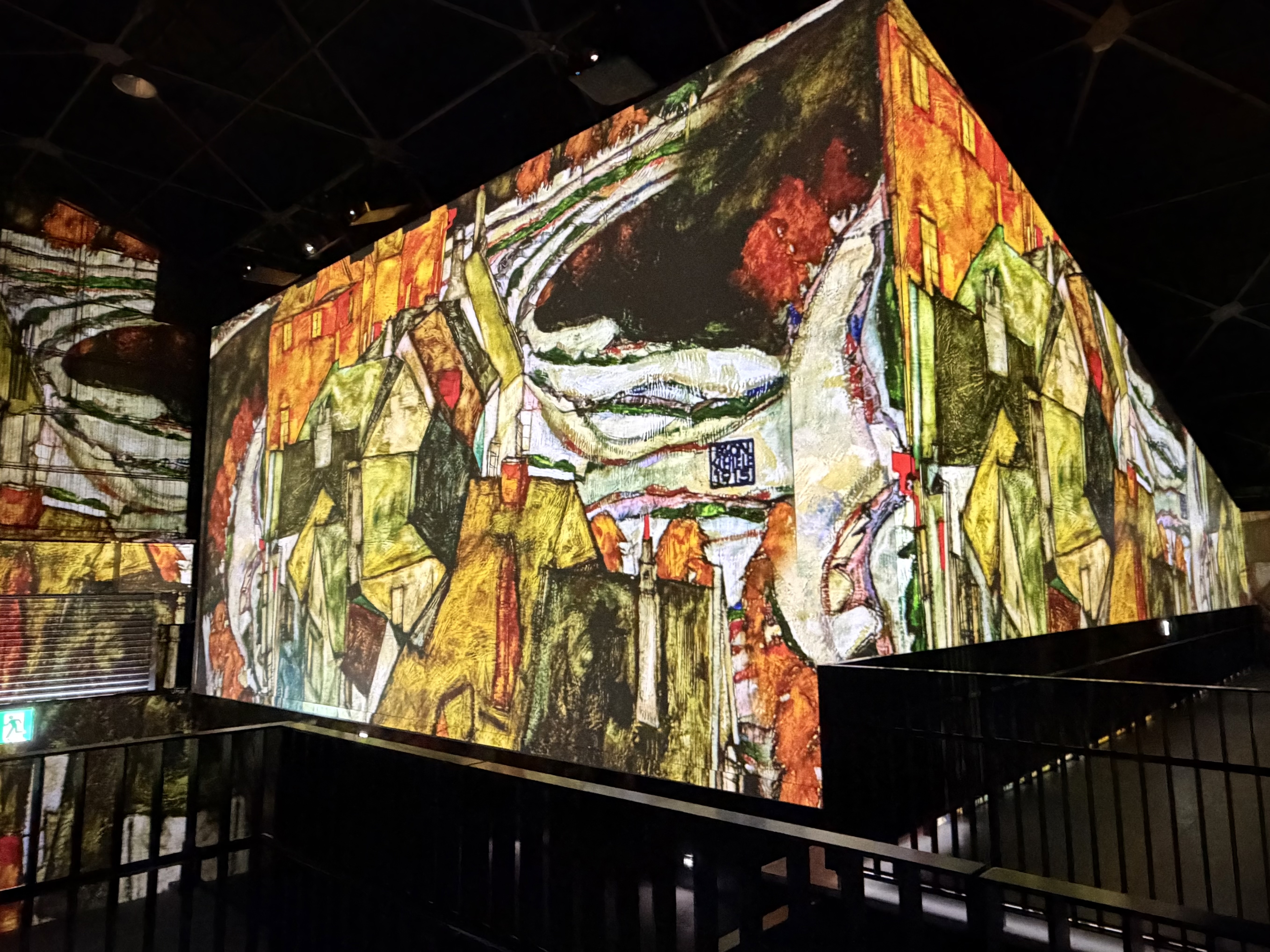クリムトの黄金の世界に続いて展開されるのは、12分間のプログラム「エゴン・シーレ:黄金の影で」。このスペシャルセクションでは、世紀末ウィーンの「影」を象徴するエゴン・シーレにスポットを当てる。クリムトから影響を受けつつも、やがて装飾美とは対局にある、人間の内面的な不安や孤独を剥き出しの線で描く独自の表現主義を確立したシーレ。最新のテクノロジーは、ねじれた肉体や凍りついた表情、そして荒々しい筆致をダイナミックに増幅させる。それはシーレが抱いた生存の重みや心理的緊張を、空間全体の切実な空気感として視覚化していく。