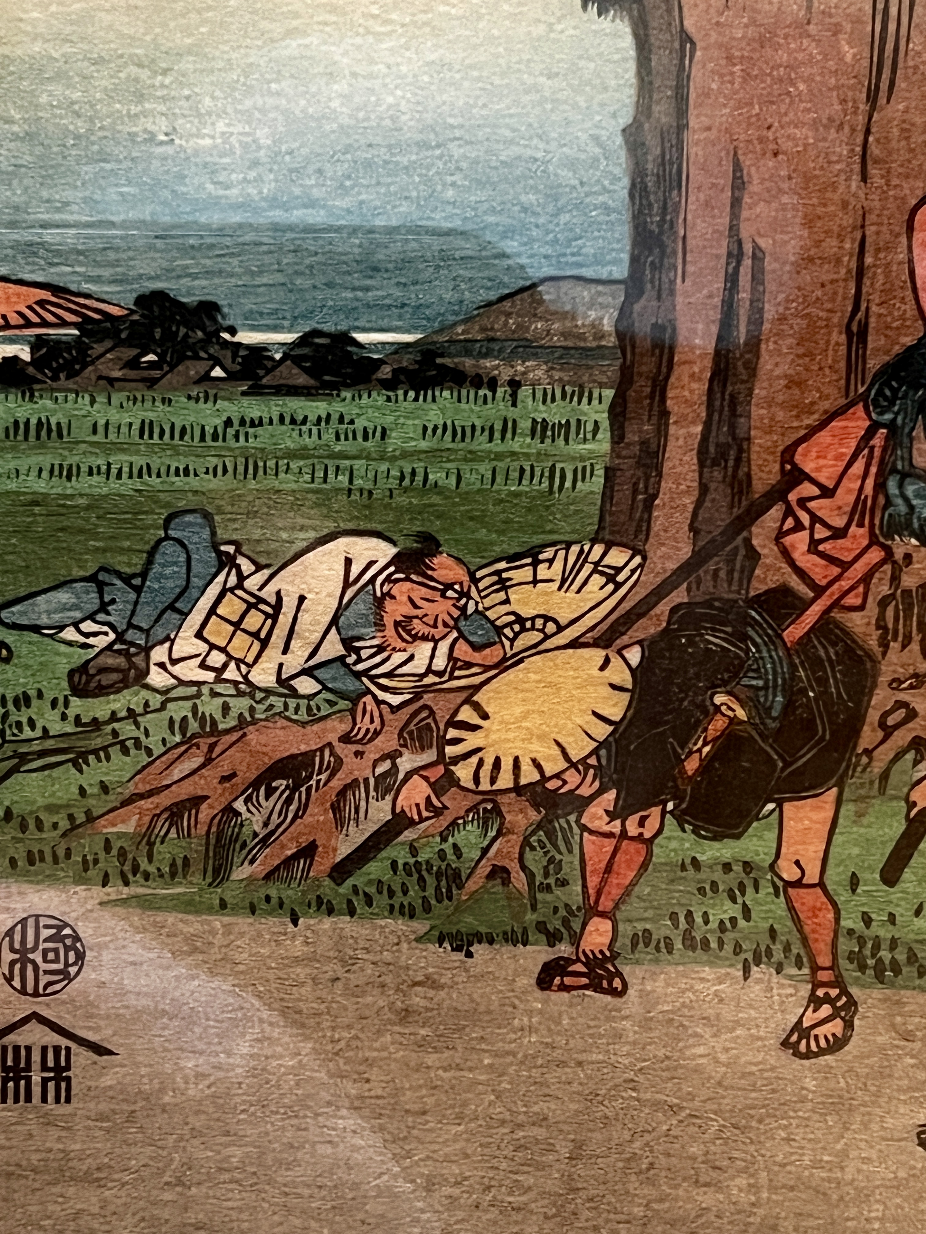 「広重の浮世絵では、風景の背景にいる人物が個性豊かで、誰ひとりとして手抜きがありません。おじさんたちはいわゆるモブ、背景の人物ですが、そこに注目することで、(鑑賞者は)絵をより詳細に見るようになる。