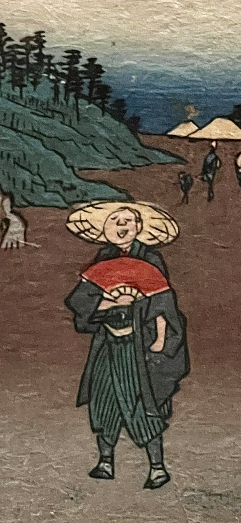 「扇子持ってぷらぷら歩いていますが、荷物は持っていないので、旅人ではなさそう。とてもにこやかな顔で、歌でも歌っているのかな。まずこのおじさんがすごくいいなと思うんですが、右手にはかごに乗ろうとしている人や、左にはお餅を食べようとしている人もいて、様々なドラマが小さくいろいろなところに描き込まれている。見逃せる場所が全然ないんです」(渡邉)