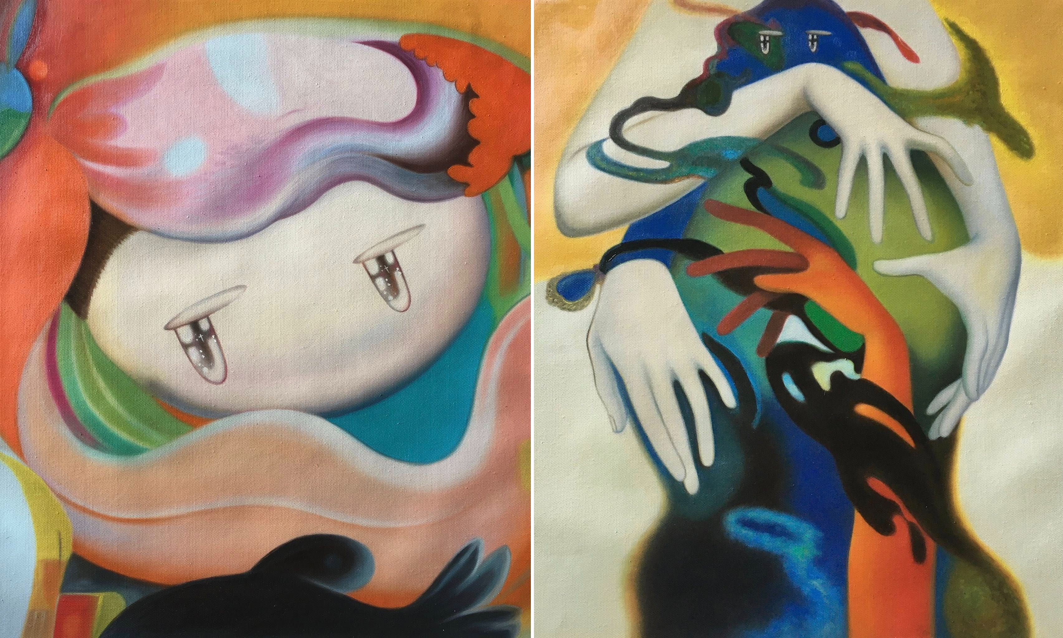 本展では、これまで描き上げた絵画8点を中心に、ドローイングやオリジナルの着物作品などを展示。